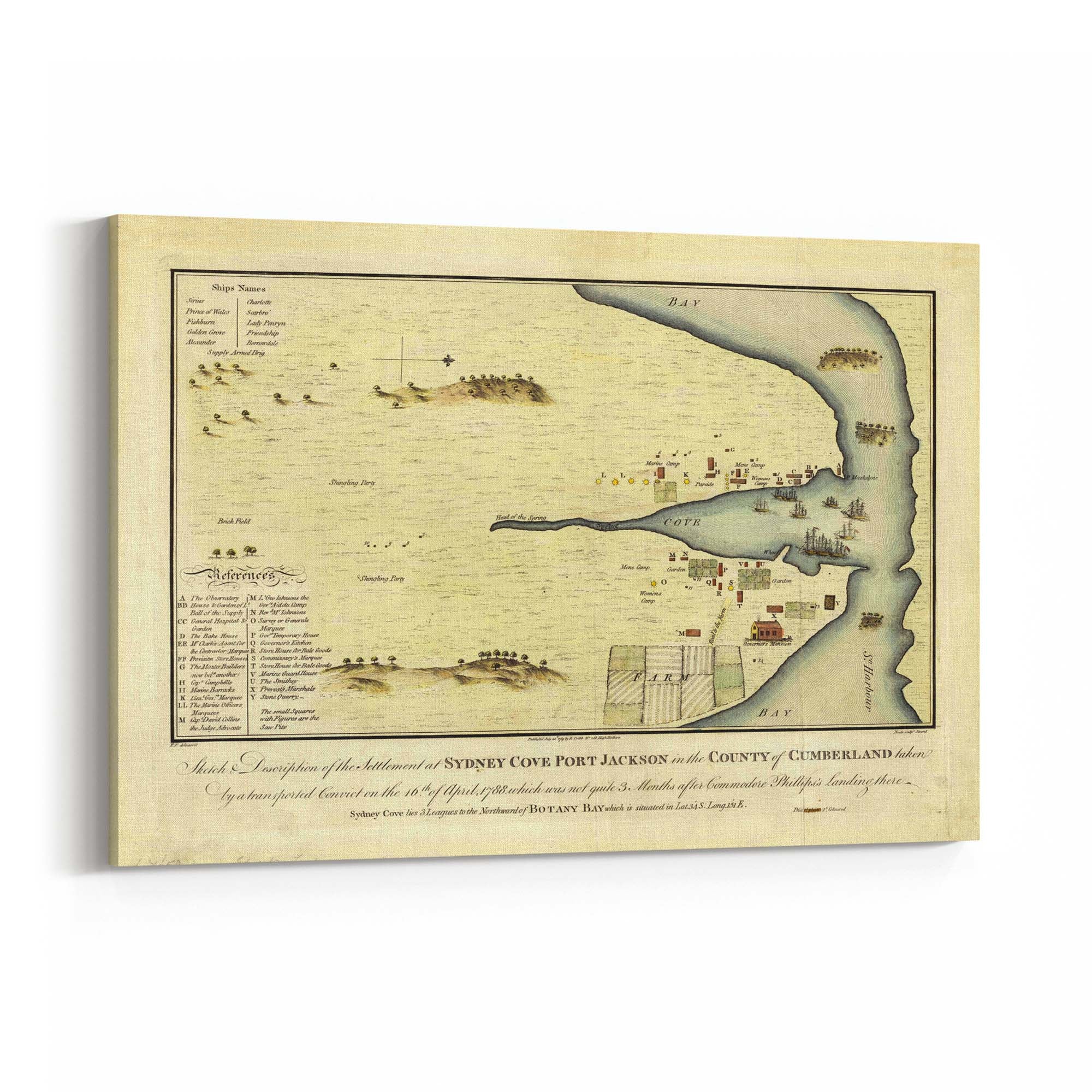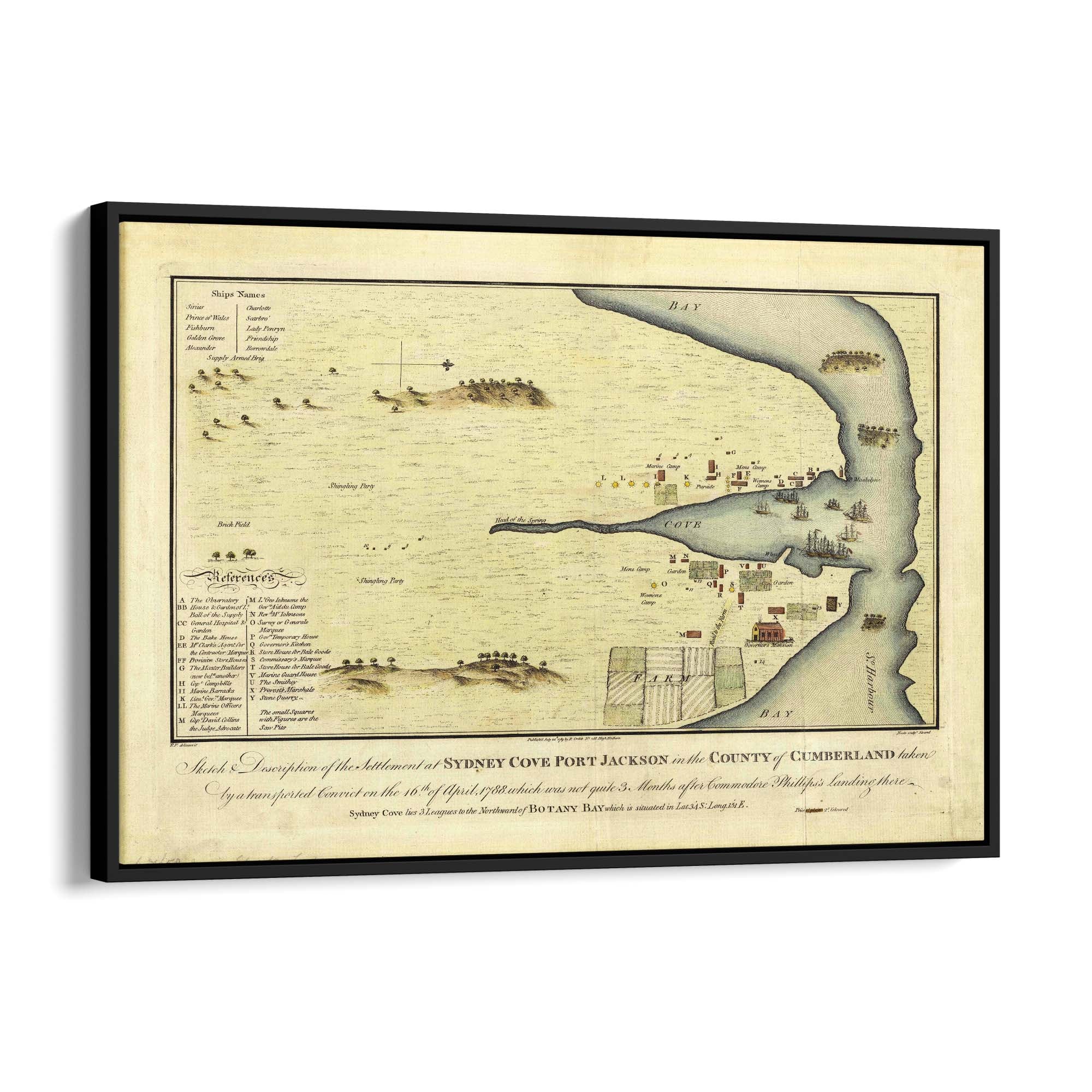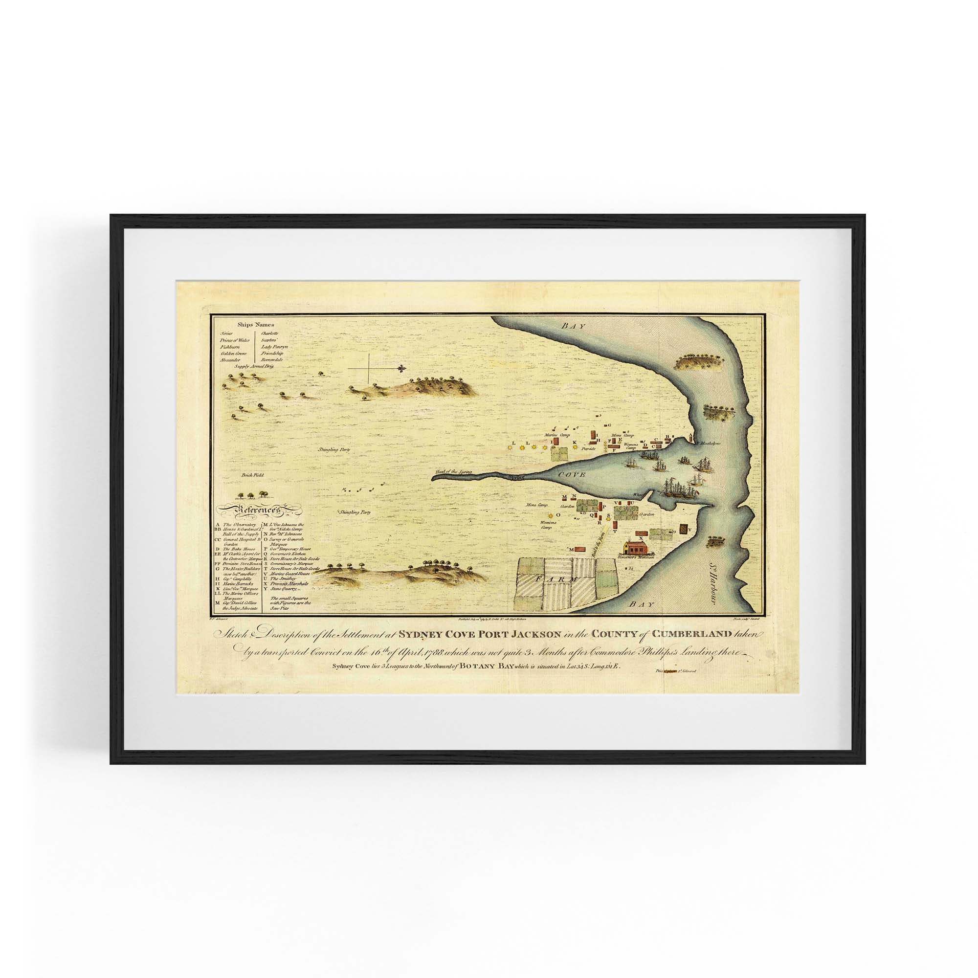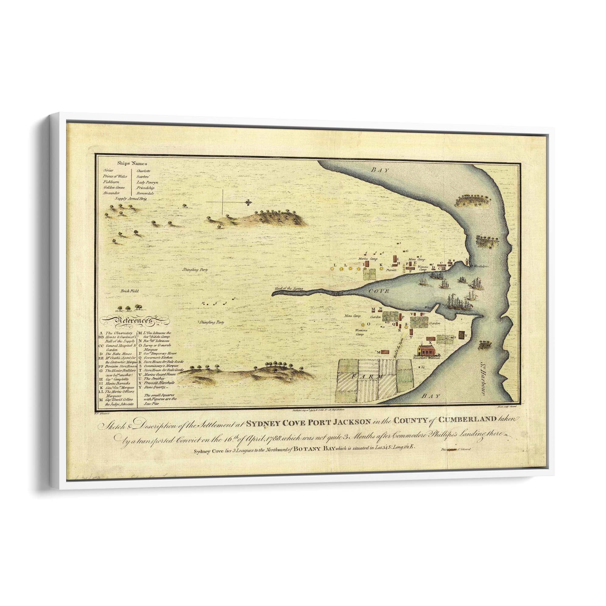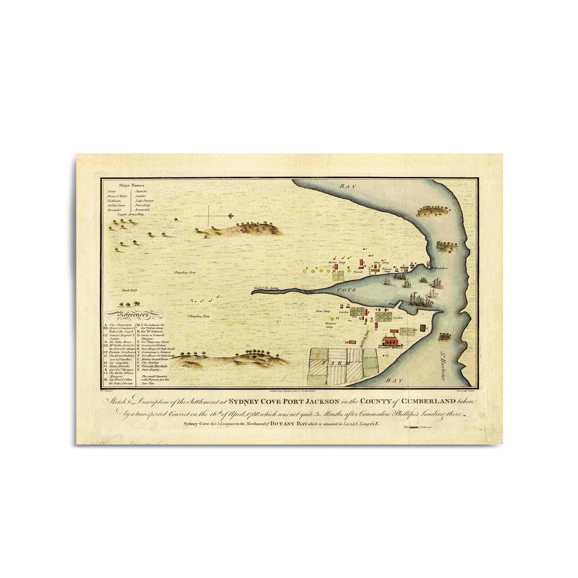 Sketch & description of the settlement at Sydney Cove Port Jackson in the County of Cumberland taken by a transported convict on the 16th of April, 1788, which was not quite 3 months after Commodore Phillips's landing there.