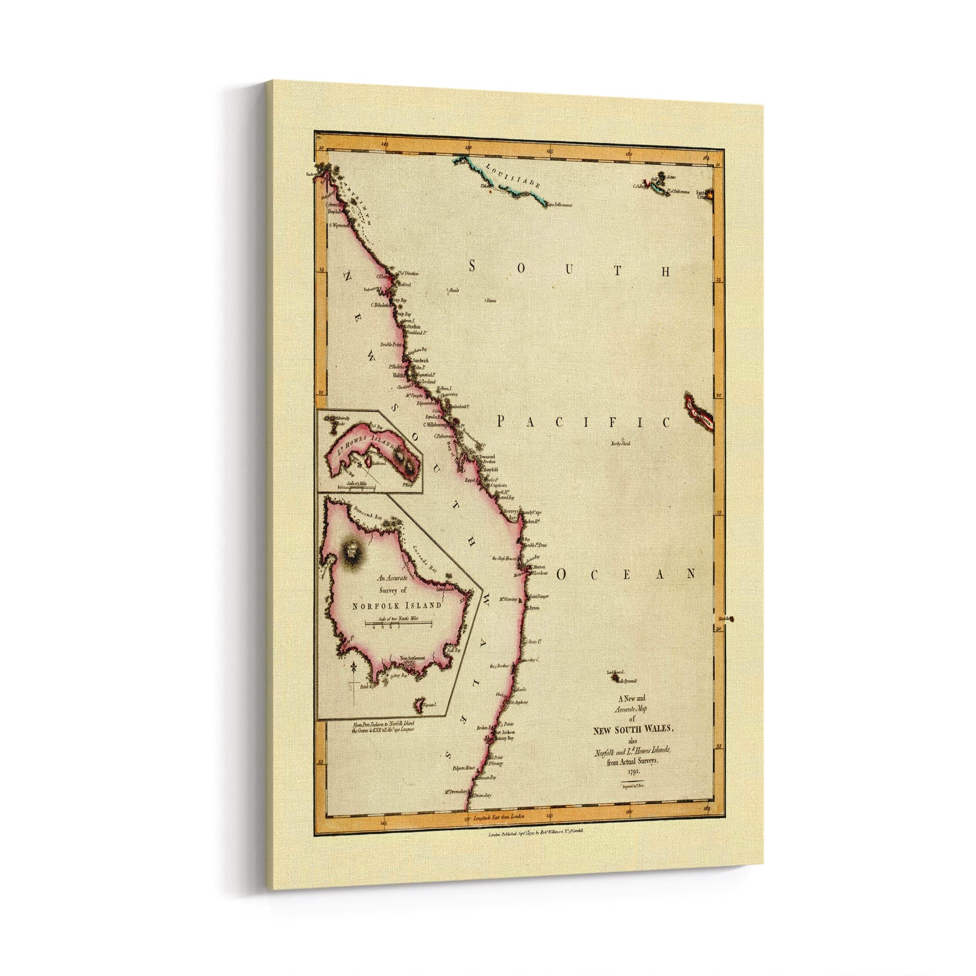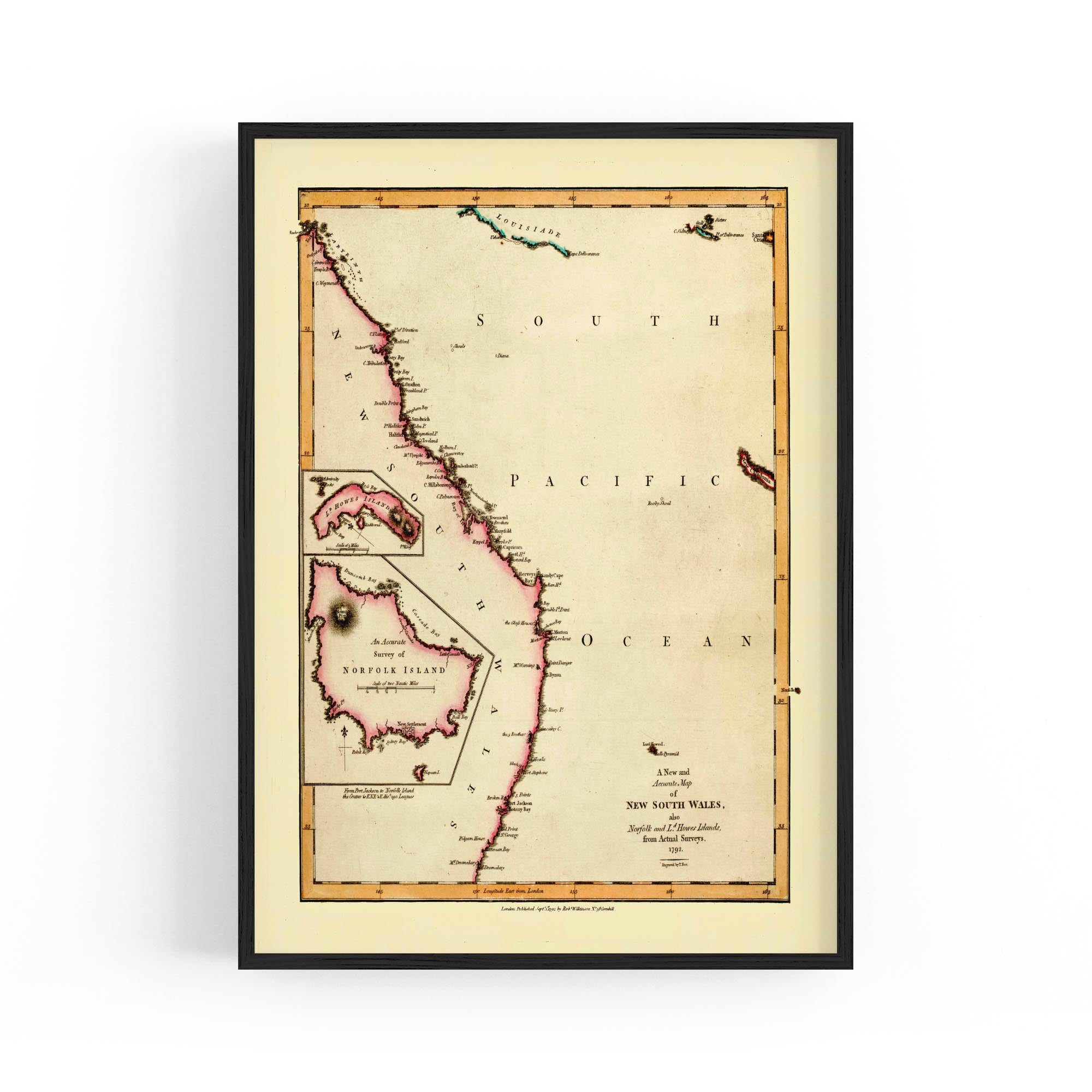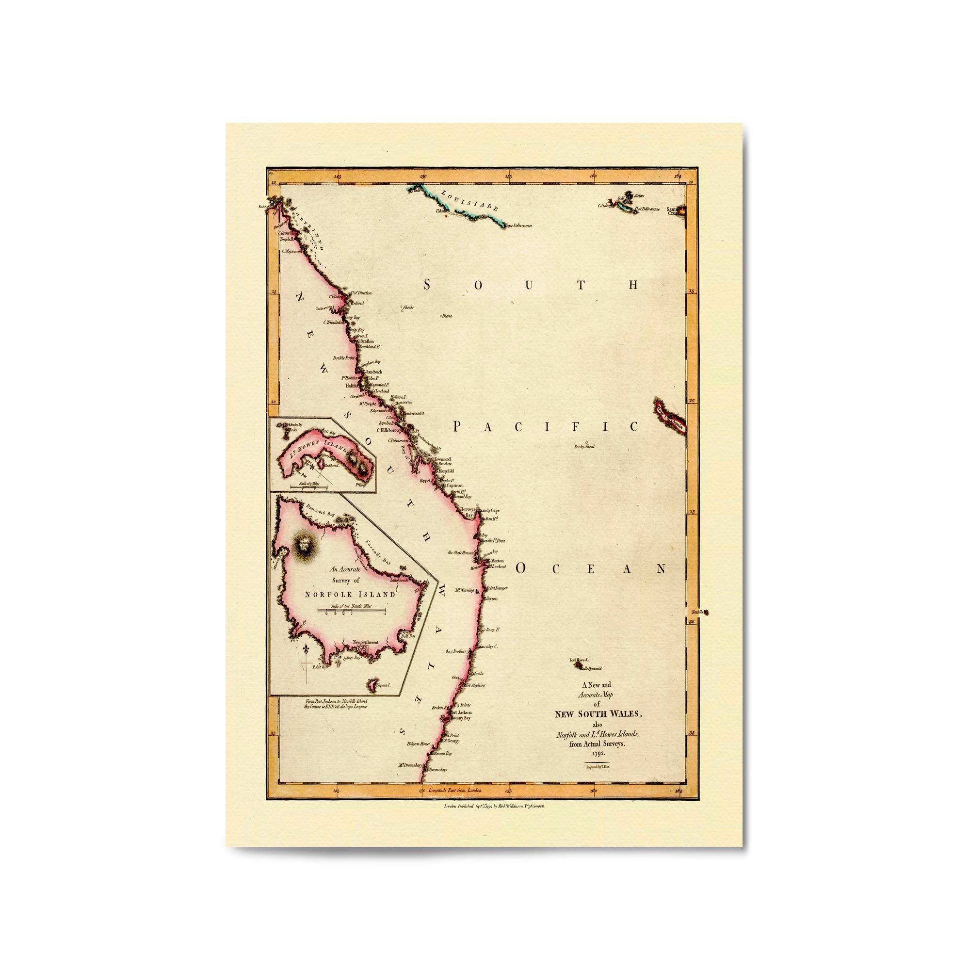 Map of the east coast of Australia with islands of Norfolk, Lord Howe, and New Caledonia. Relief is shown by hachures.