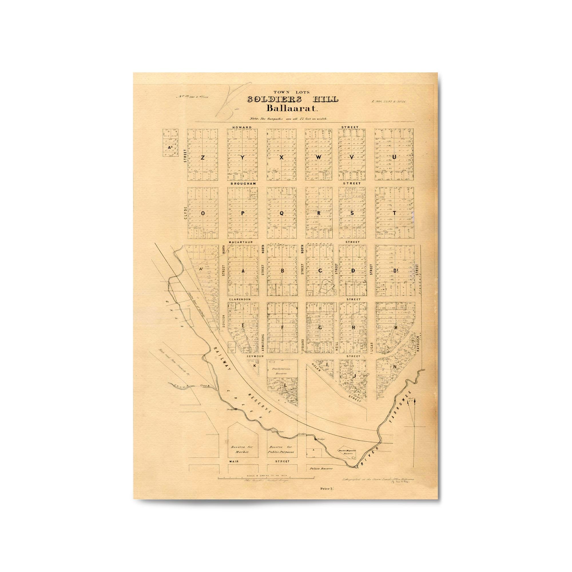 Town lots, Soldiers Hill, Ballaarat. John Carruthers, Assistant Surveyor. Lithographed at the Crown Lands Office, Melbourne (by James B. Philp).