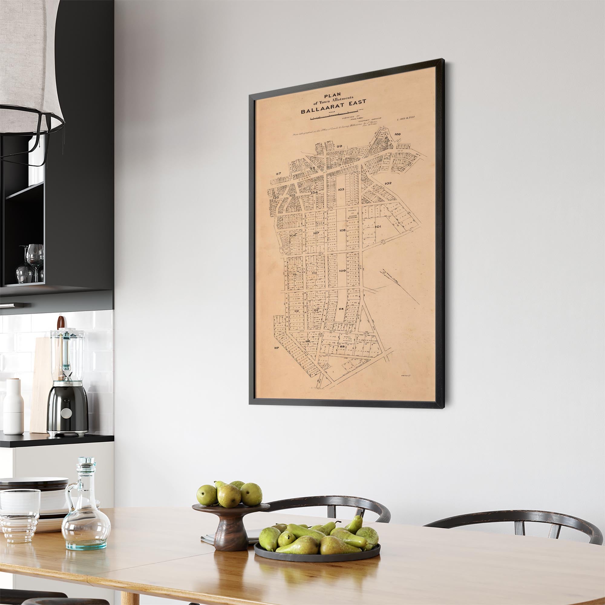 Recently moving to Harcourt and being interested in the history of the area, it seemed fitting to purchase a vintage map of the area which is displayed on our kitchen wall for us to study easily, identifying the block of land we bought. Nicely framed too.