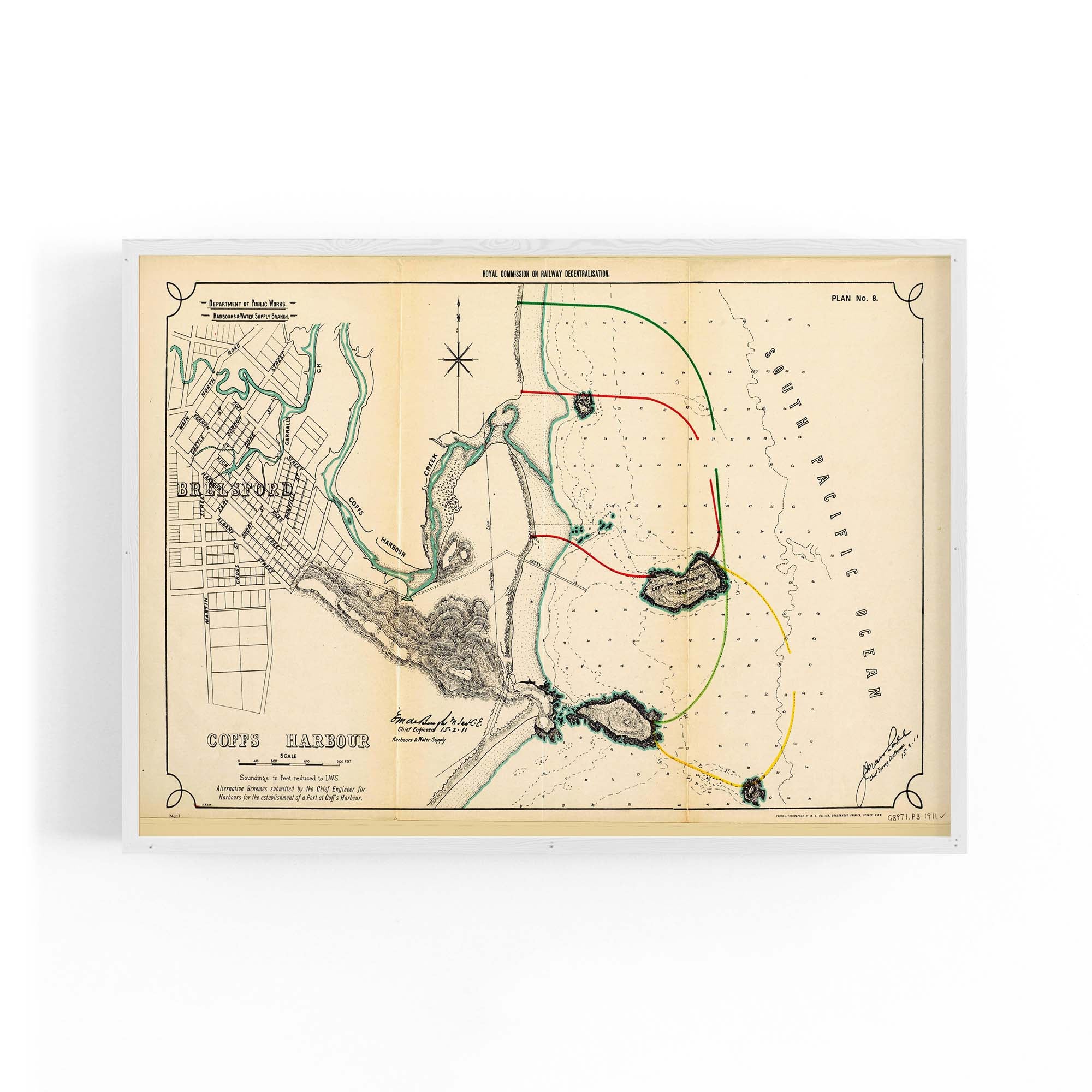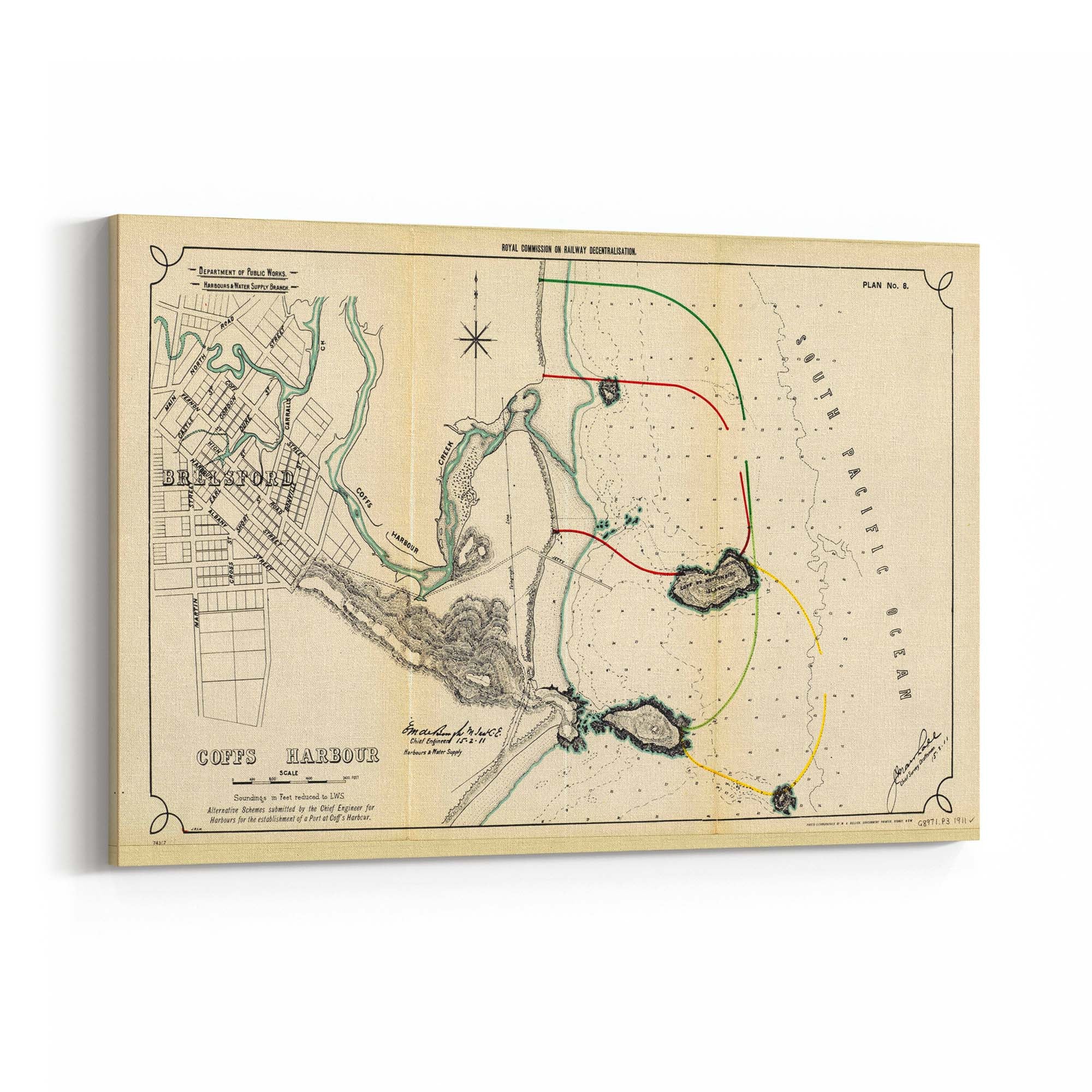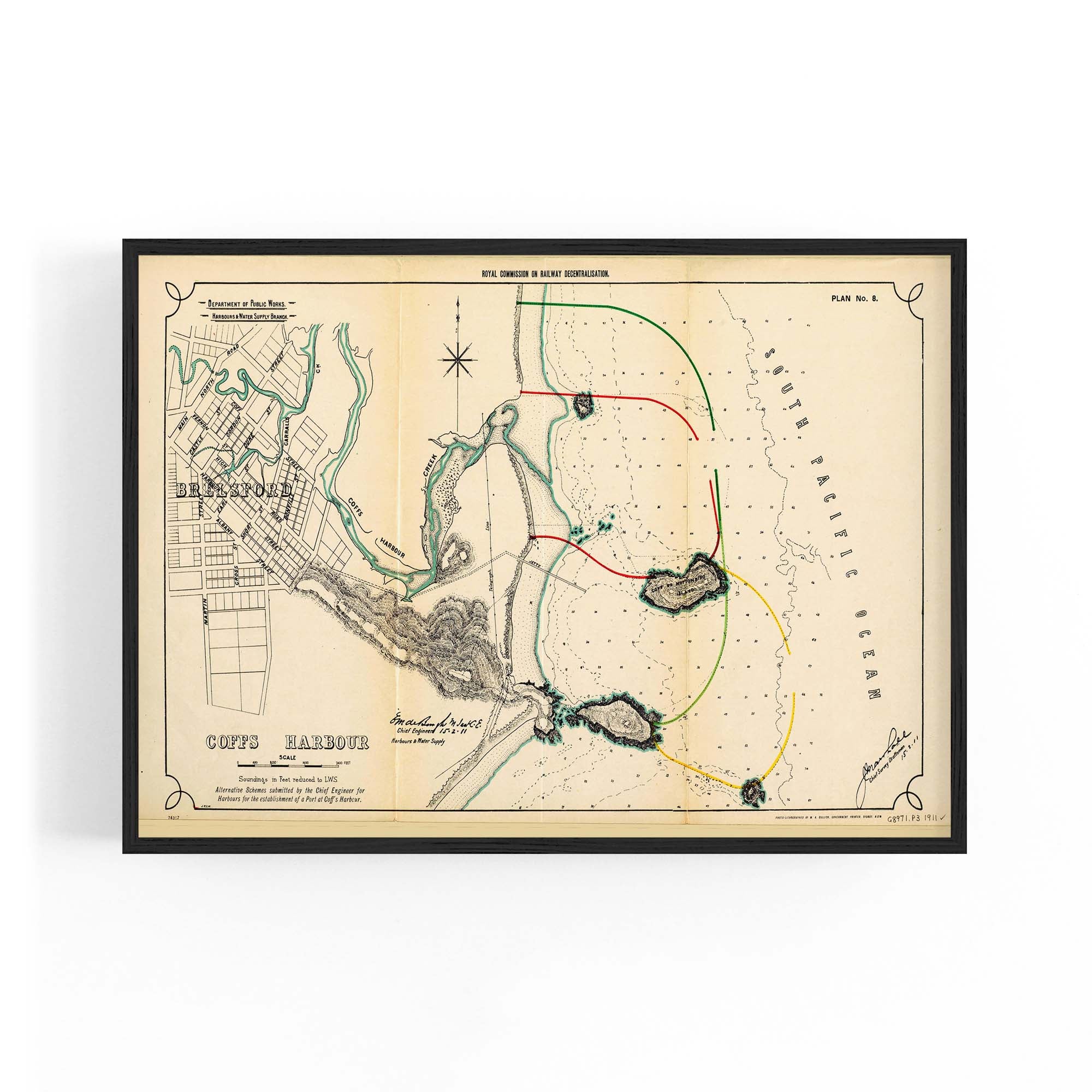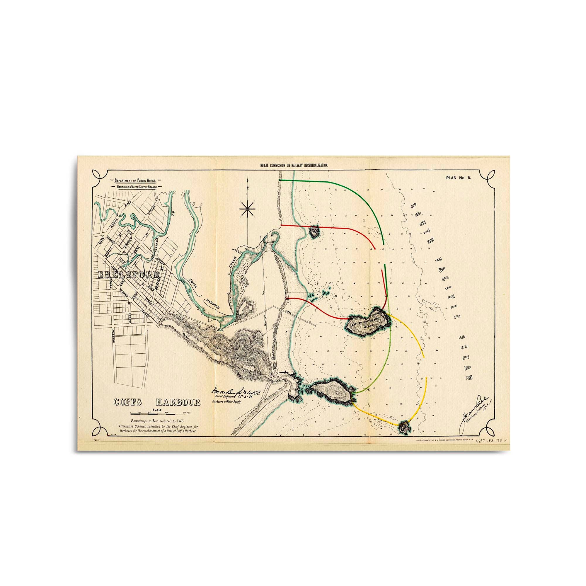 Coffs Harbour. Map showing a proposed plan for a port at Coff's Harbour. Relief is shown by hachures. Depth is shown by soundings.