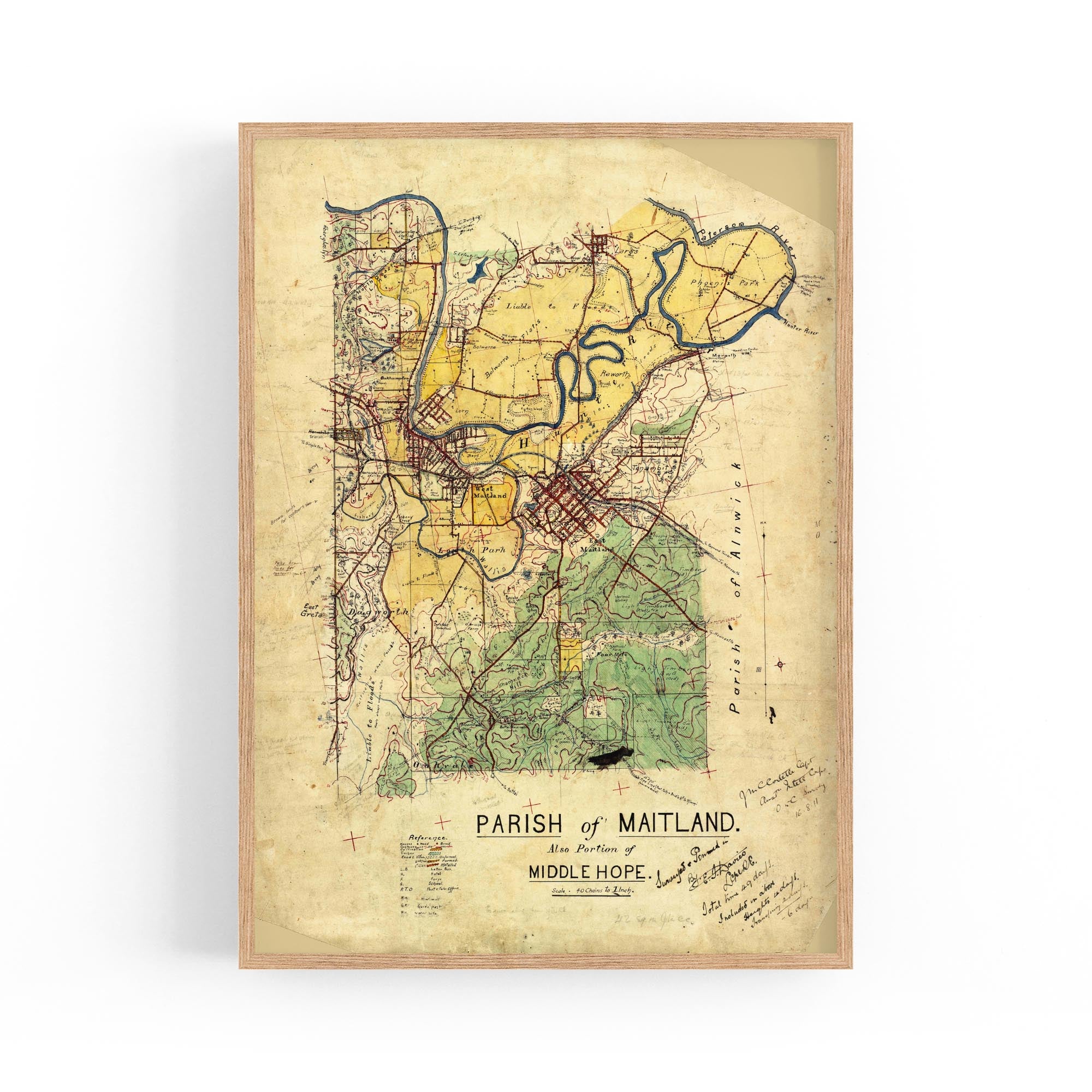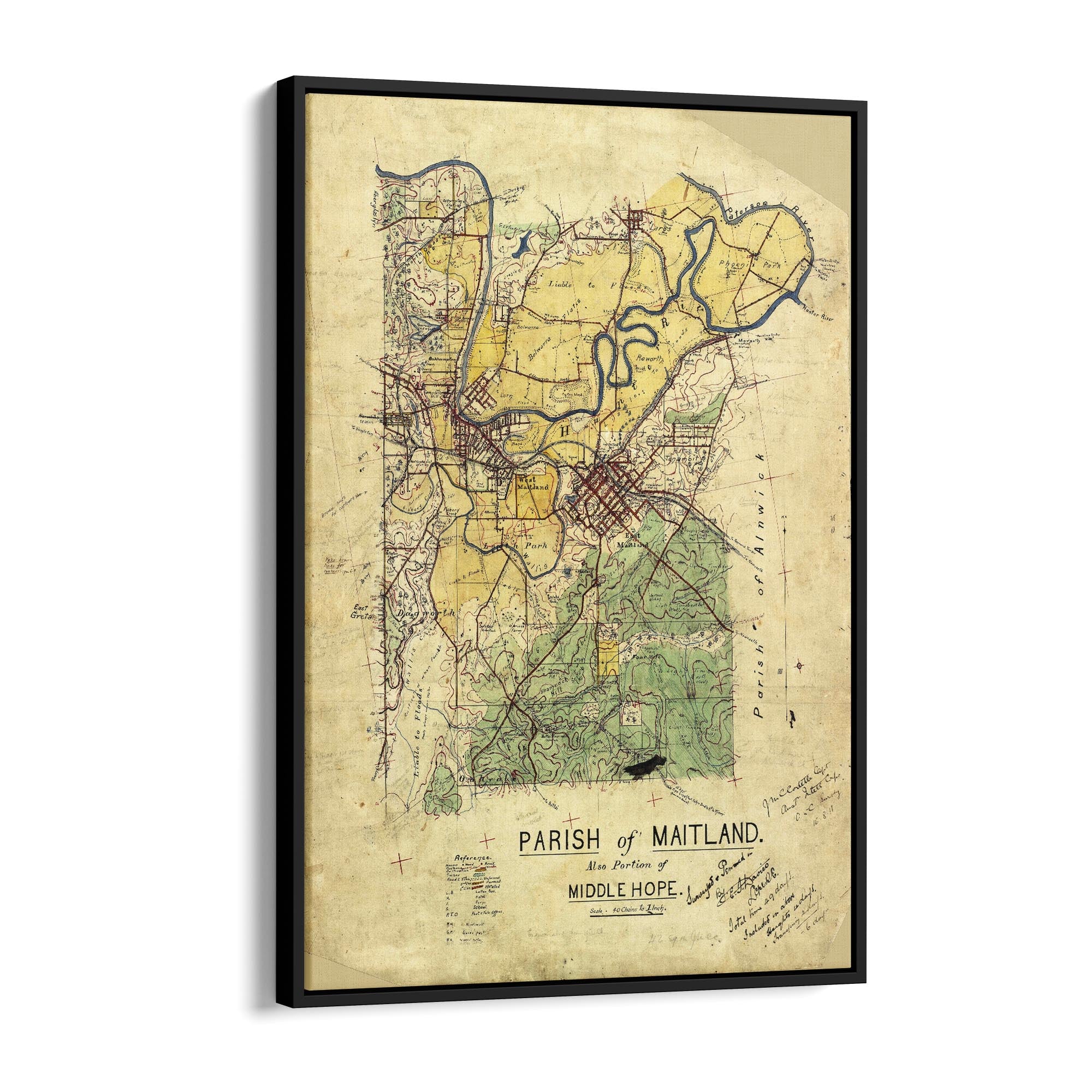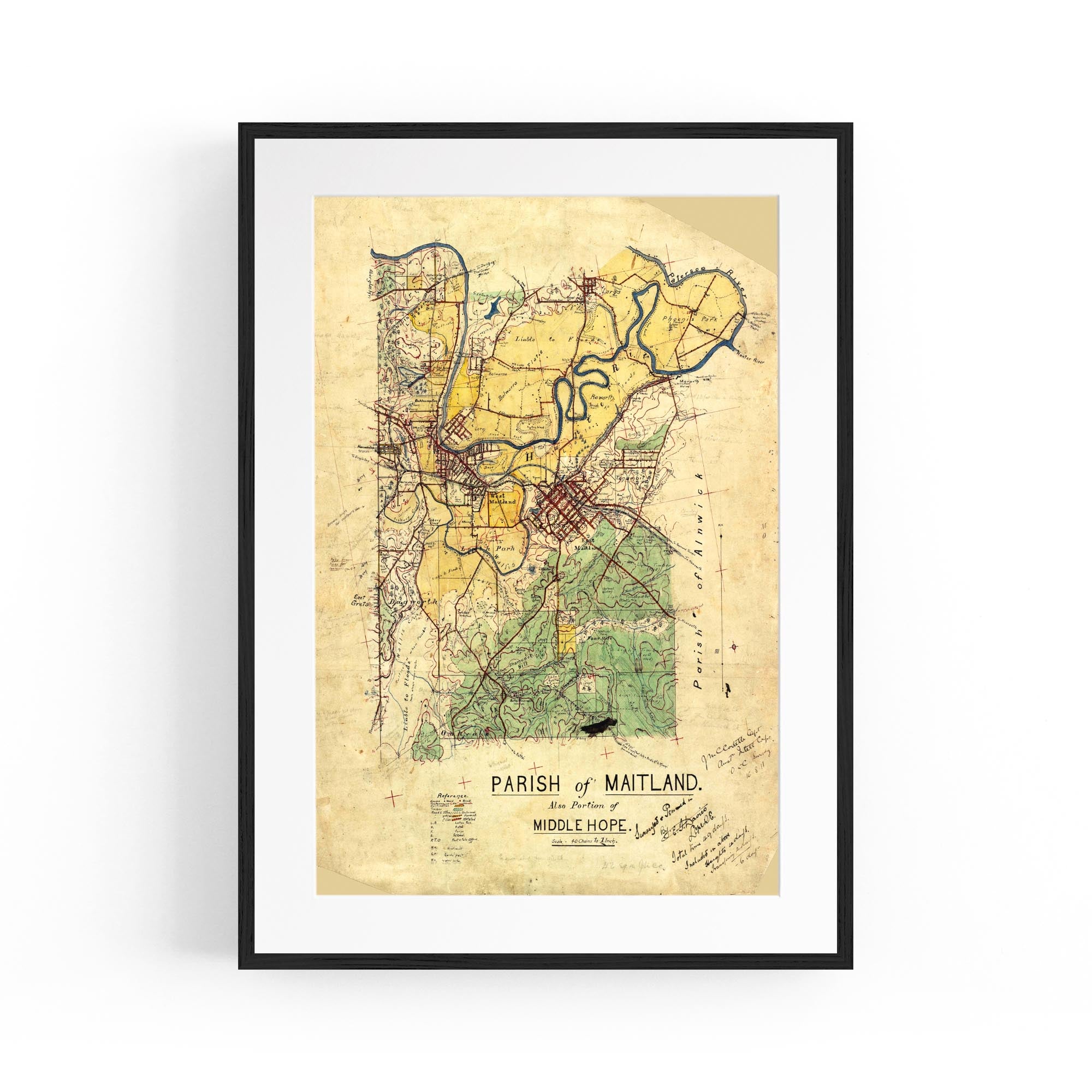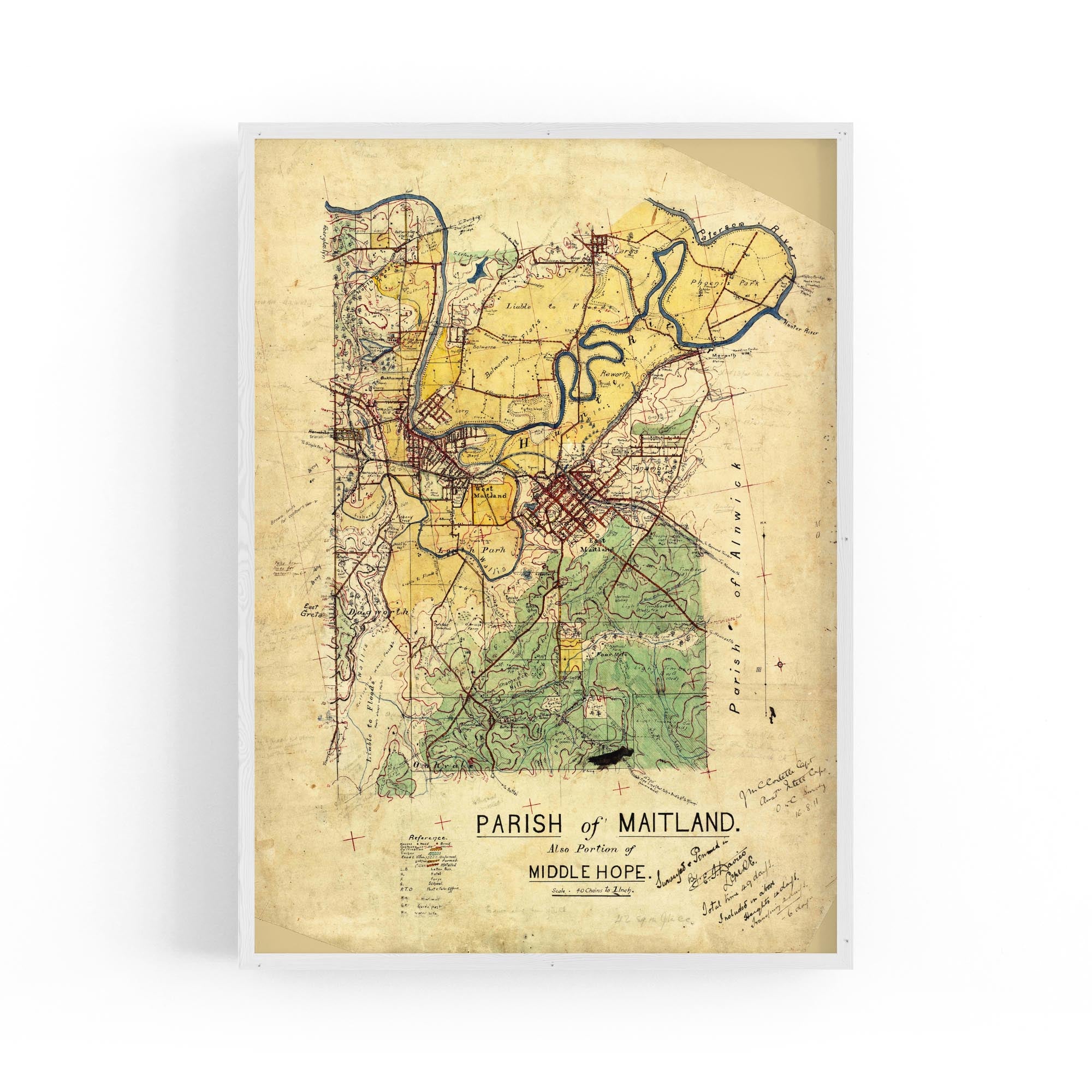 Manuscript plane table survey map, with some cadastral information, of Parishes of Maitland and Middle Hope [i.e. Middlehope], New South Wales.