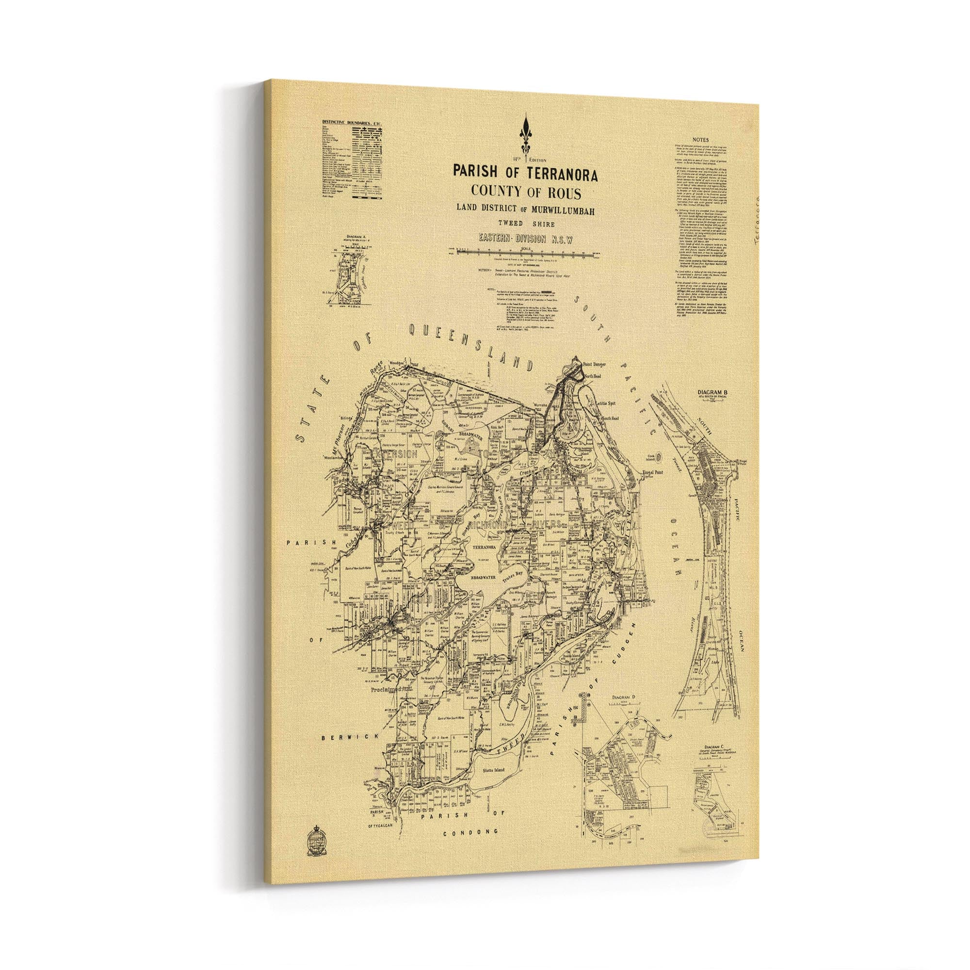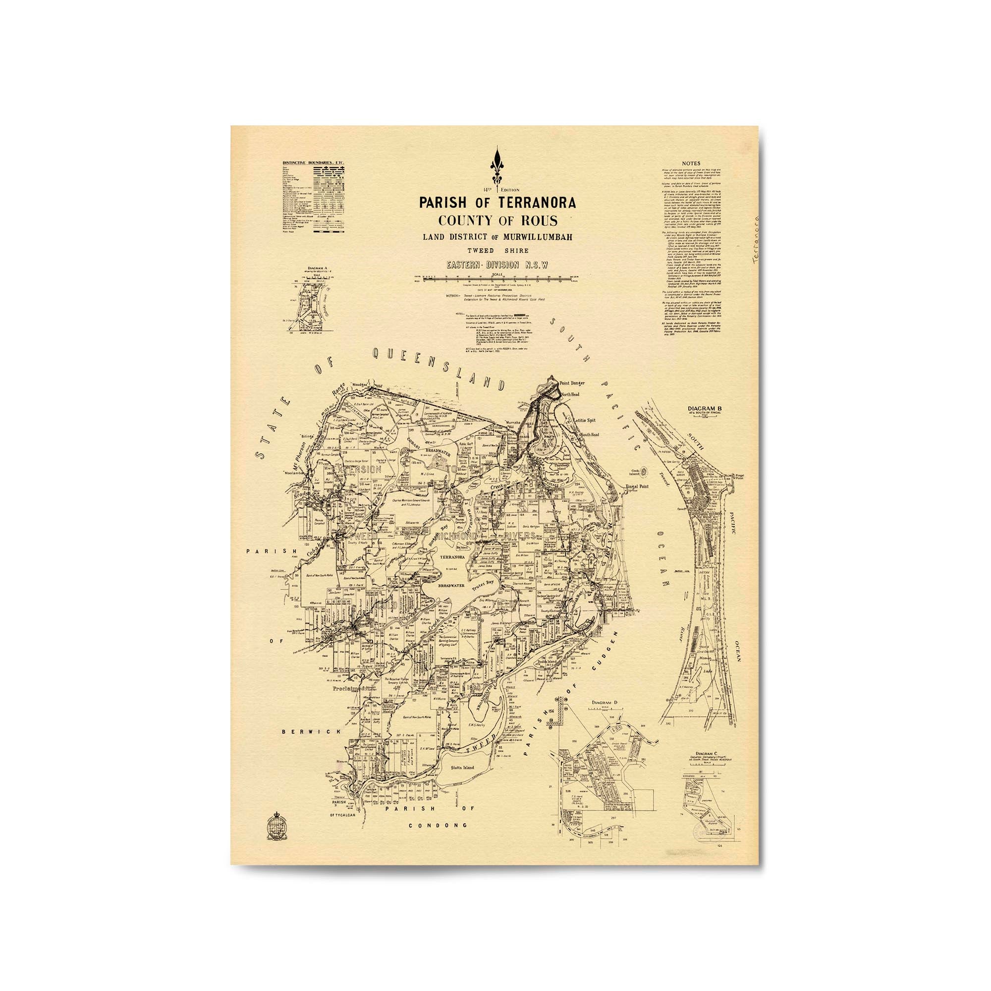 Parish of Terranora, County of Rous Cadastral map showing parish boundaries and land holdings. Relief is shown by hachures.