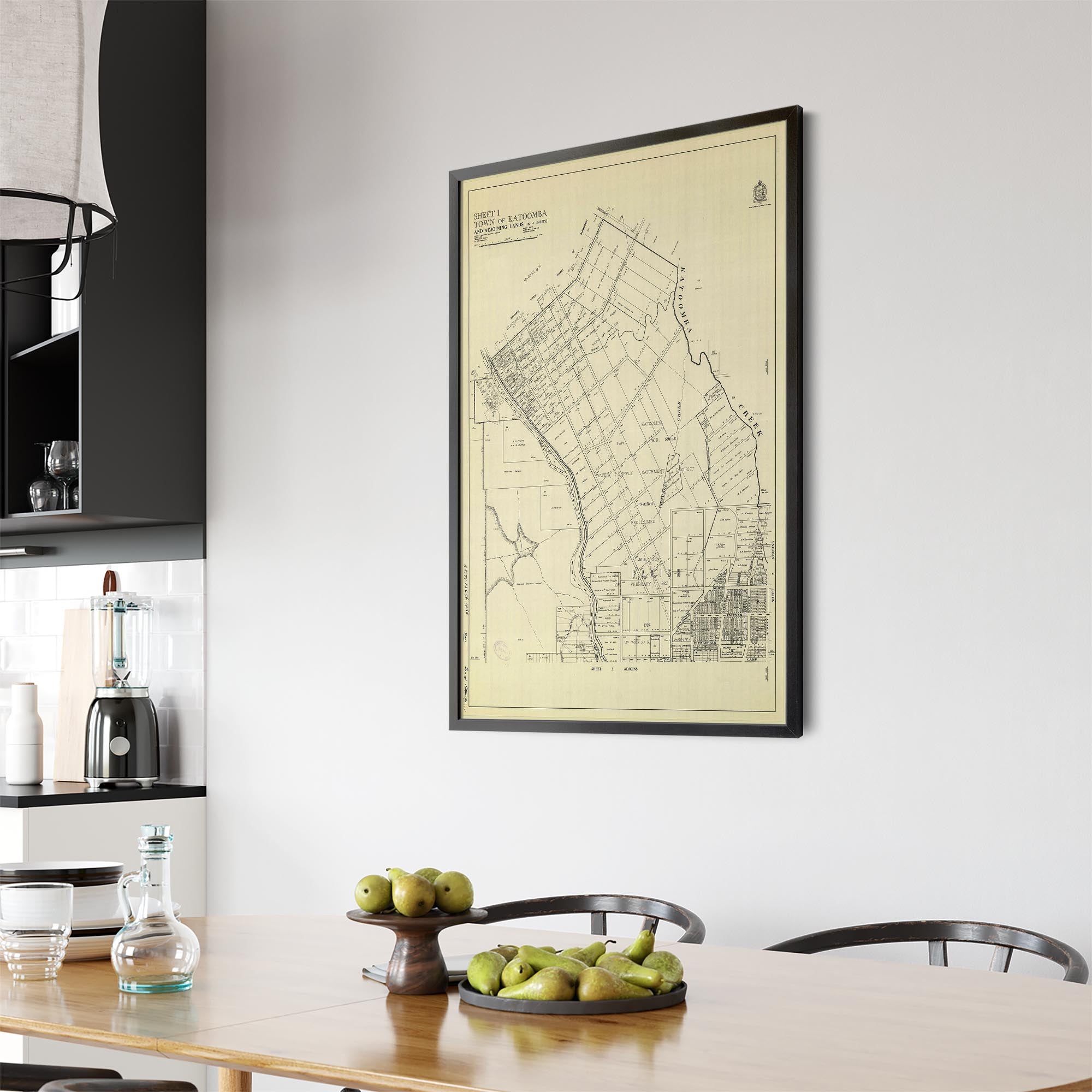 Recently moving to Harcourt and being interested in the history of the area, it seemed fitting to purchase a vintage map of the area which is displayed on our kitchen wall for us to study easily, identifying the block of land we bought. Nicely framed too.