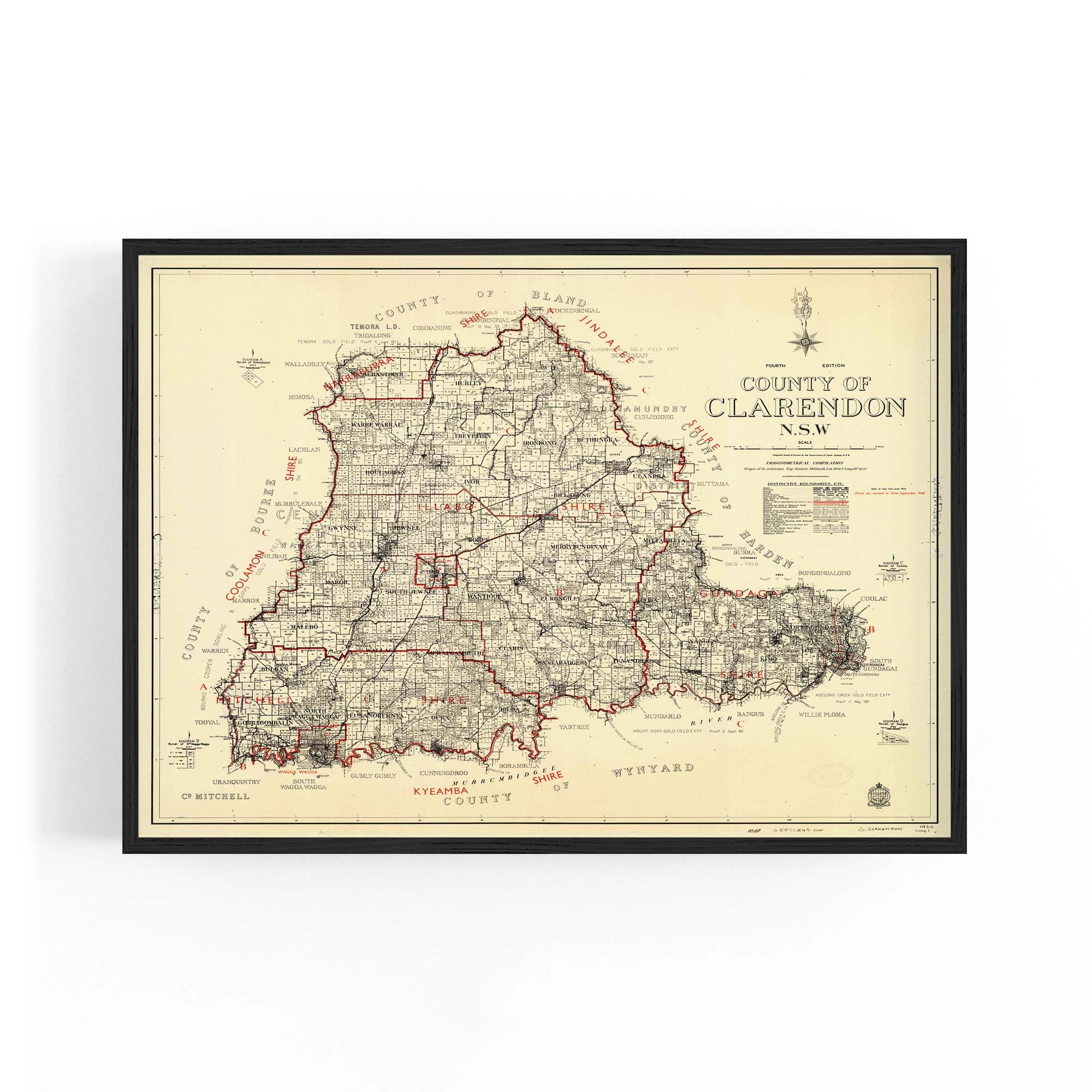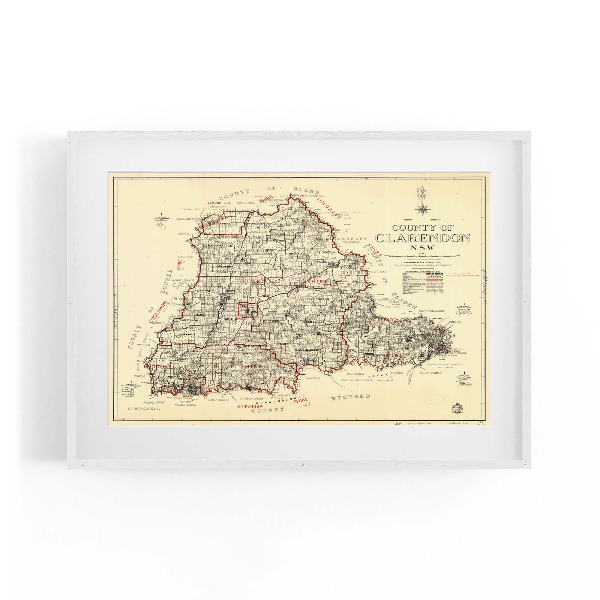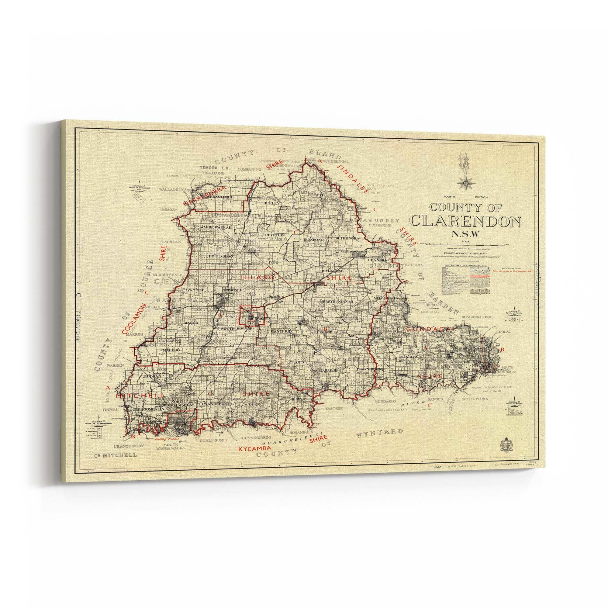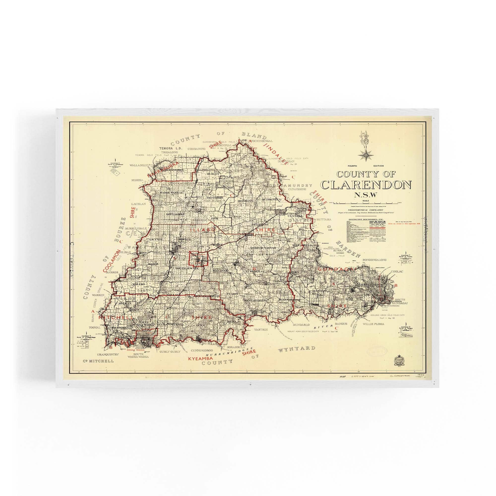 County of Clarendon, New South Wales. Cadastral map showing county and parish boundaries with shire boundaries overprinted in red. Relief is shown by hachures.