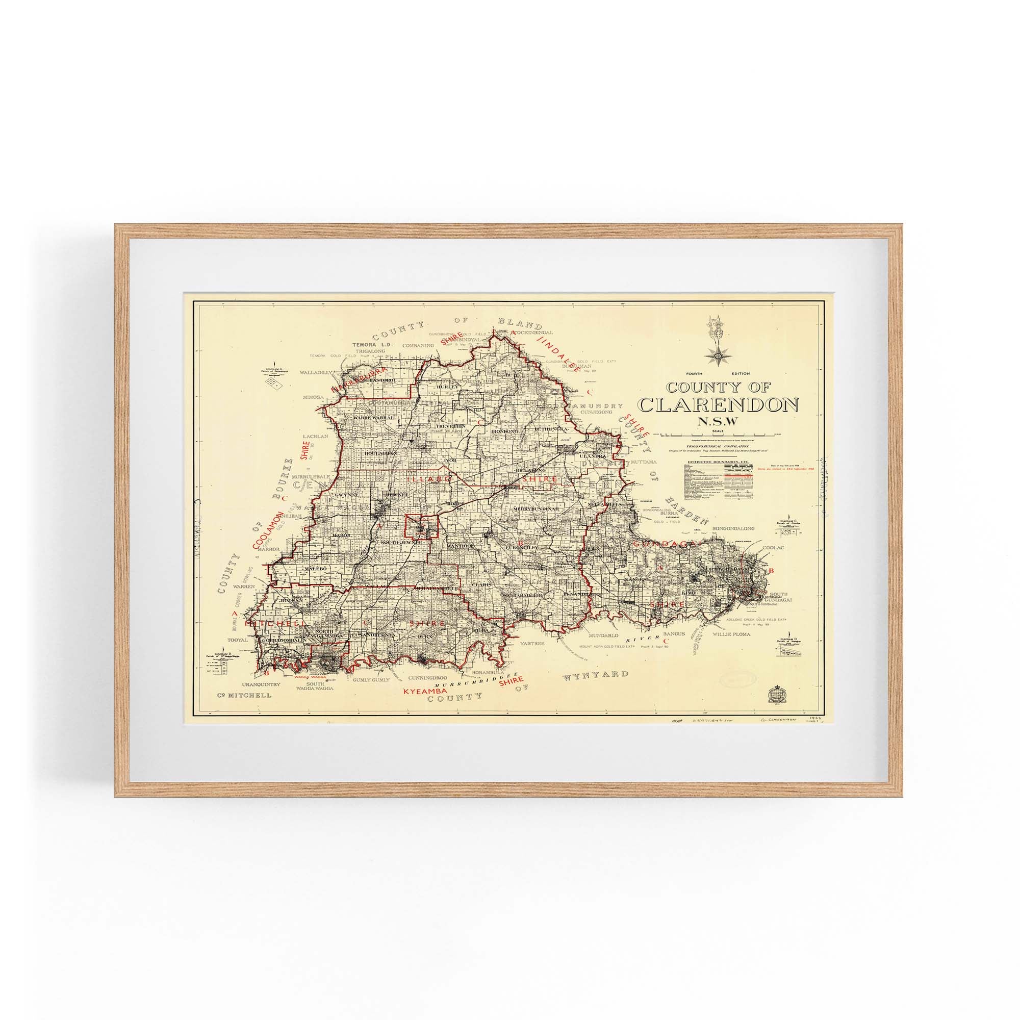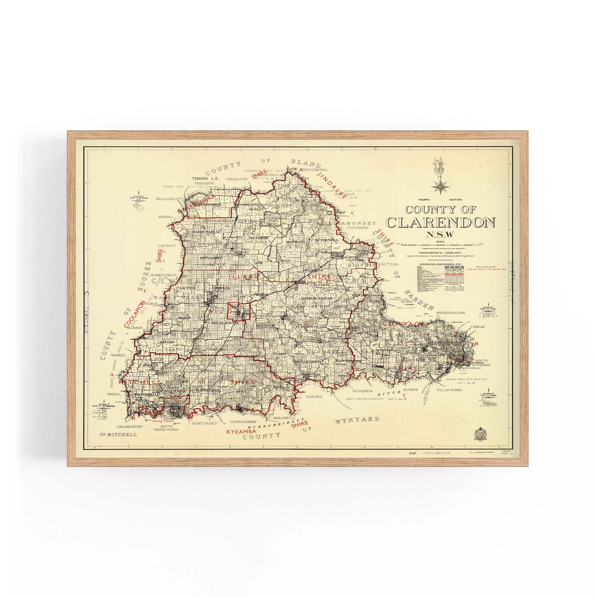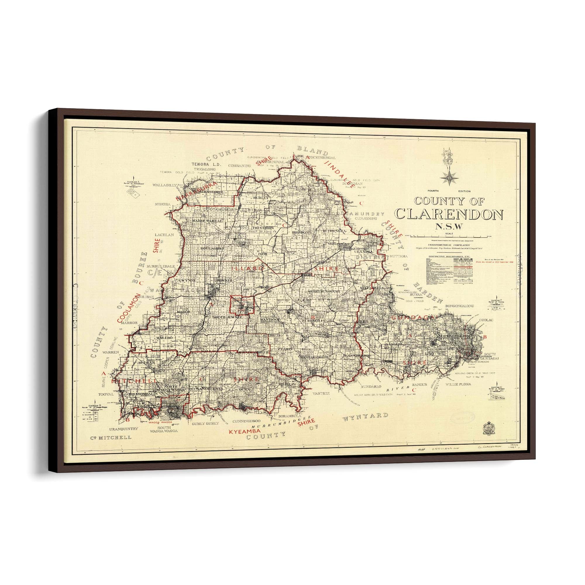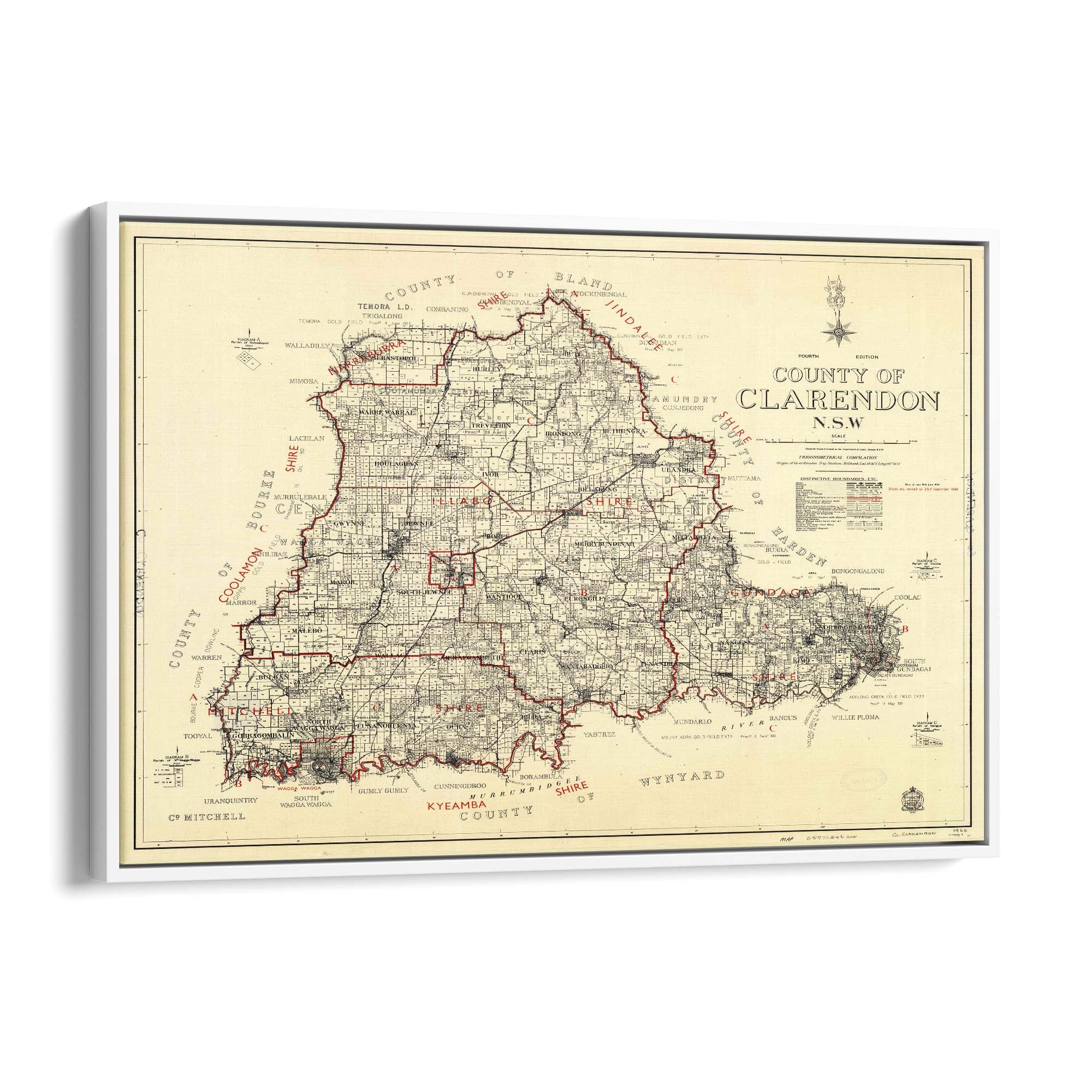 County of Clarendon, New South Wales. Cadastral map showing county and parish boundaries with shire boundaries overprinted in red. Relief is shown by hachures.