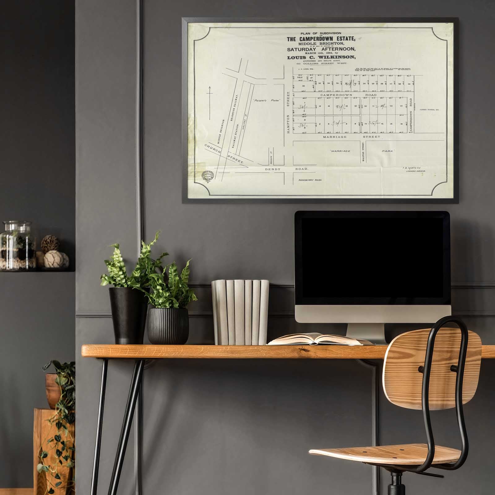 Recently moving to Harcourt and being interested in the history of the area, it seemed fitting to purchase a vintage map of the area which is displayed on our kitchen wall for us to study easily, identifying the block of land we bought. Nicely framed too.