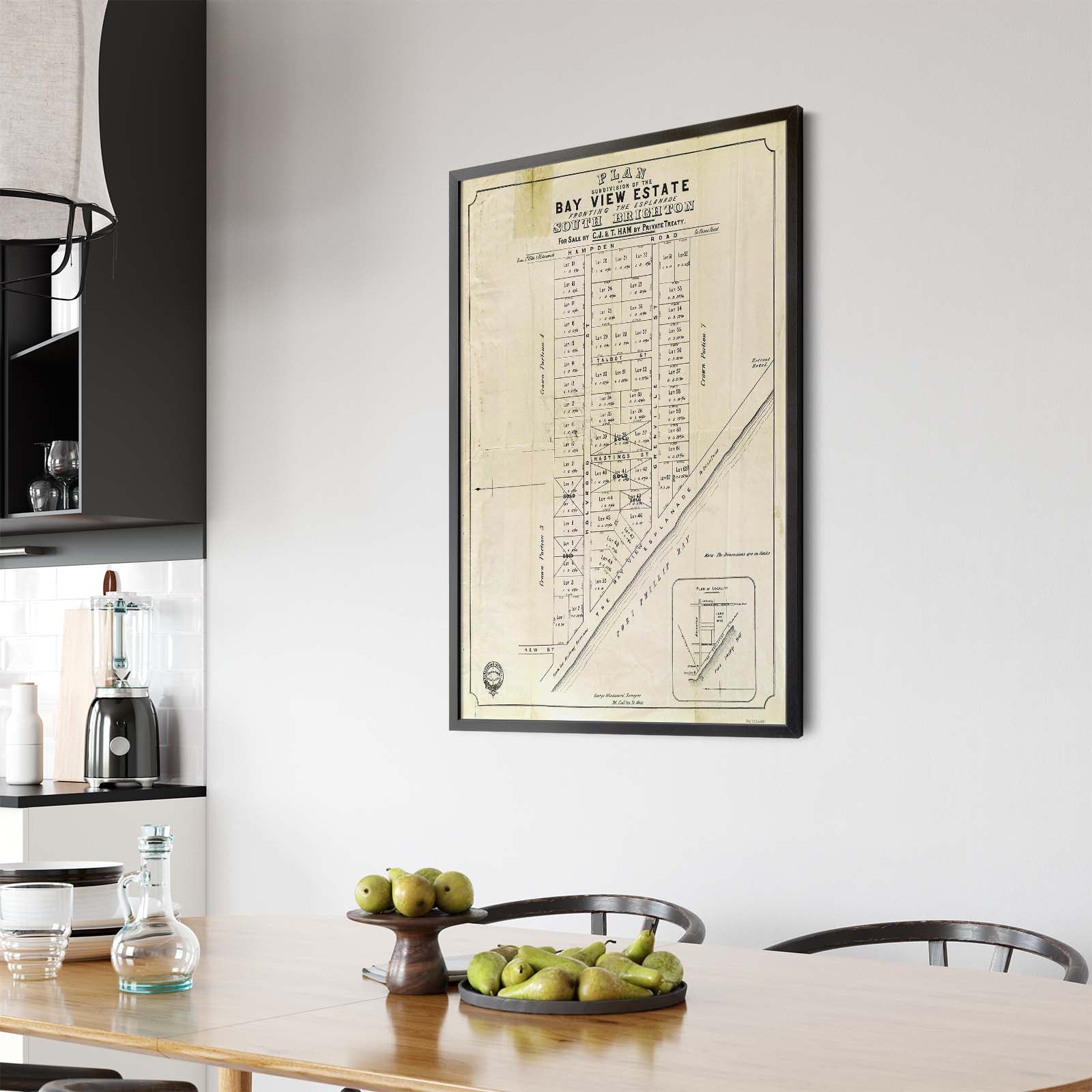 Recently moving to Harcourt and being interested in the history of the area, it seemed fitting to purchase a vintage map of the area which is displayed on our kitchen wall for us to study easily, identifying the block of land we bought. Nicely framed too.