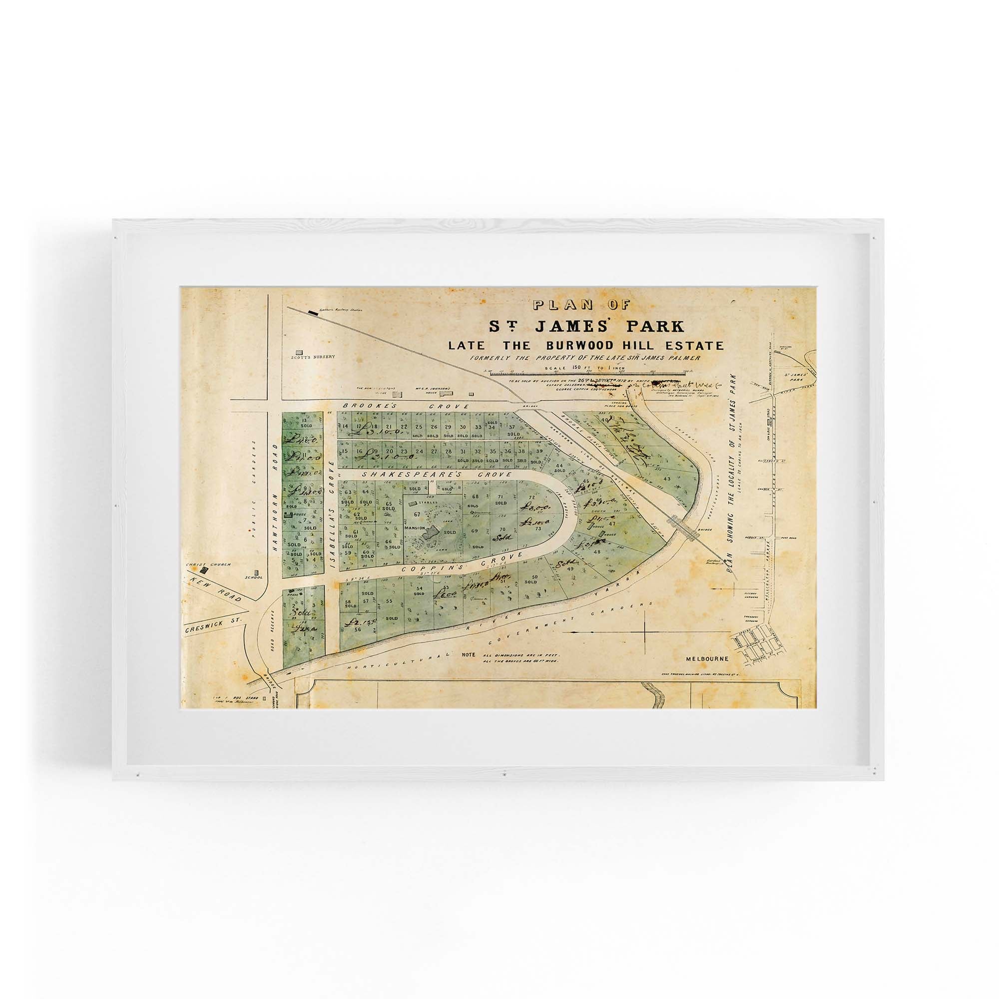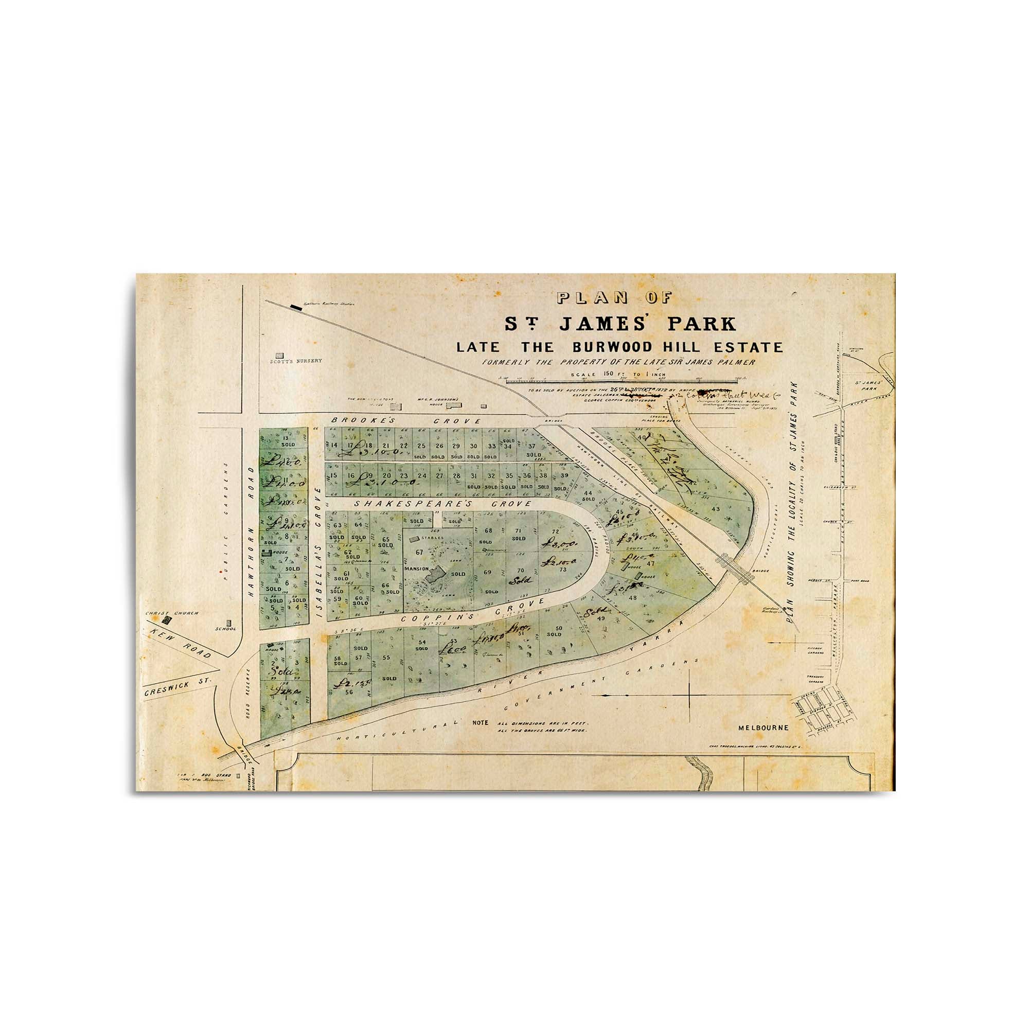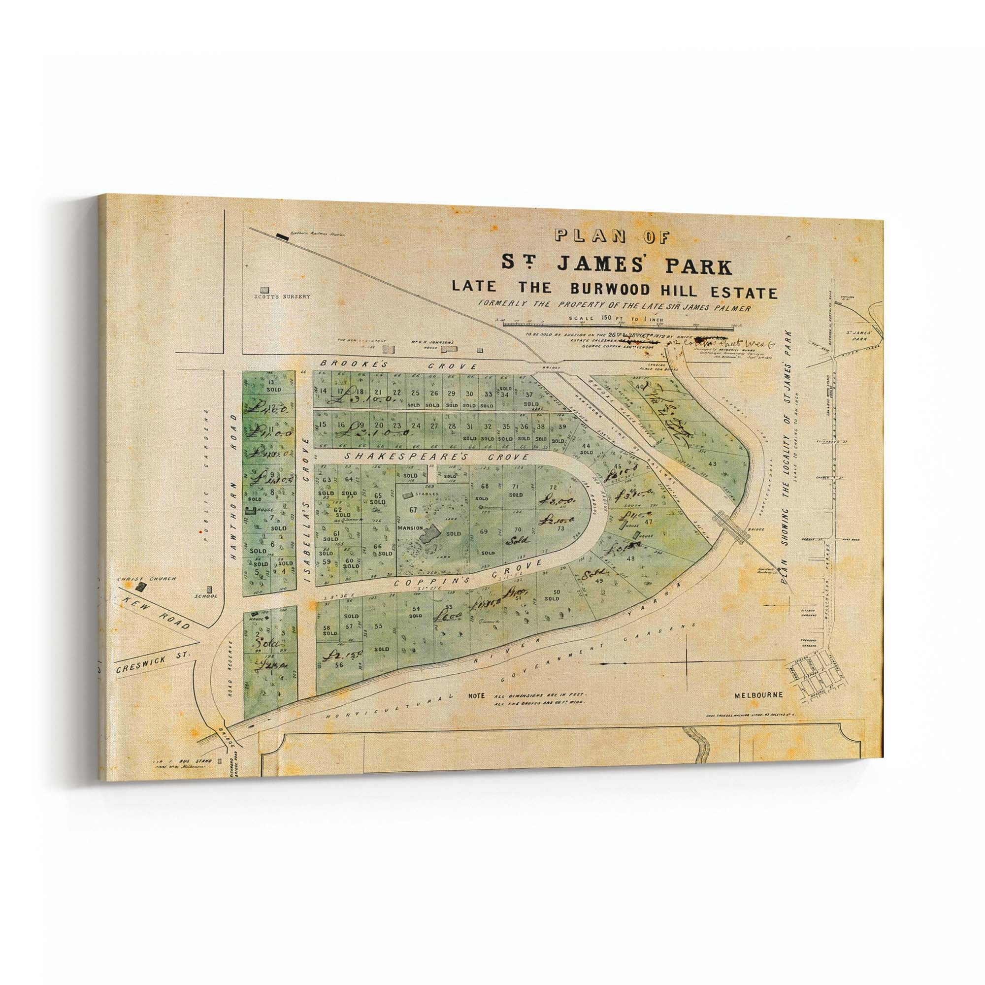 Plan of St. James' Park, late the Burwood Hill Estate, formerly the property of the late Sir James Palmer: to be sold by auction on the 26th & 28th. October 1872 by Knipe George & Co. estate salesmen, George Coppin, vendor.