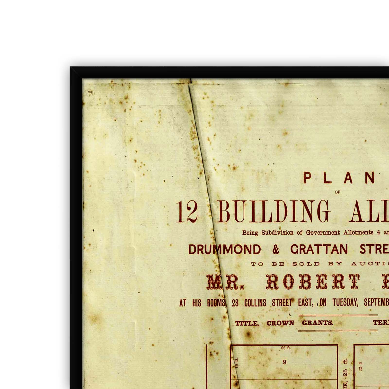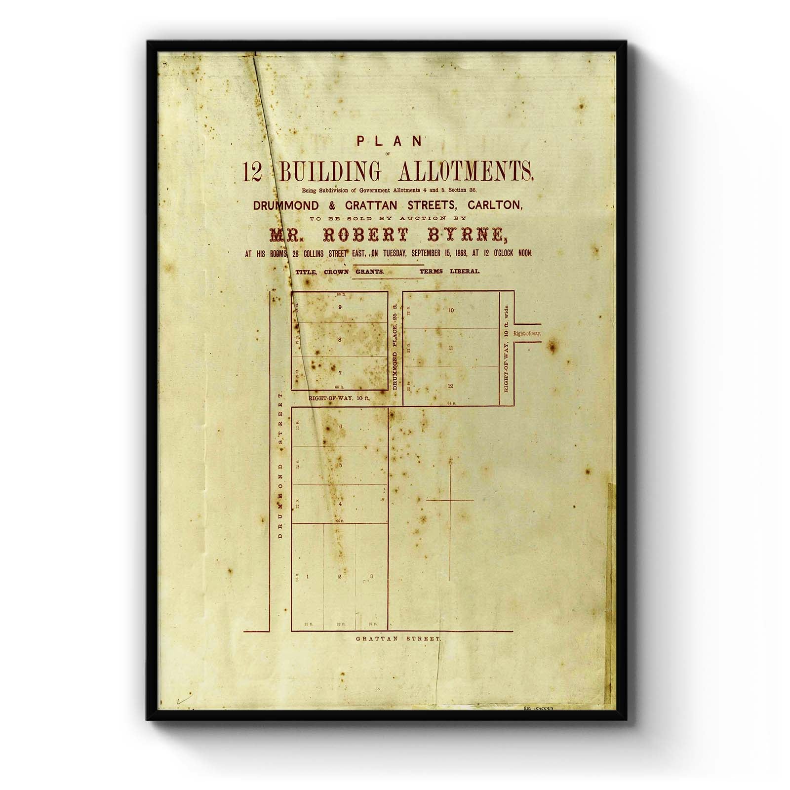 Plan of 12 building allotments, being subdivision of government allotments 4 and 5, section 36, Drummond & Grattan Streets, Carlton.