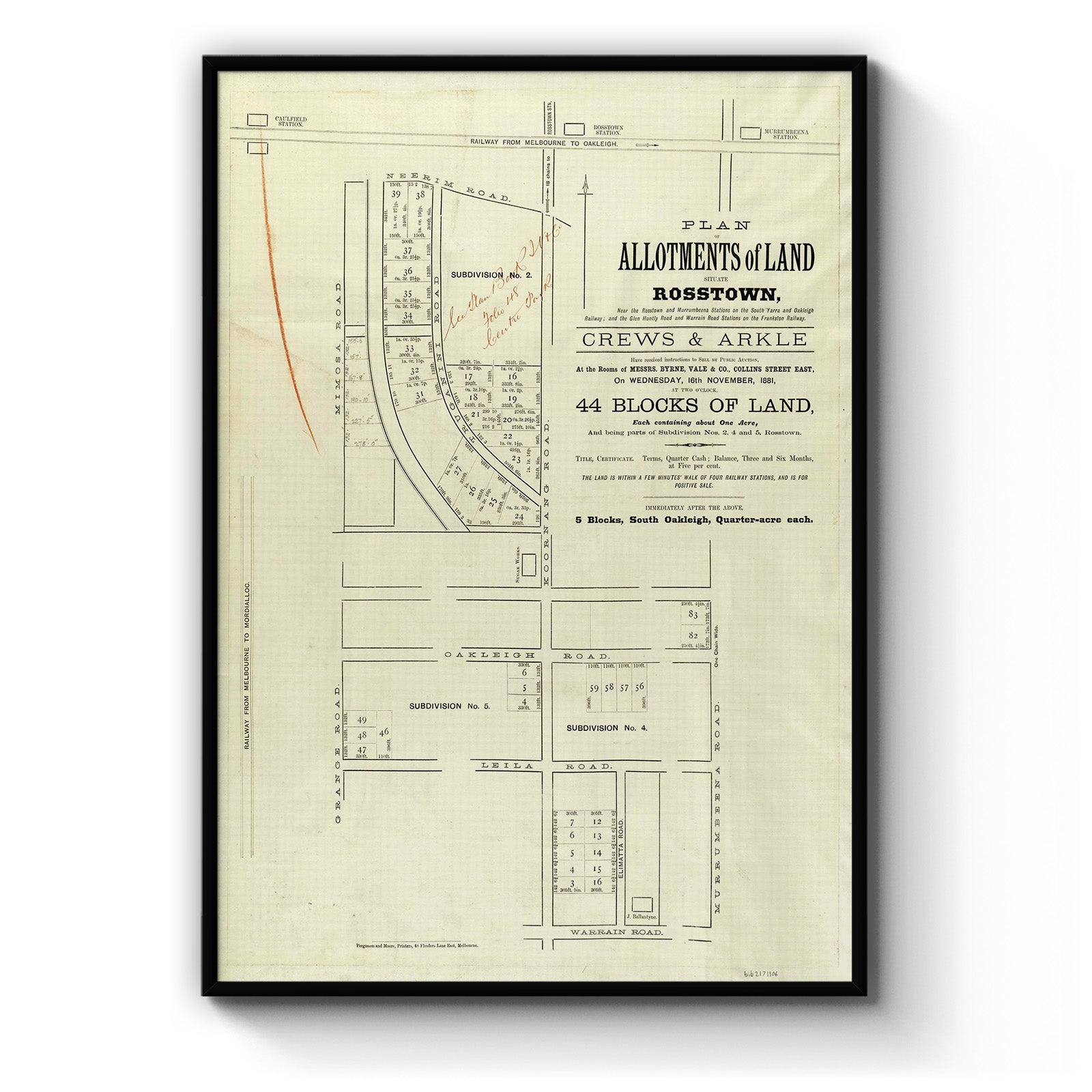 "On Wednesday, 16th November, 1881, at two o'clock, 44 blocks of land ... being parts of subdivision nos. 2, 4, and 5 Rosstown ... Immediately after the above, 5 blocks, South Oakleigh."