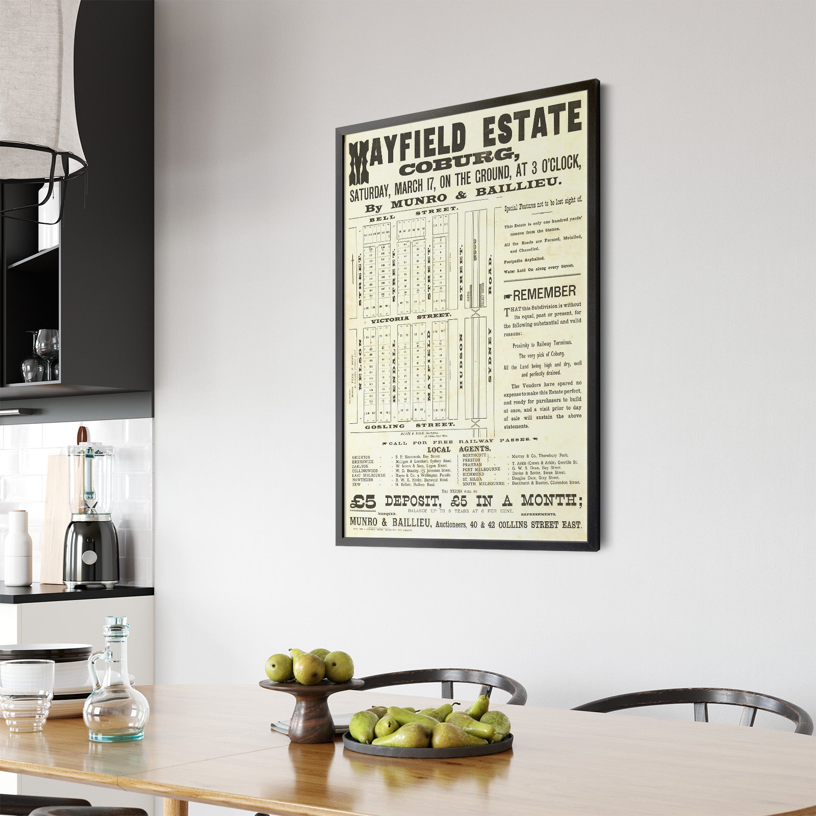 Recently moving to Harcourt and being interested in the history of the area, it seemed fitting to purchase a vintage map of the area which is displayed on our kitchen wall for us to study easily, identifying the block of land we bought. Nicely framed too.