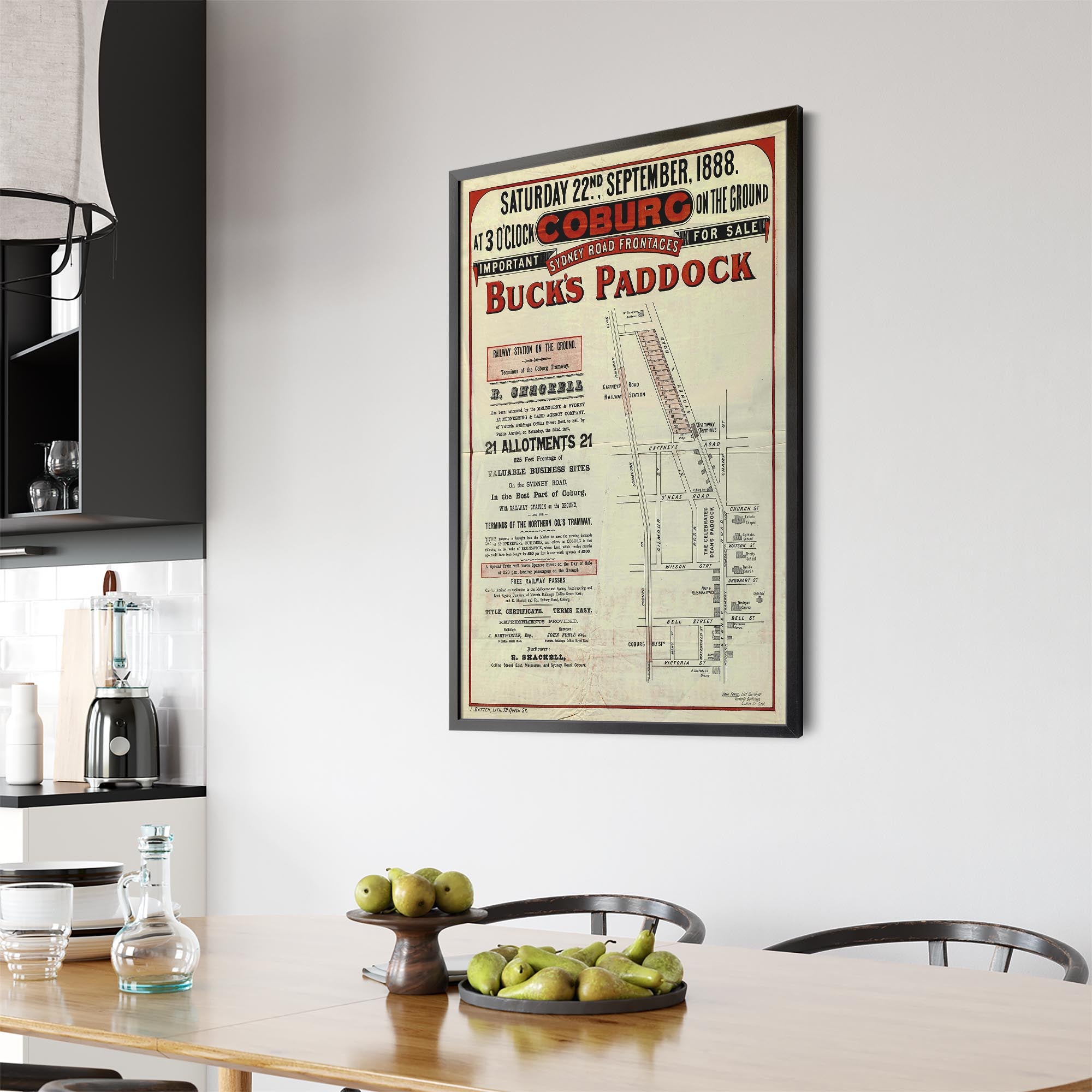 Recently moving to Harcourt and being interested in the history of the area, it seemed fitting to purchase a vintage map of the area which is displayed on our kitchen wall for us to study easily, identifying the block of land we bought. Nicely framed too.