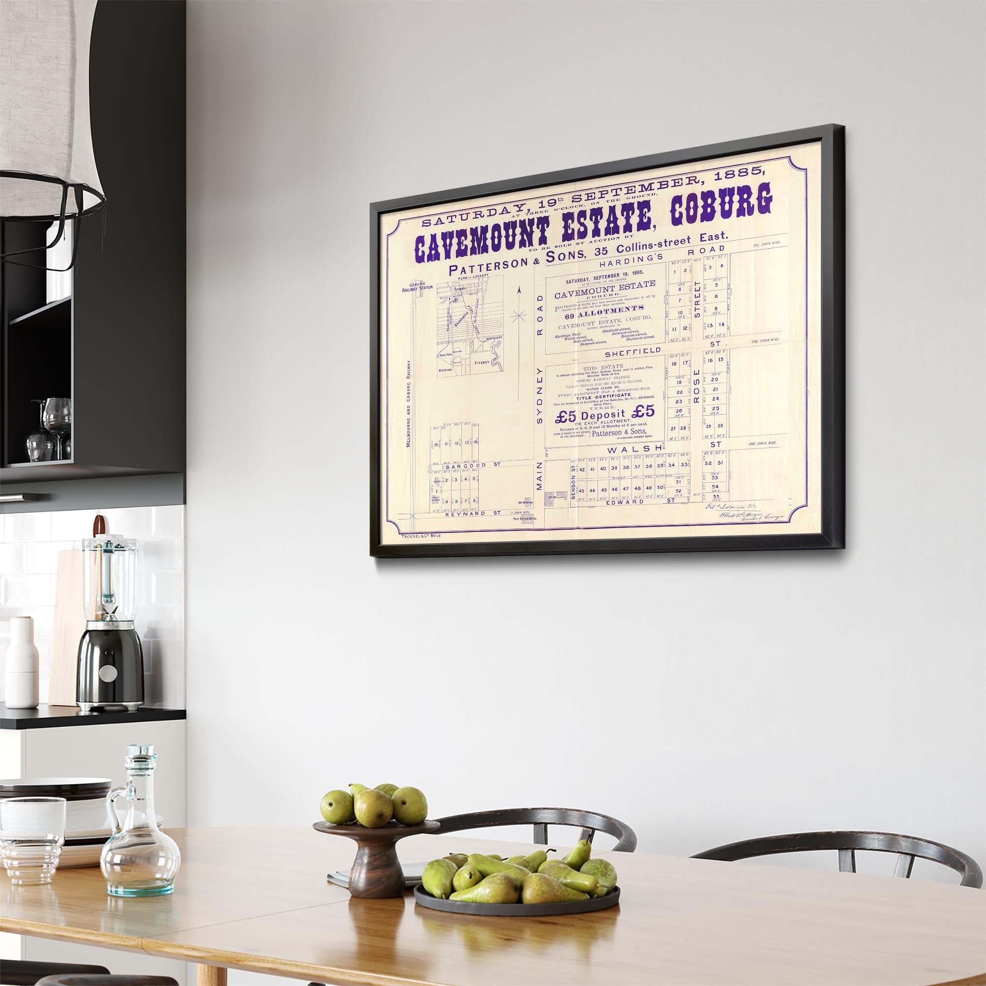 Recently moving to Harcourt and being interested in the history of the area, it seemed fitting to purchase a vintage map of the area which is displayed on our kitchen wall for us to study easily, identifying the block of land we bought. Nicely framed too.