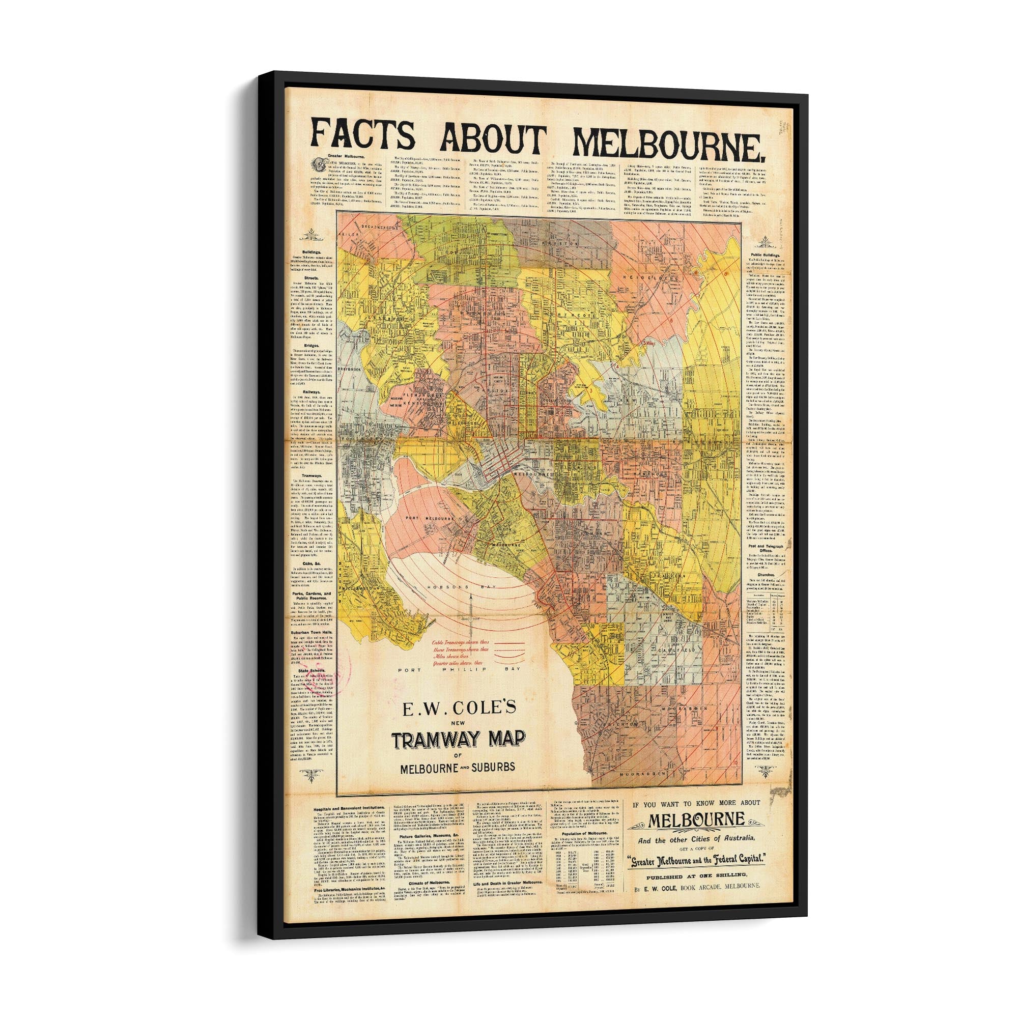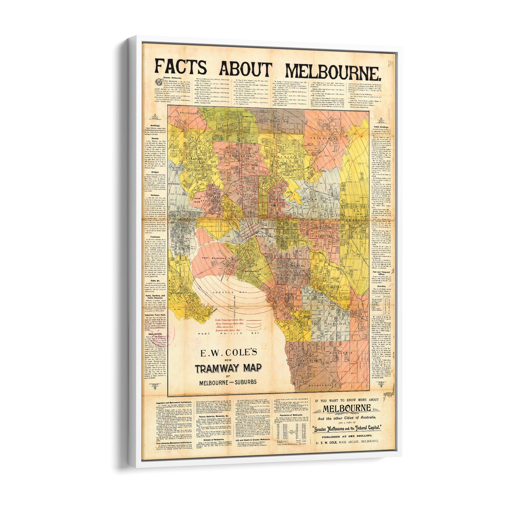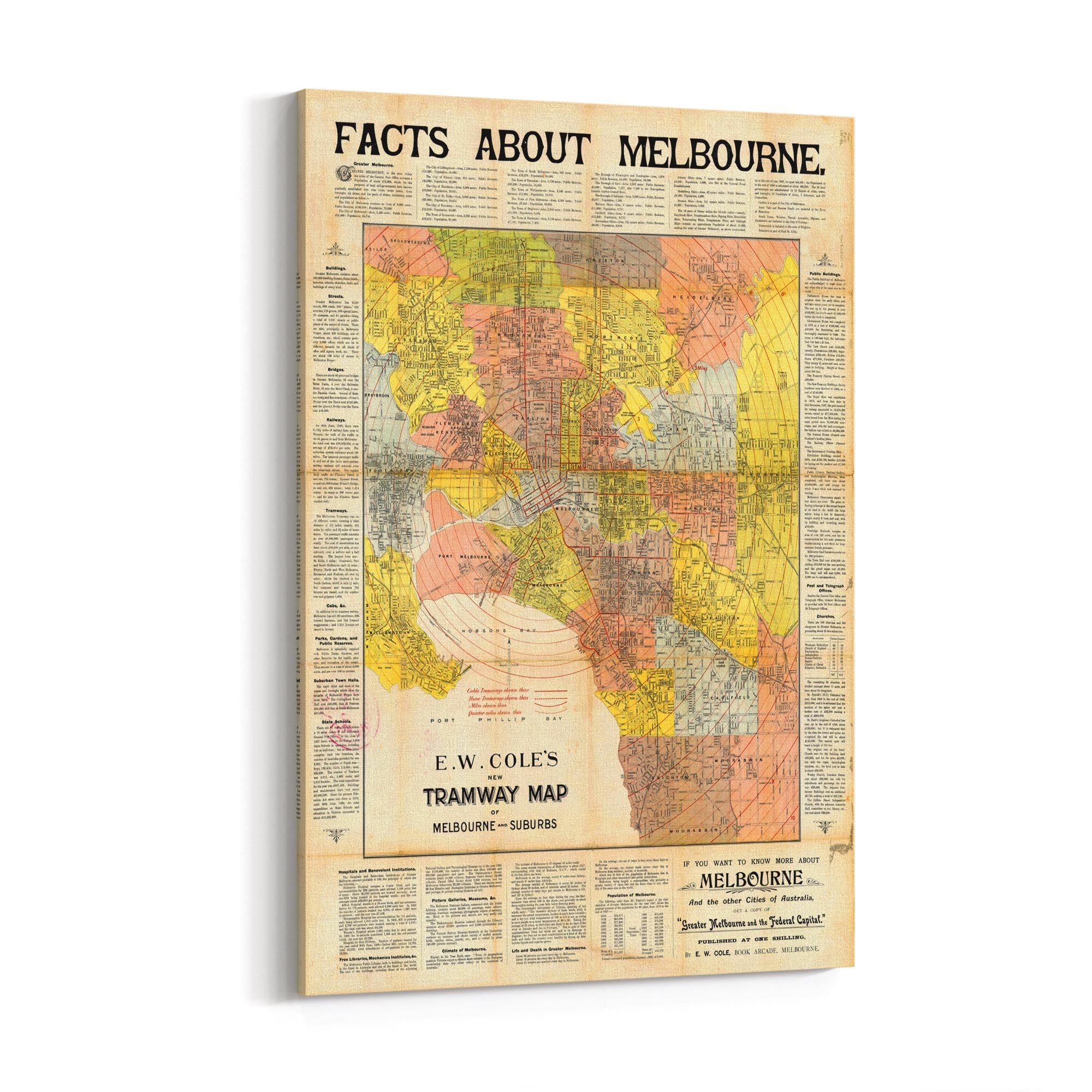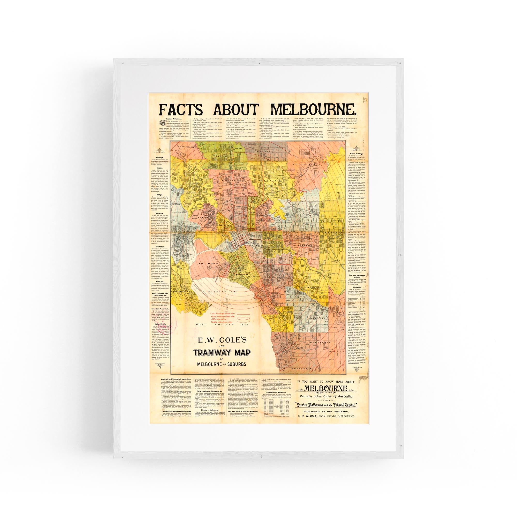 1900 Vintage Map of Melbourne And Suburbs (E.W. Cole's New Tramway Map)