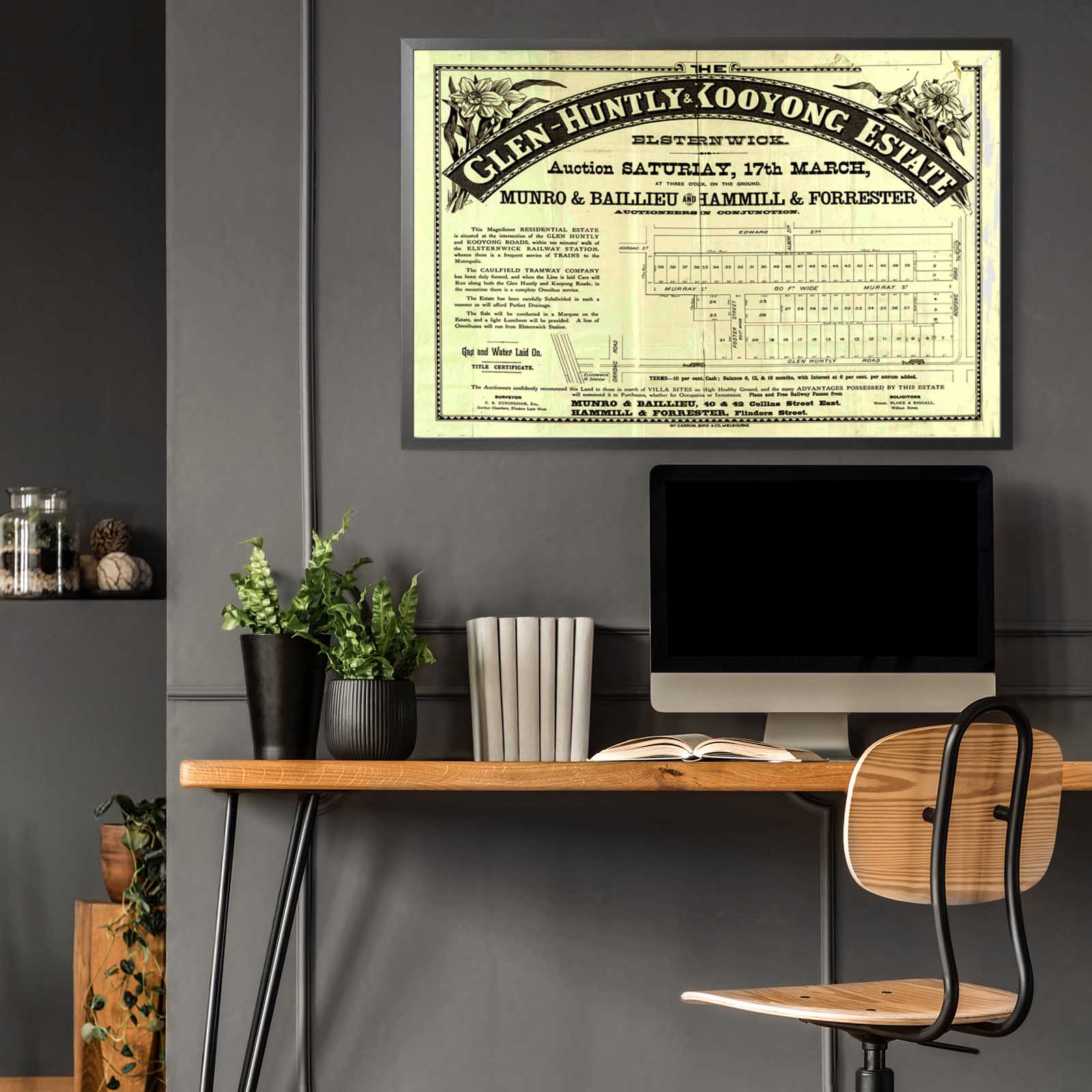 Recently moving to Harcourt and being interested in the history of the area, it seemed fitting to purchase a vintage map of the area which is displayed on our kitchen wall for us to study easily, identifying the block of land we bought. Nicely framed too.