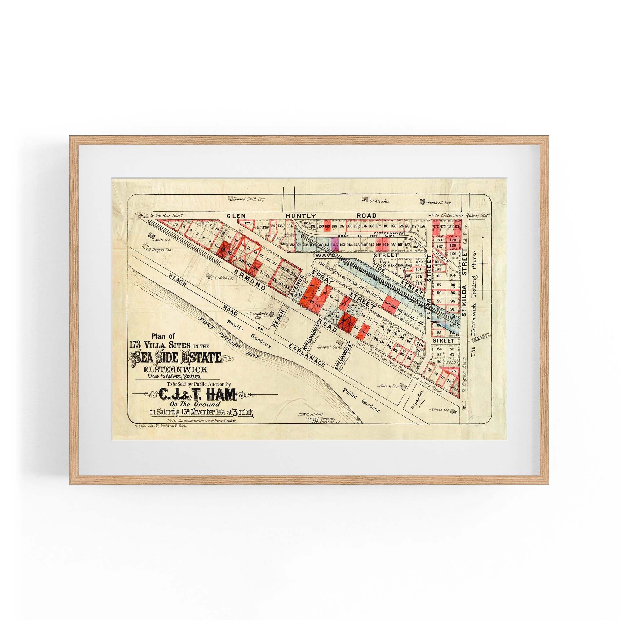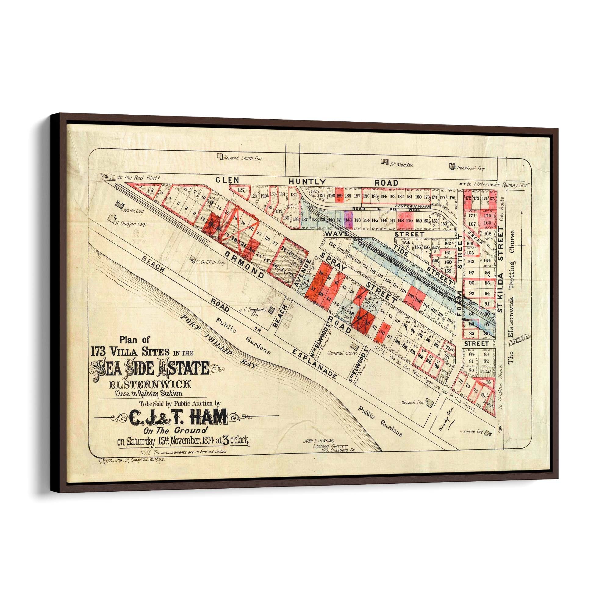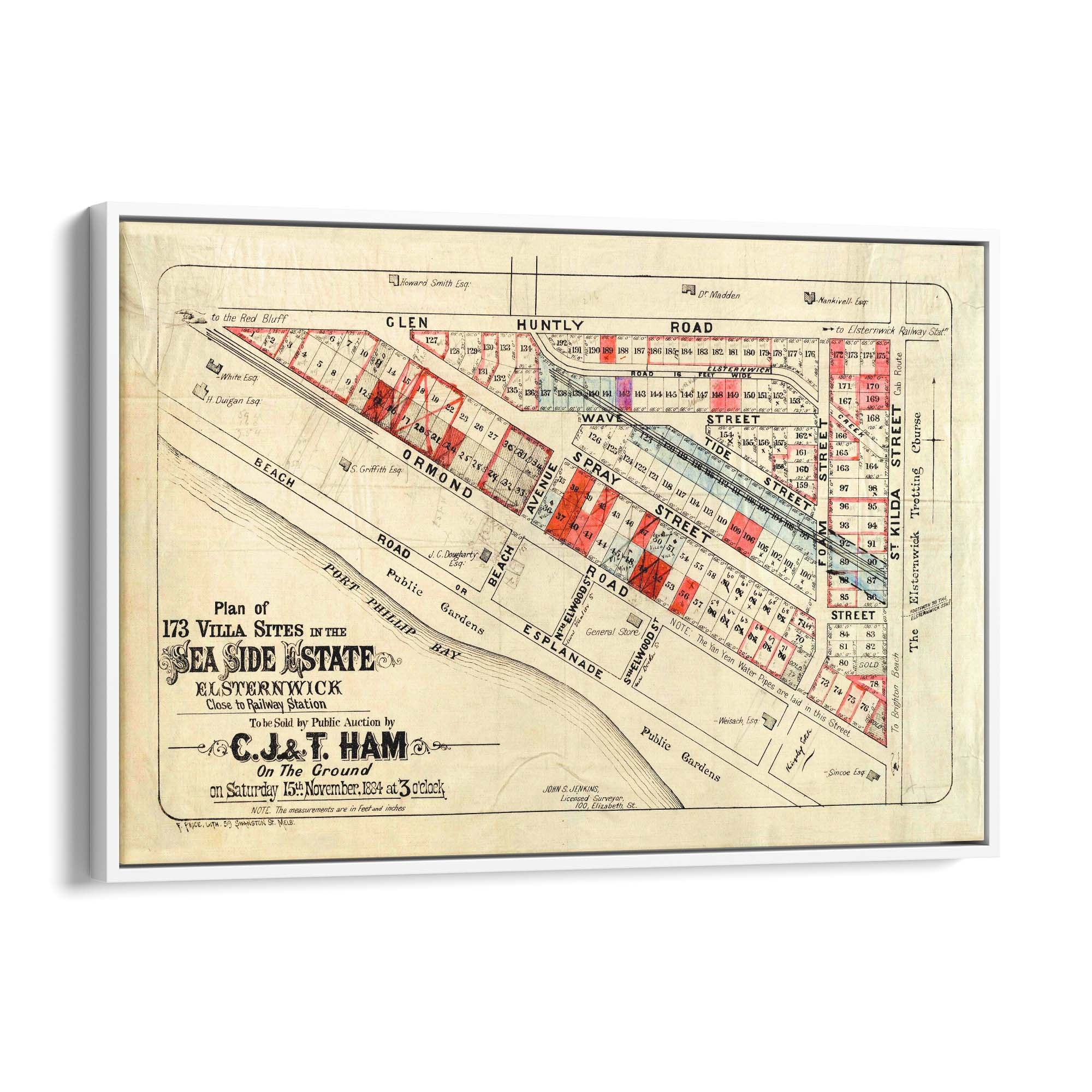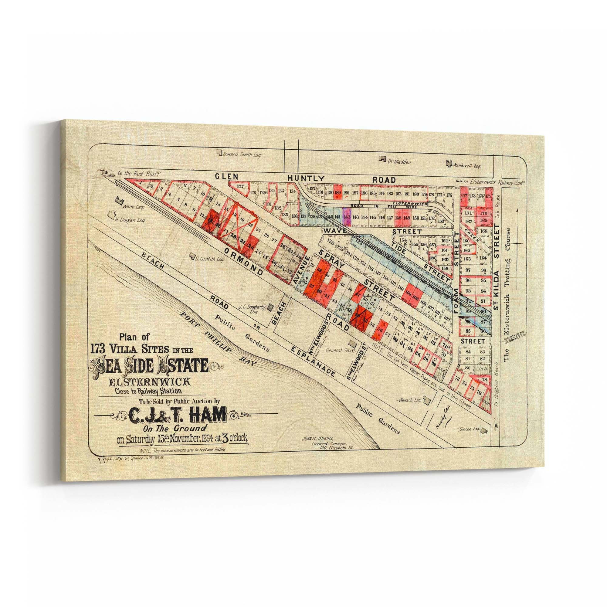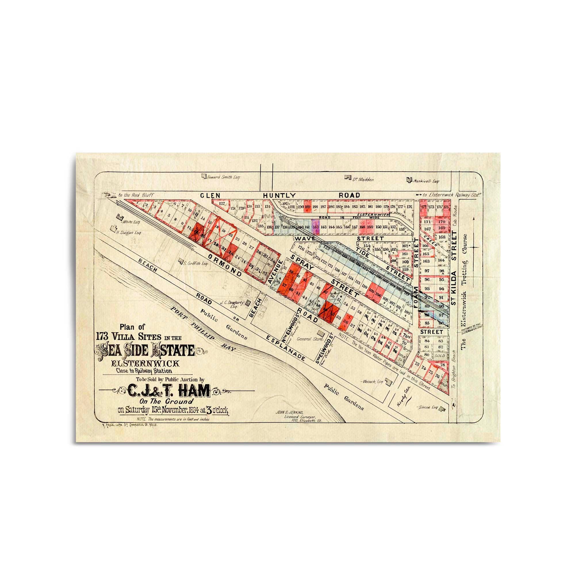 "To be sold by public auction by C.J. & T. Ham on the ground on Saturday 15th November 1884 at 3 o'clock.", "John S. Jenkins, licensed surveyor."