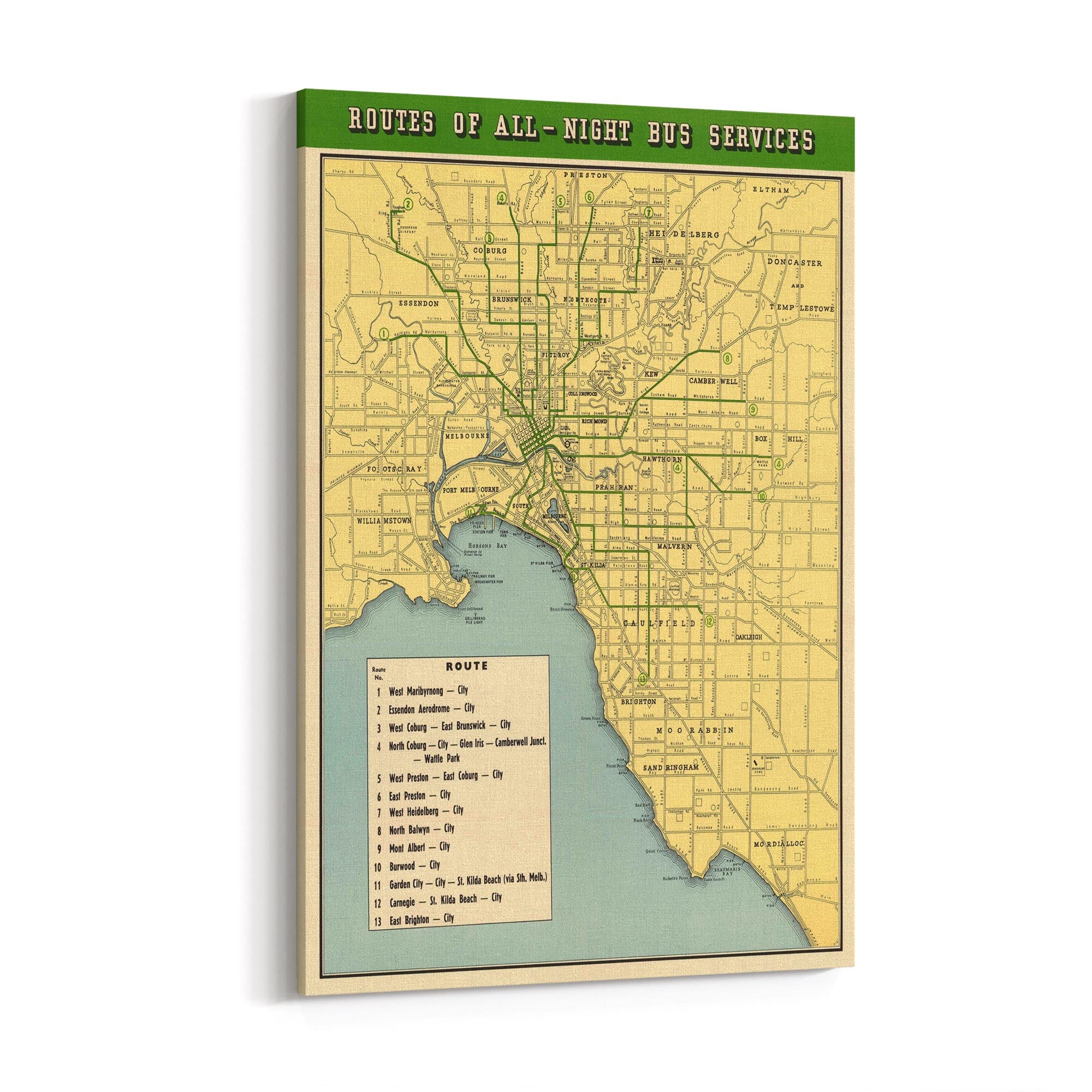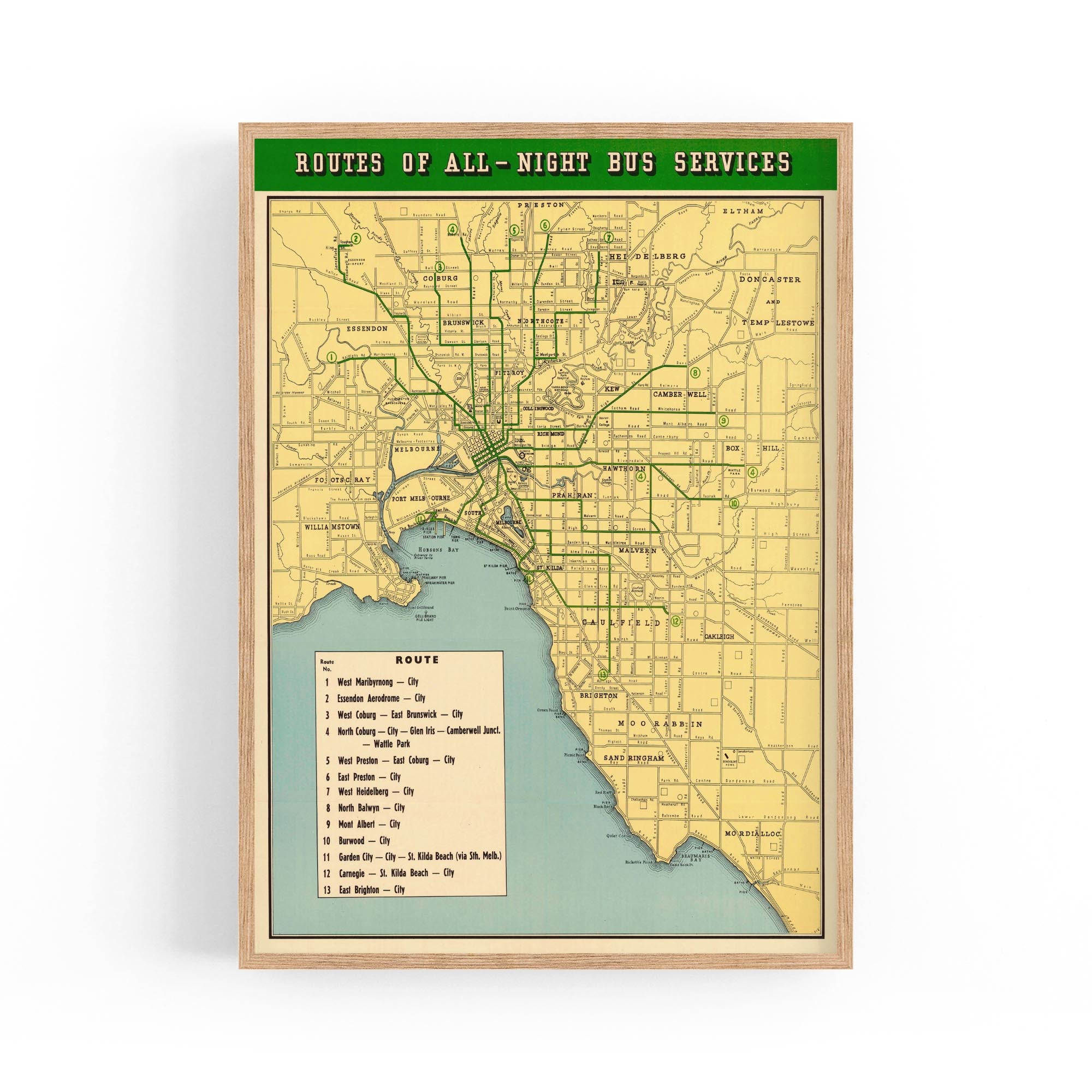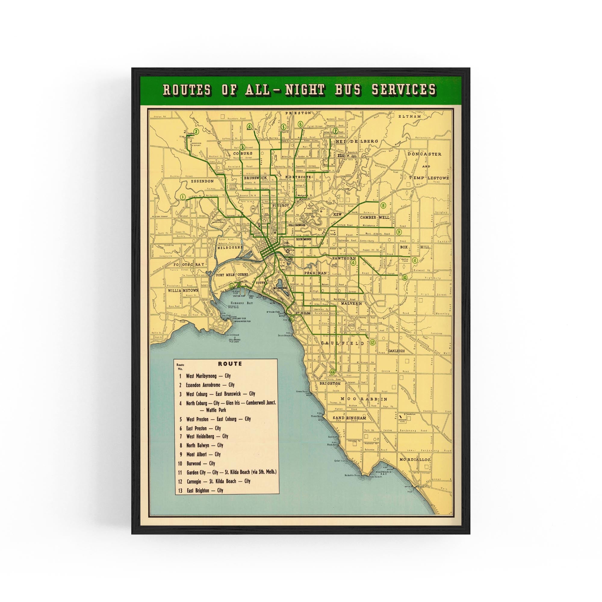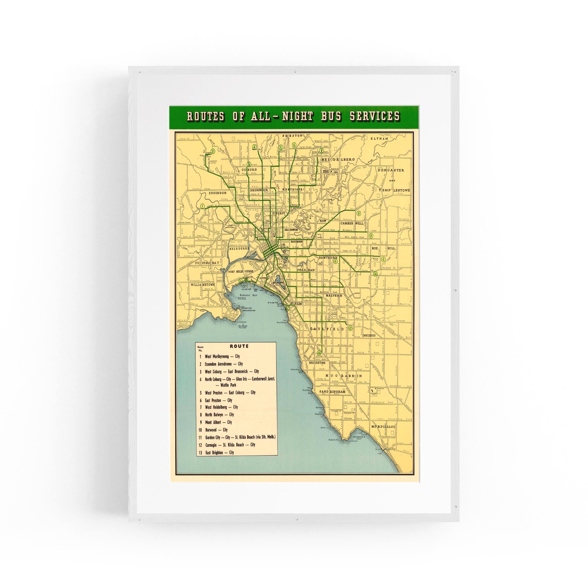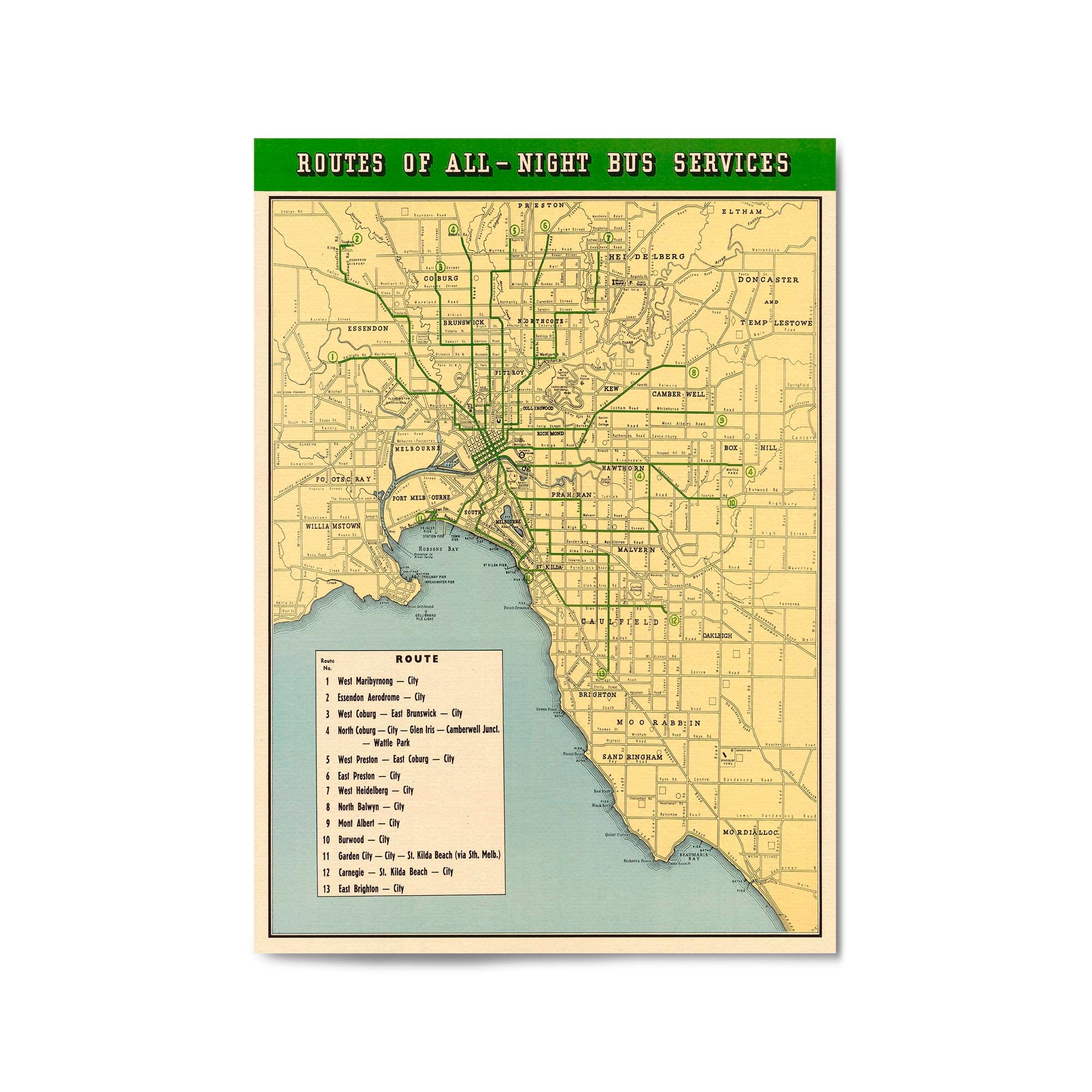 Map and timetable of all-night bus services. Issued by the Melbourne & Metropolitan Tramways Board.