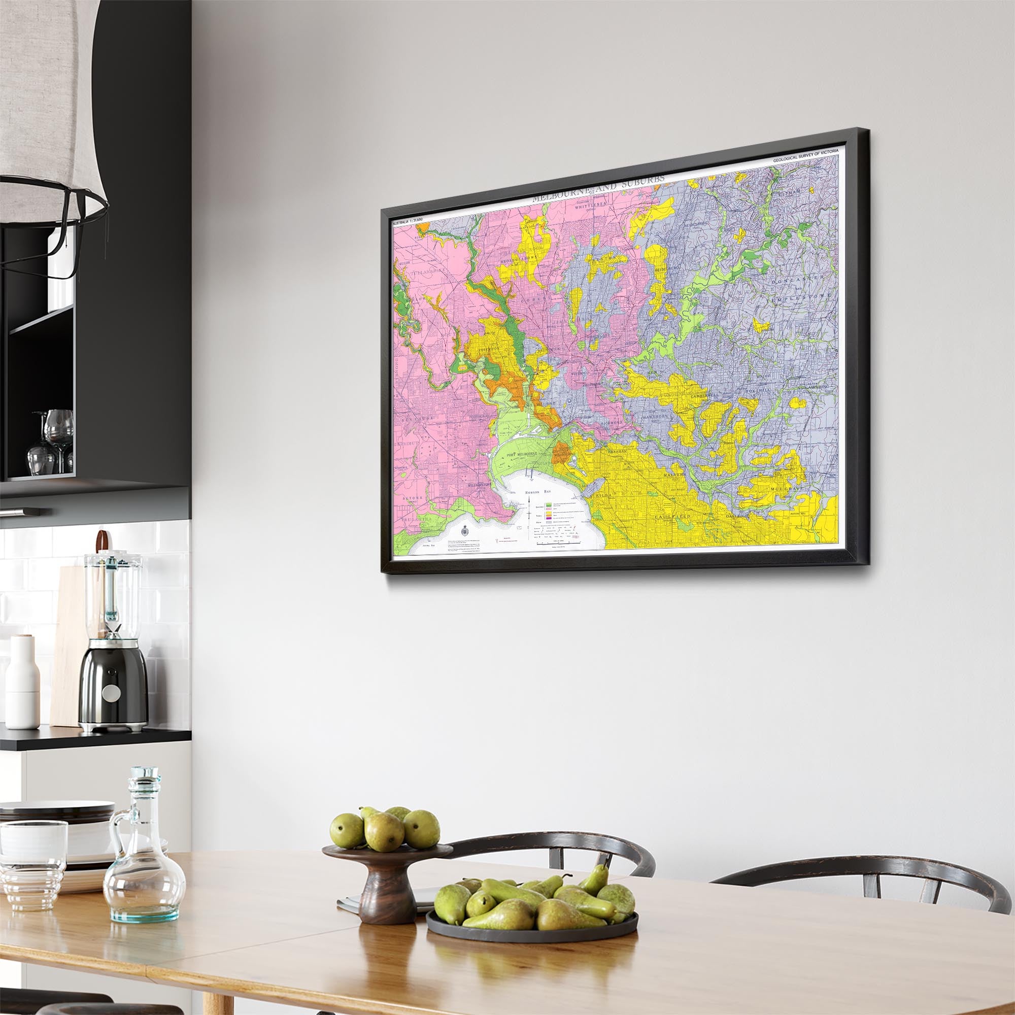 Recently moving to Harcourt and being interested in the history of the area, it seemed fitting to purchase a vintage map of the area which is displayed on our kitchen wall for us to study easily, identifying the block of land we bought. Nicely framed too.