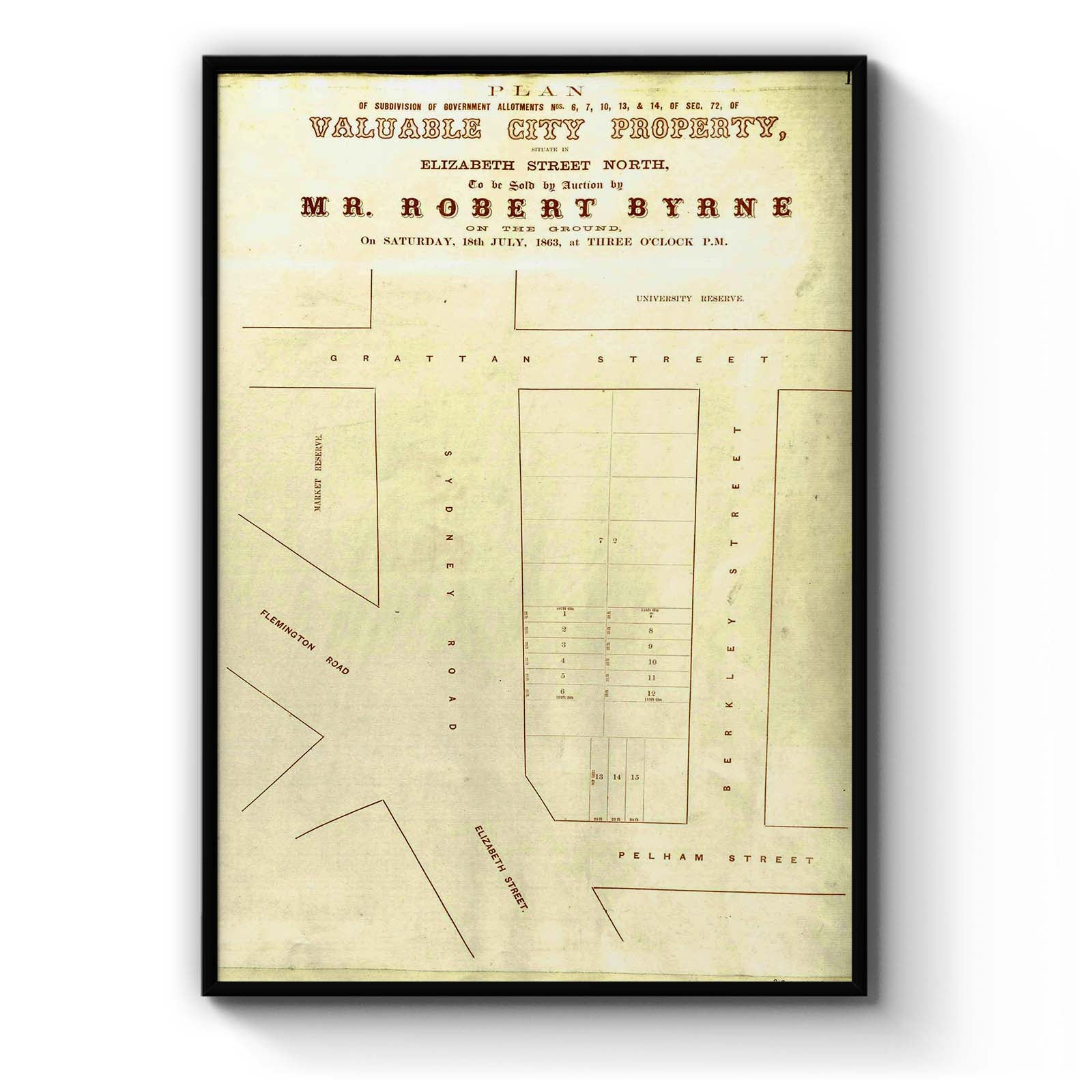 Valuable city property, situate in Elizabeth Street North [cartographic material]. 1863 "Plan of subdivision of government allotments Nos. 6, 7, 10, 13, & 14, of sec. 72";