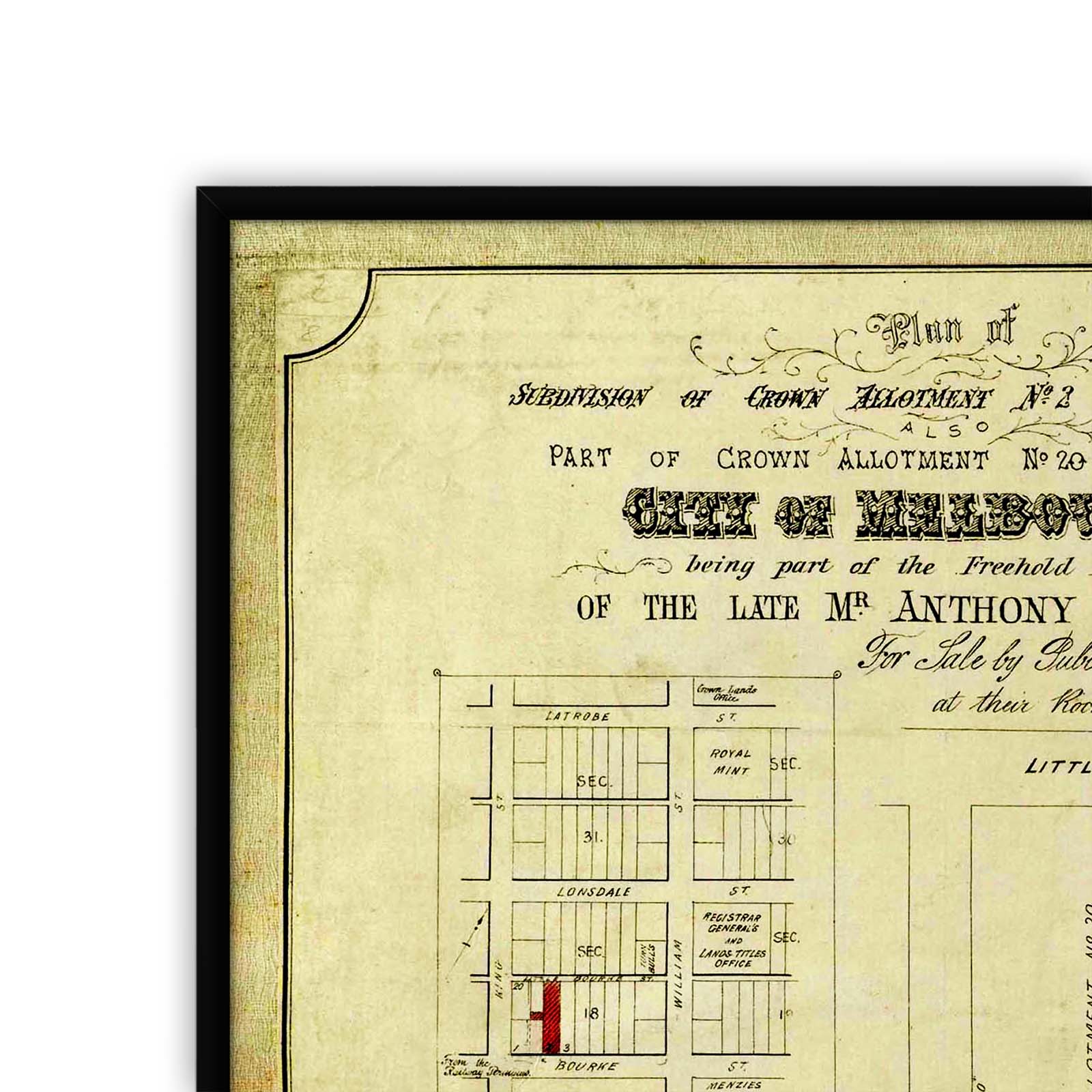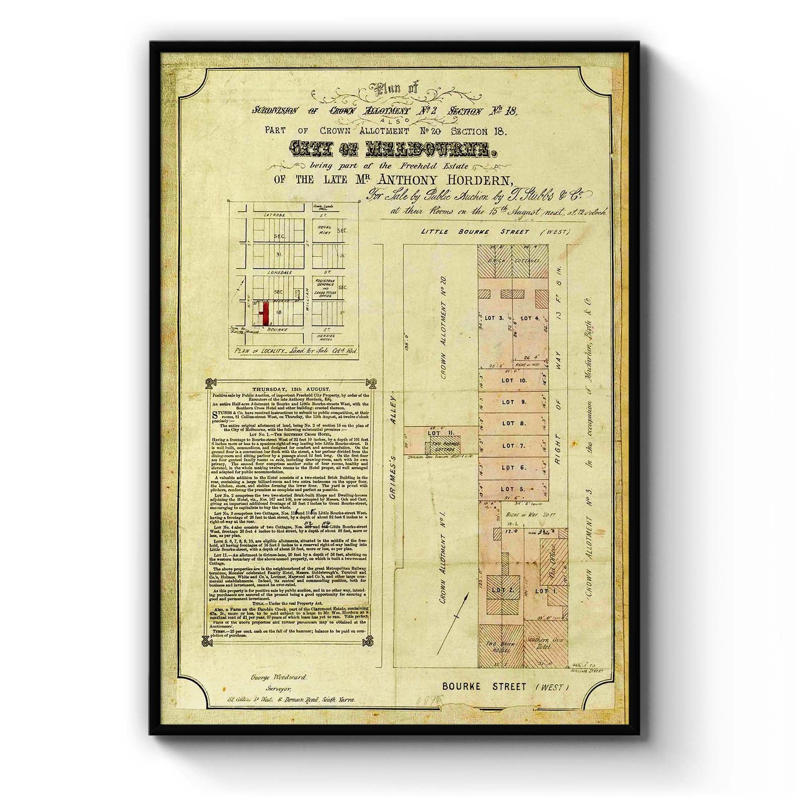 Plan of subdivision of crown allotment no. 2 section no. 18, part of crown allotment no. 20 section 18, City of Melbourne : being part of the freehold estate of the late Mr. Anthony Hordern / George Woodward Surveyor. George Woodward surveyor ; Stubbs & Co., issuing body [between 1880 and 1895?]