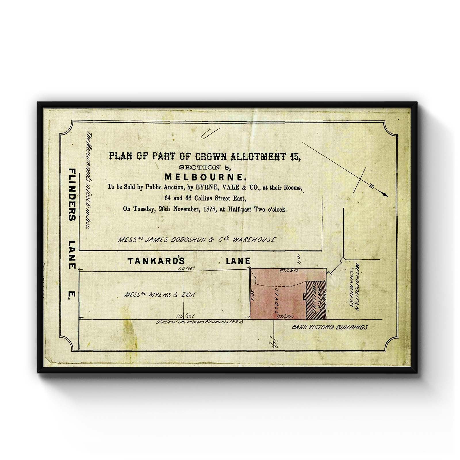 Also shows locations of Messrs Meyers and Zox, Metropolitan Chambers, and Bank Victoria buildings.