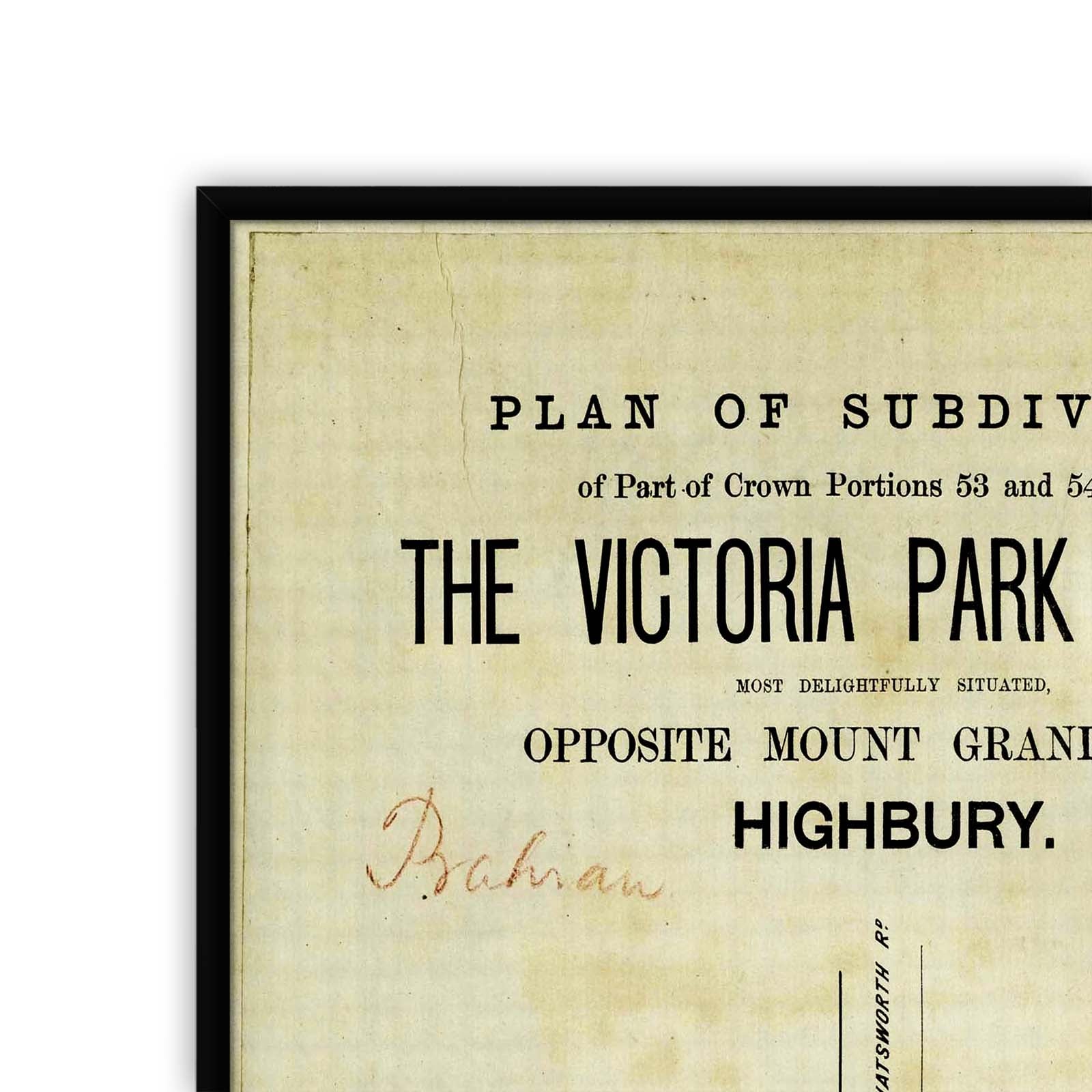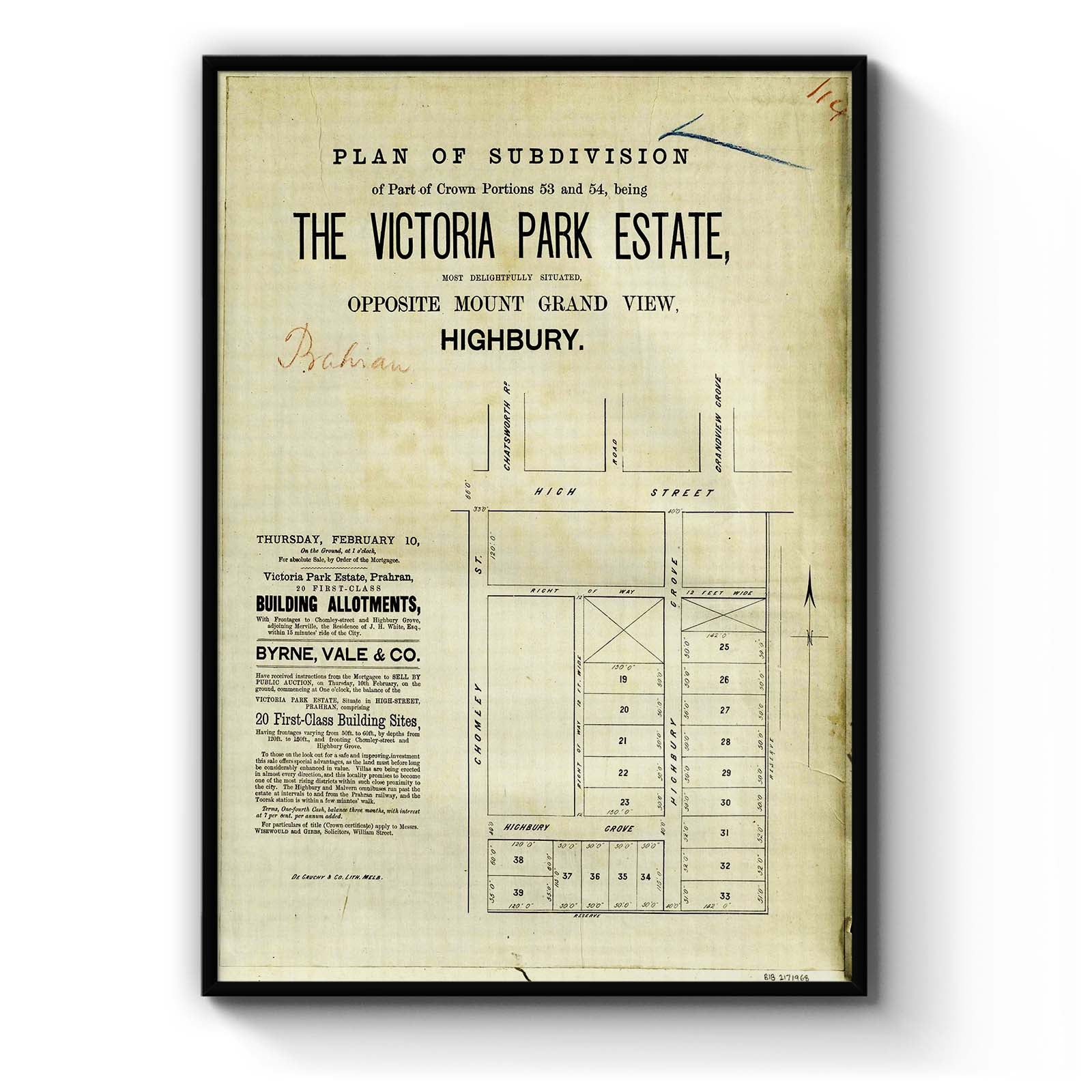 Plan of subdivision of part of Crown portions 53 and 54, being the Victoria Park Estate [cartographic material]. [between 1860 to 1880]