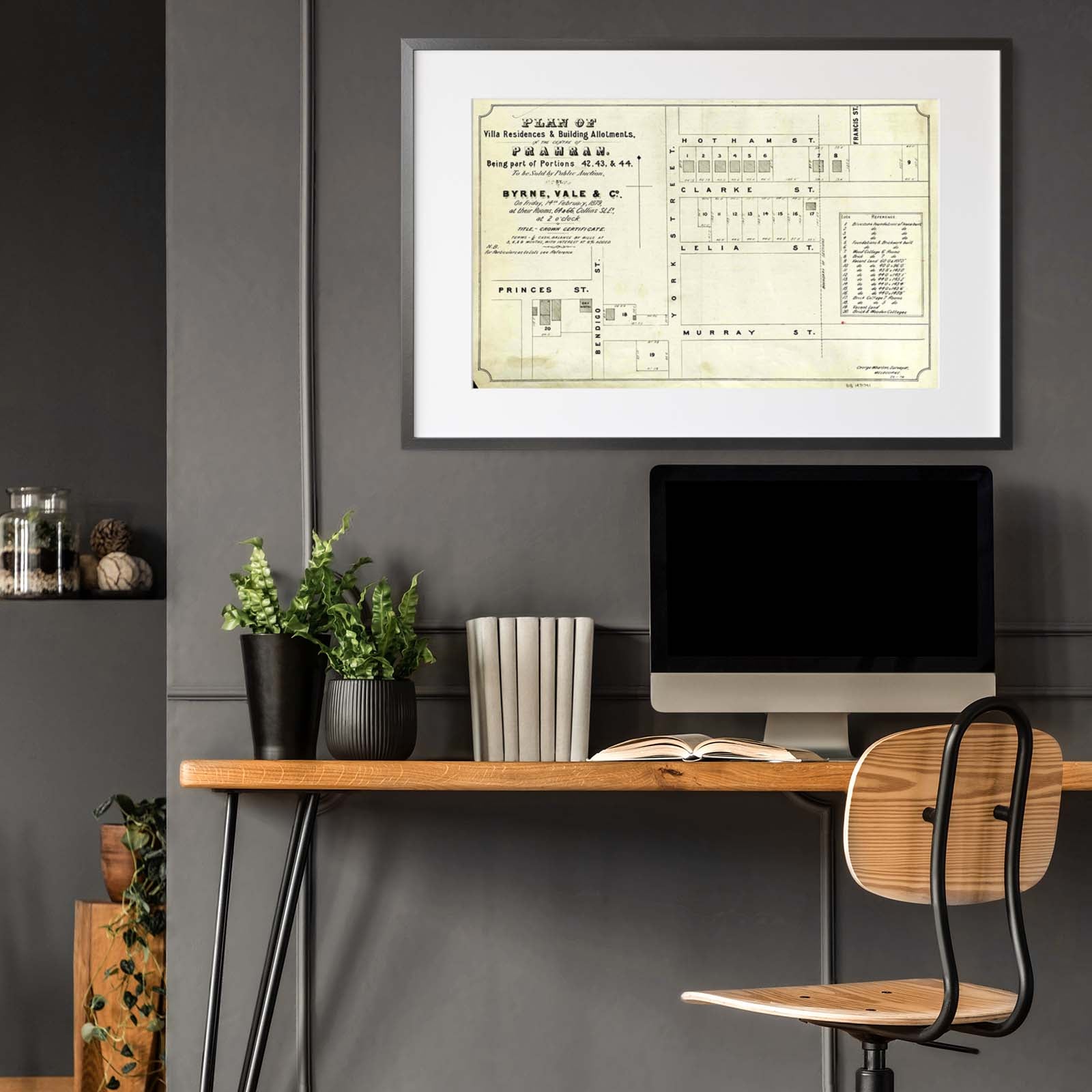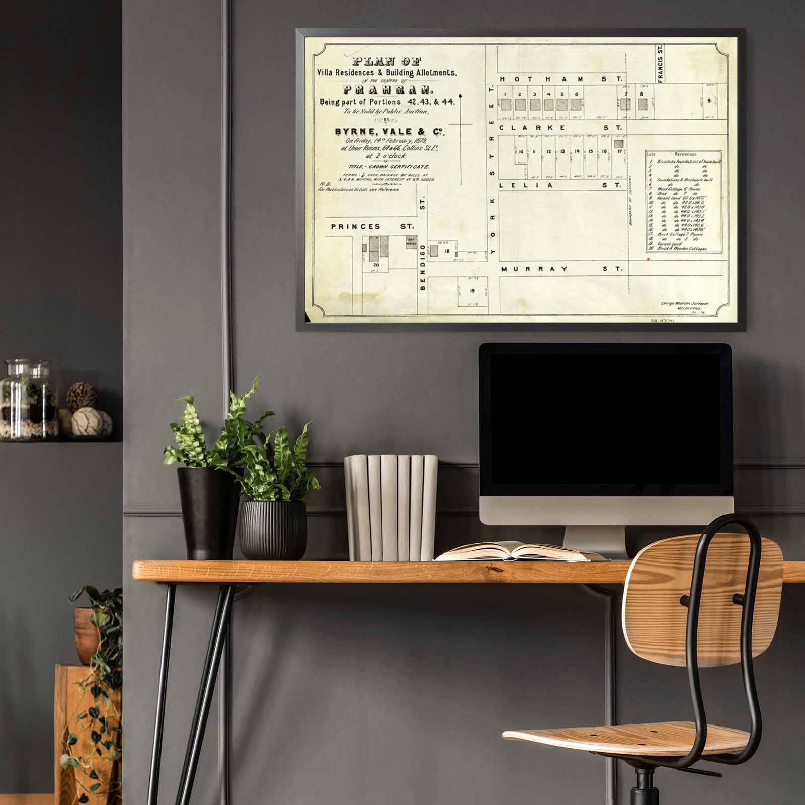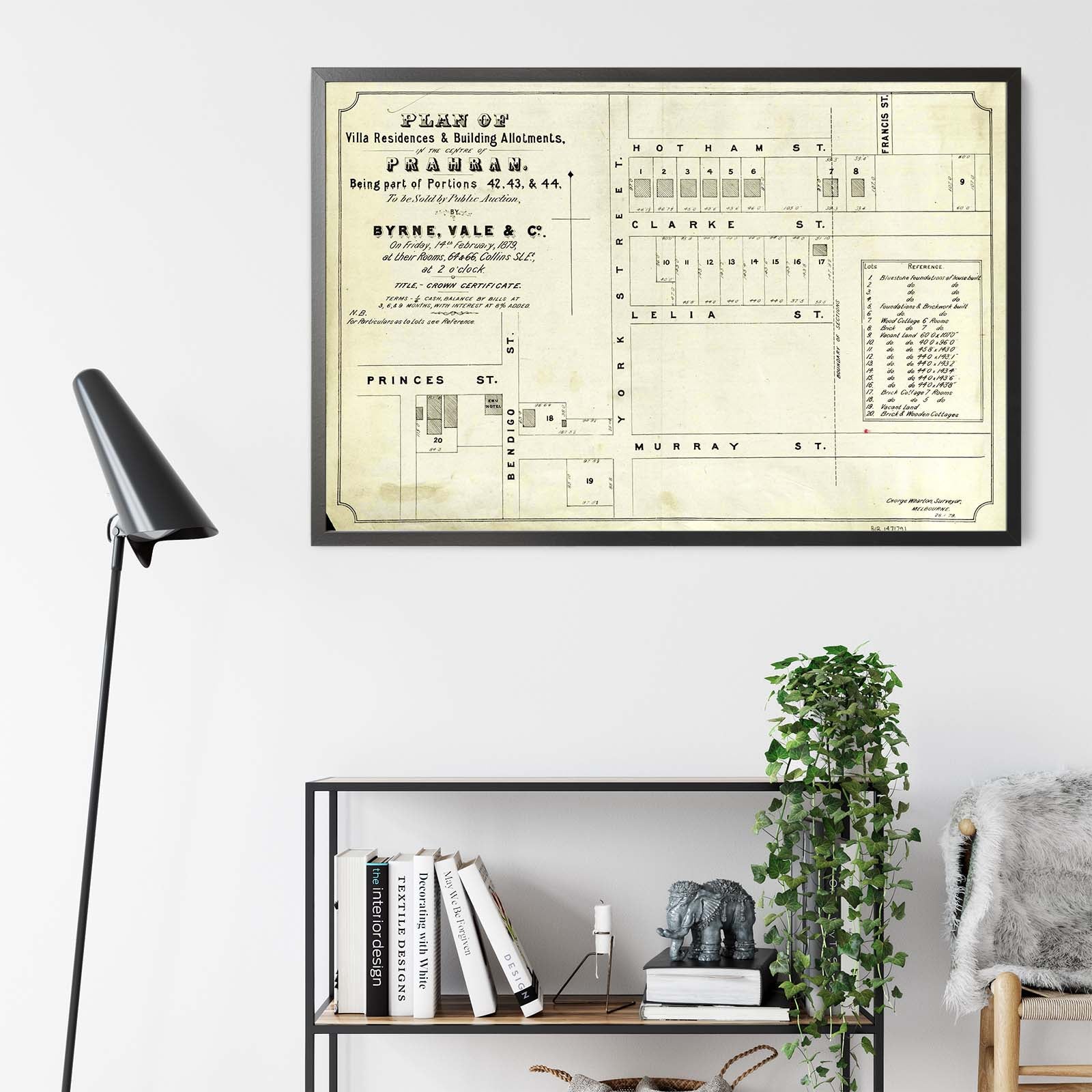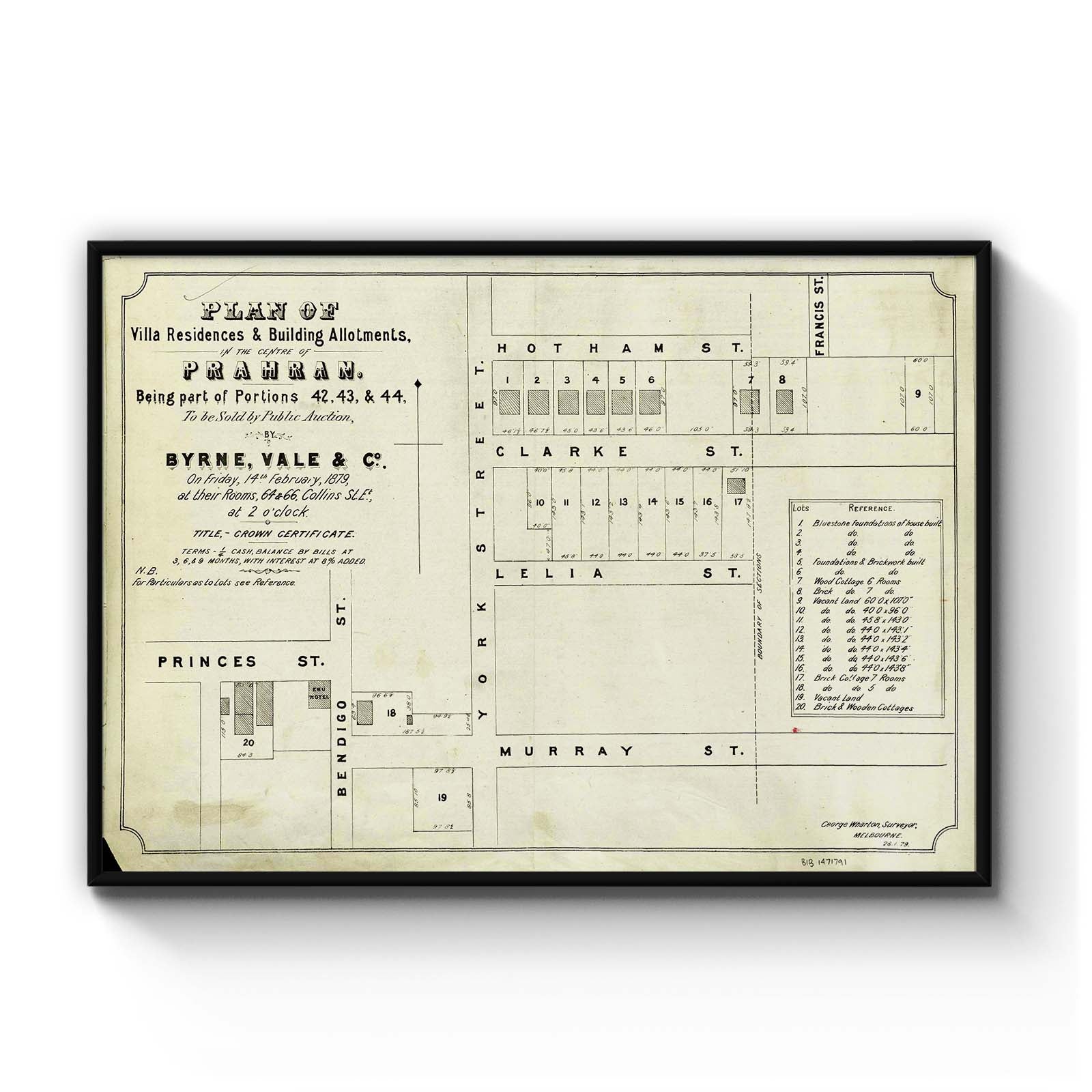 Plan of villa residences & building allotments, in the centre of Prahran [cartographic material]. 1879 "Being part of portions 42, 43, & 44".