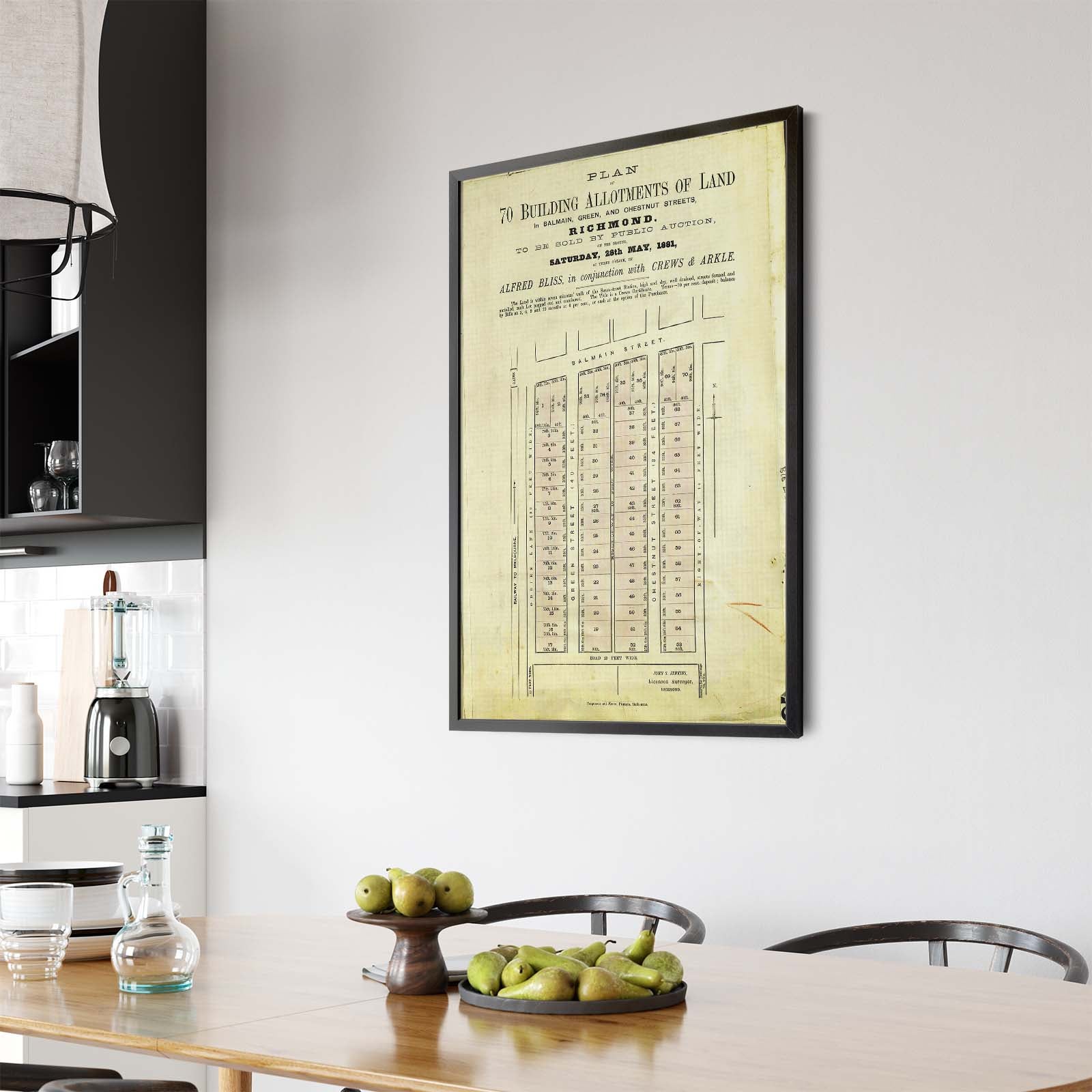 Recently moving to Harcourt and being interested in the history of the area, it seemed fitting to purchase a vintage map of the area which is displayed on our kitchen wall for us to study easily, identifying the block of land we bought. Nicely framed too.