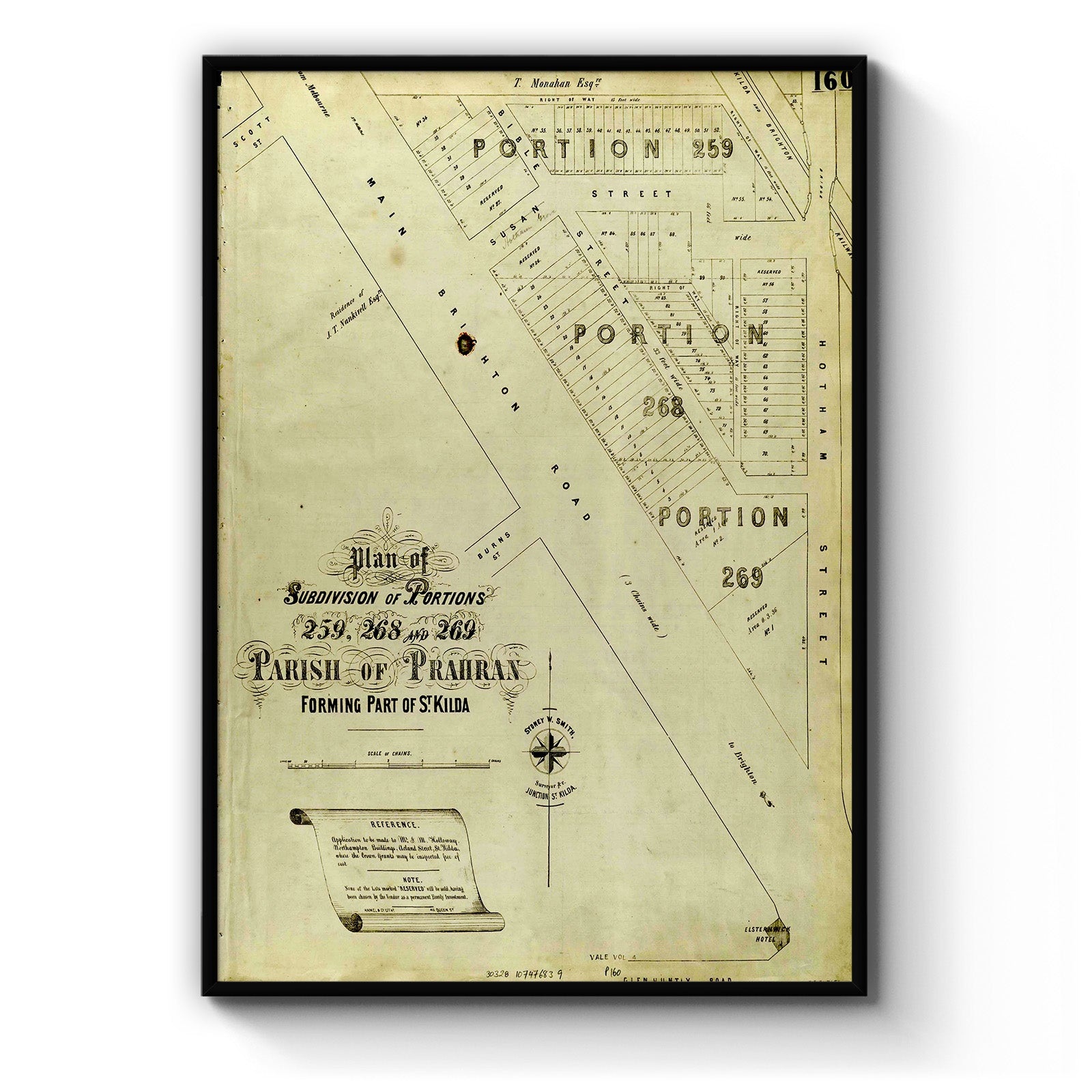 Plan of subdivision of portions 259, 268 and 269, parish of Prahran, forming part of St. Kilda [cartographic material]./ Syndey W. Smith, Surveyor & C., St. Kilda. 186-?] Inludes a map reference and note.