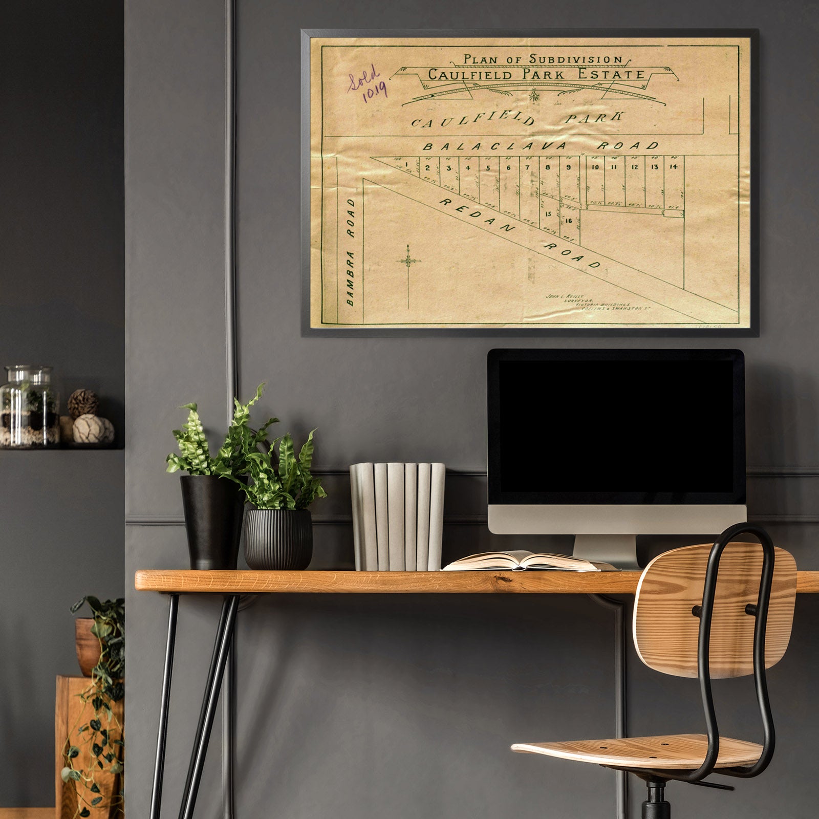 Recently moving to Harcourt and being interested in the history of the area, it seemed fitting to purchase a vintage map of the area which is displayed on our kitchen wall for us to study easily, identifying the block of land we bought. Nicely framed too.