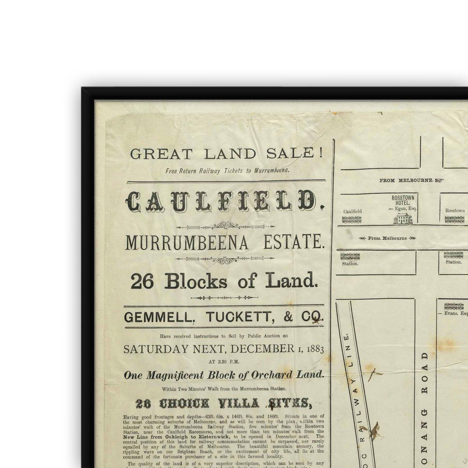 Includes a detailed newspaper advertisement of auction information, location of the sugar works, Murrumbeena station, Rosstown station, Caulfield Station and prominent residents.