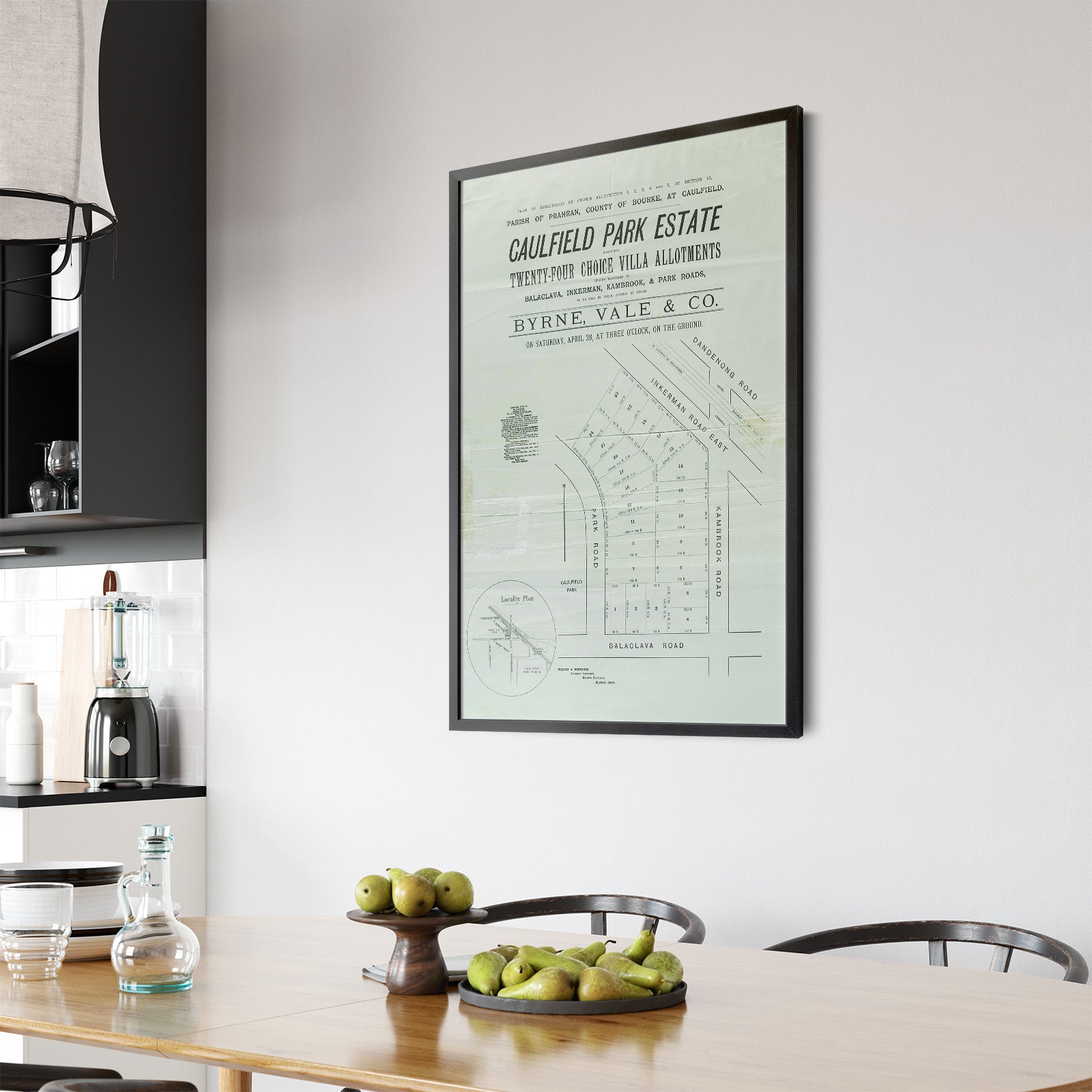 Recently moving to Harcourt and being interested in the history of the area, it seemed fitting to purchase a vintage map of the area which is displayed on our kitchen wall for us to study easily, identifying the block of land we bought. Nicely framed too.