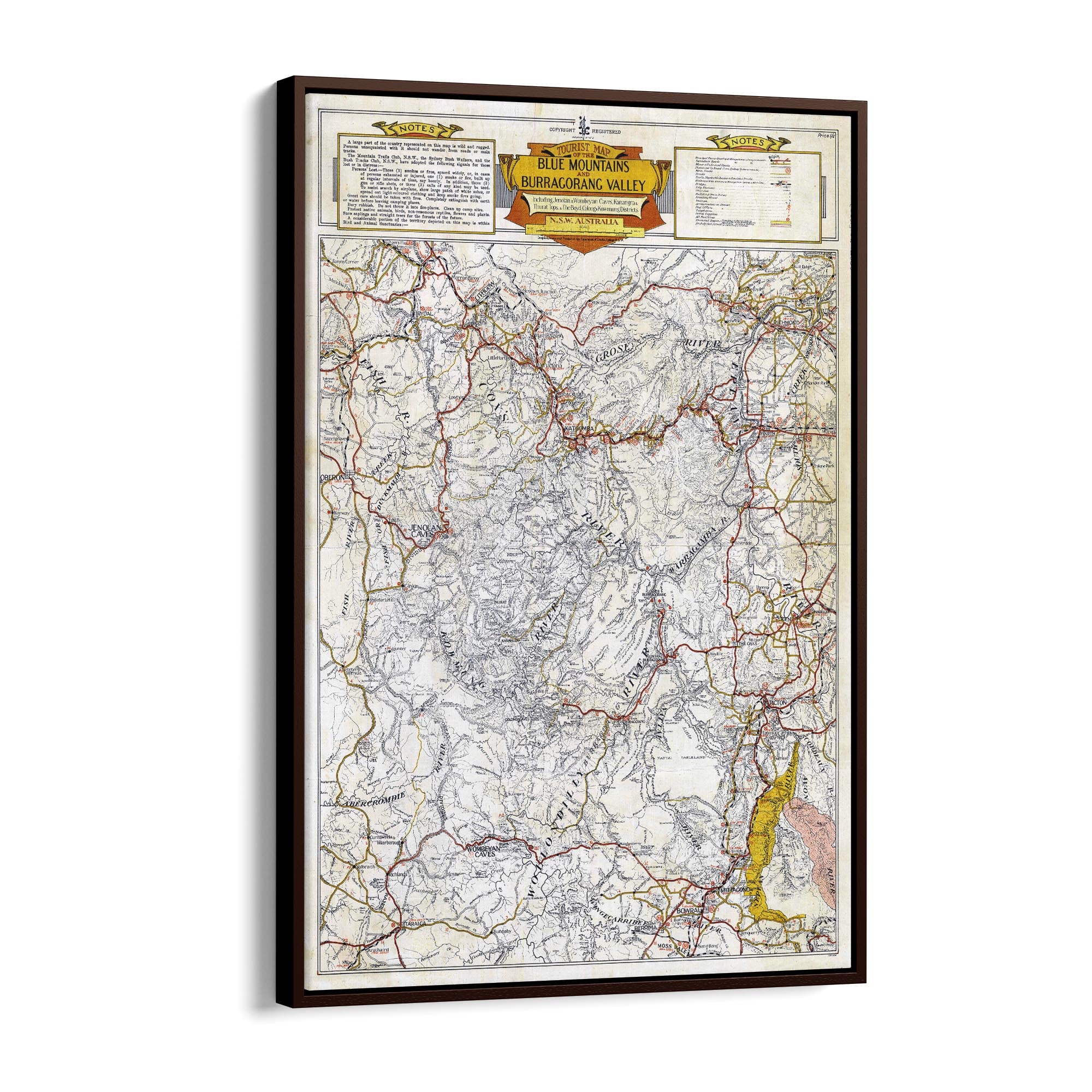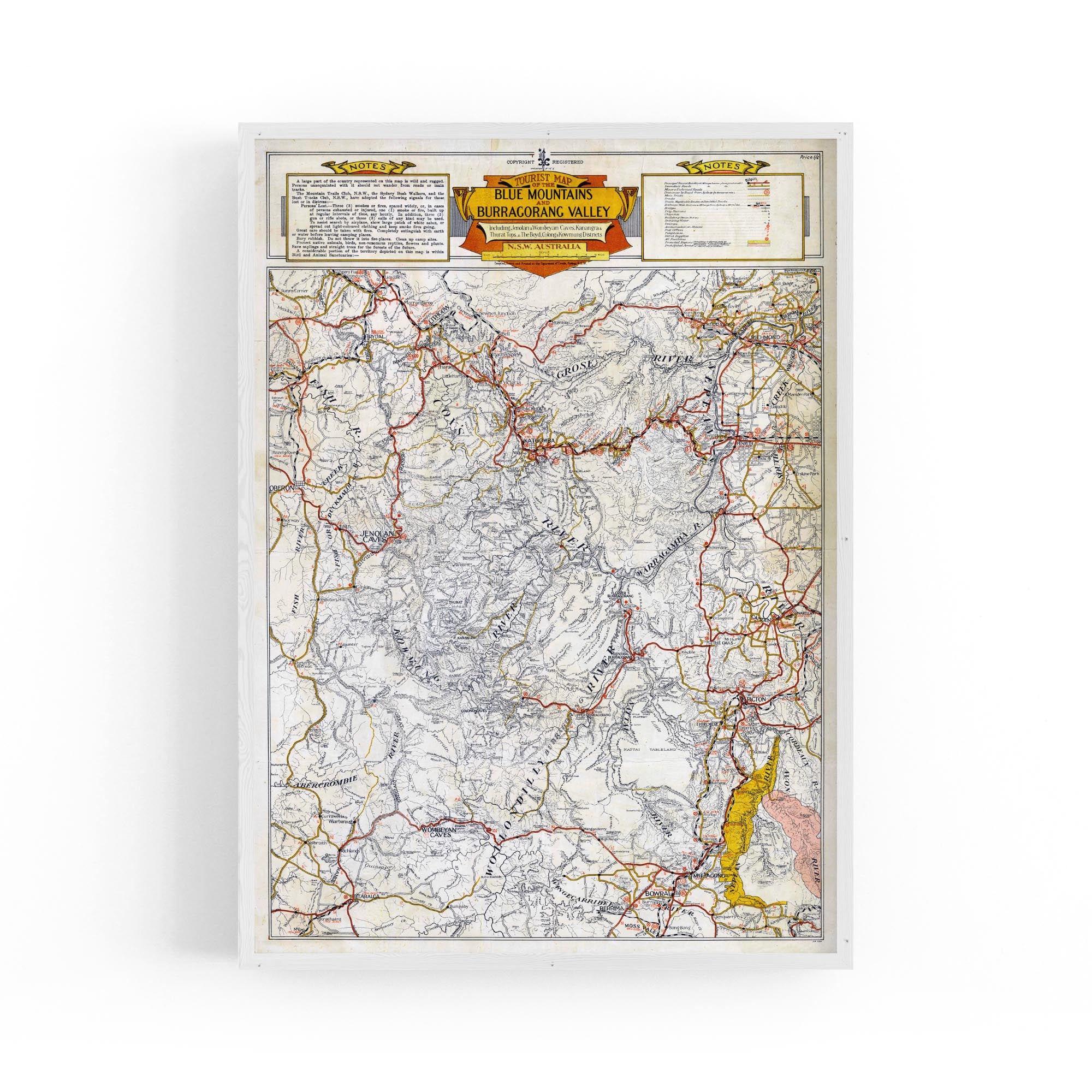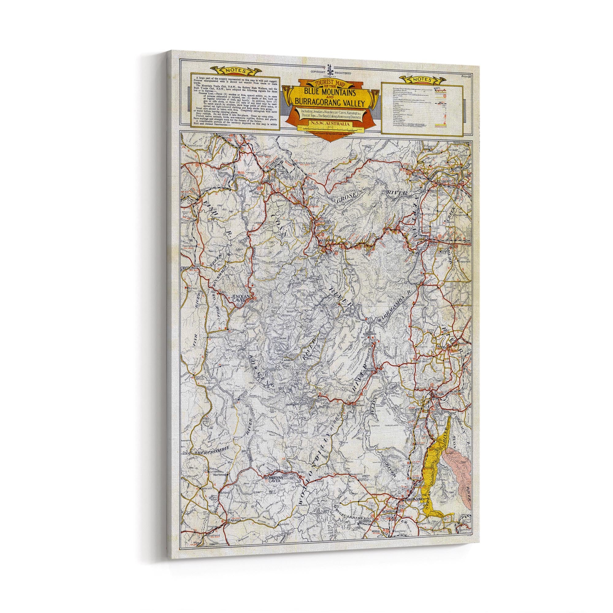 Tourist Map of Blue Mountains and Burragorang Valley, New South Wales, including Jenolan and Wombeyan Caves, Kanangra and Thurat Tops, and The Boyd, Colong, and Kowmung Districts of New South Wales. Shows roads, tracks, railways and buildings. Relief shown by hachures and elementary mountain drawing.
