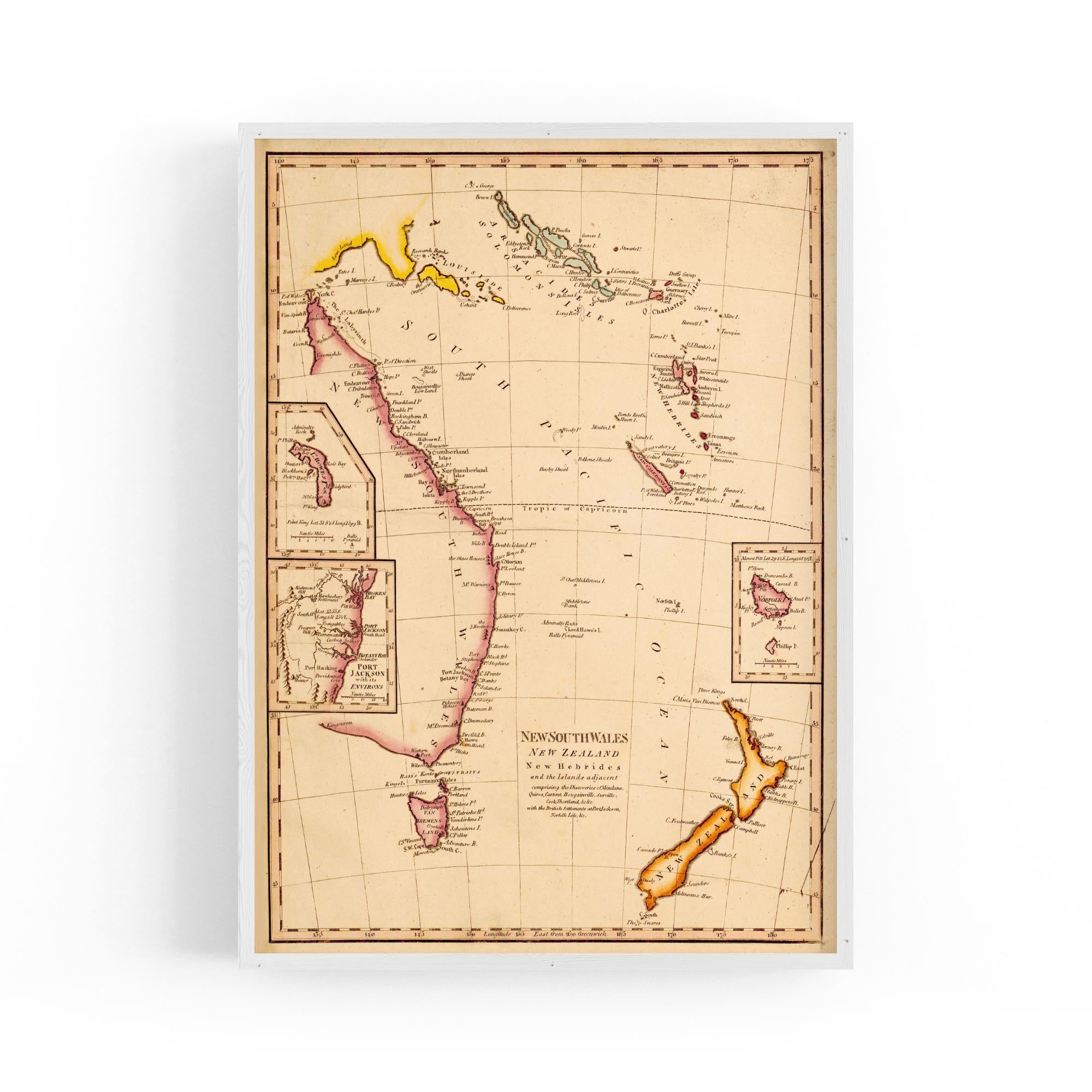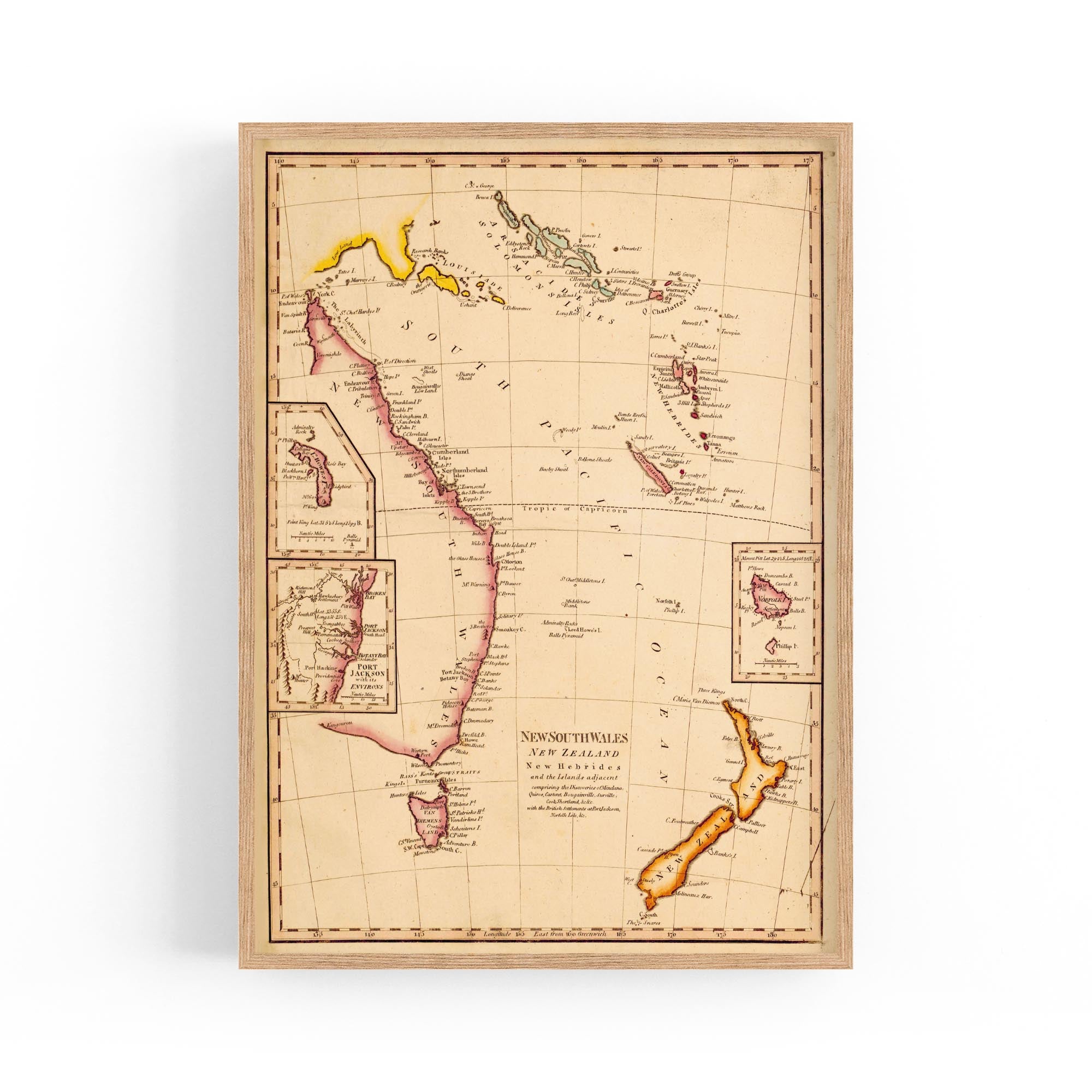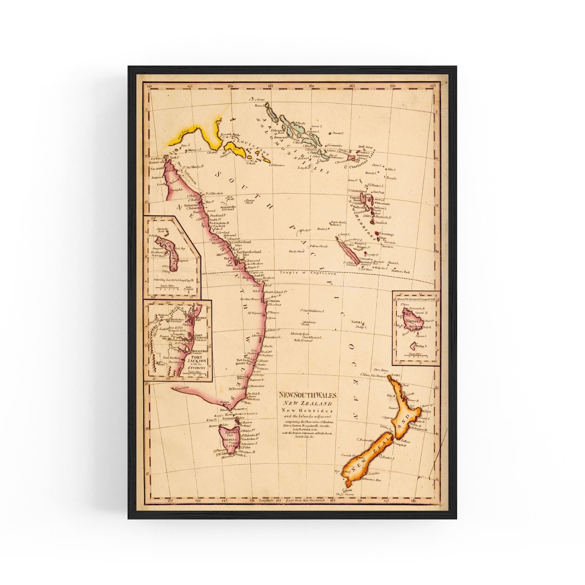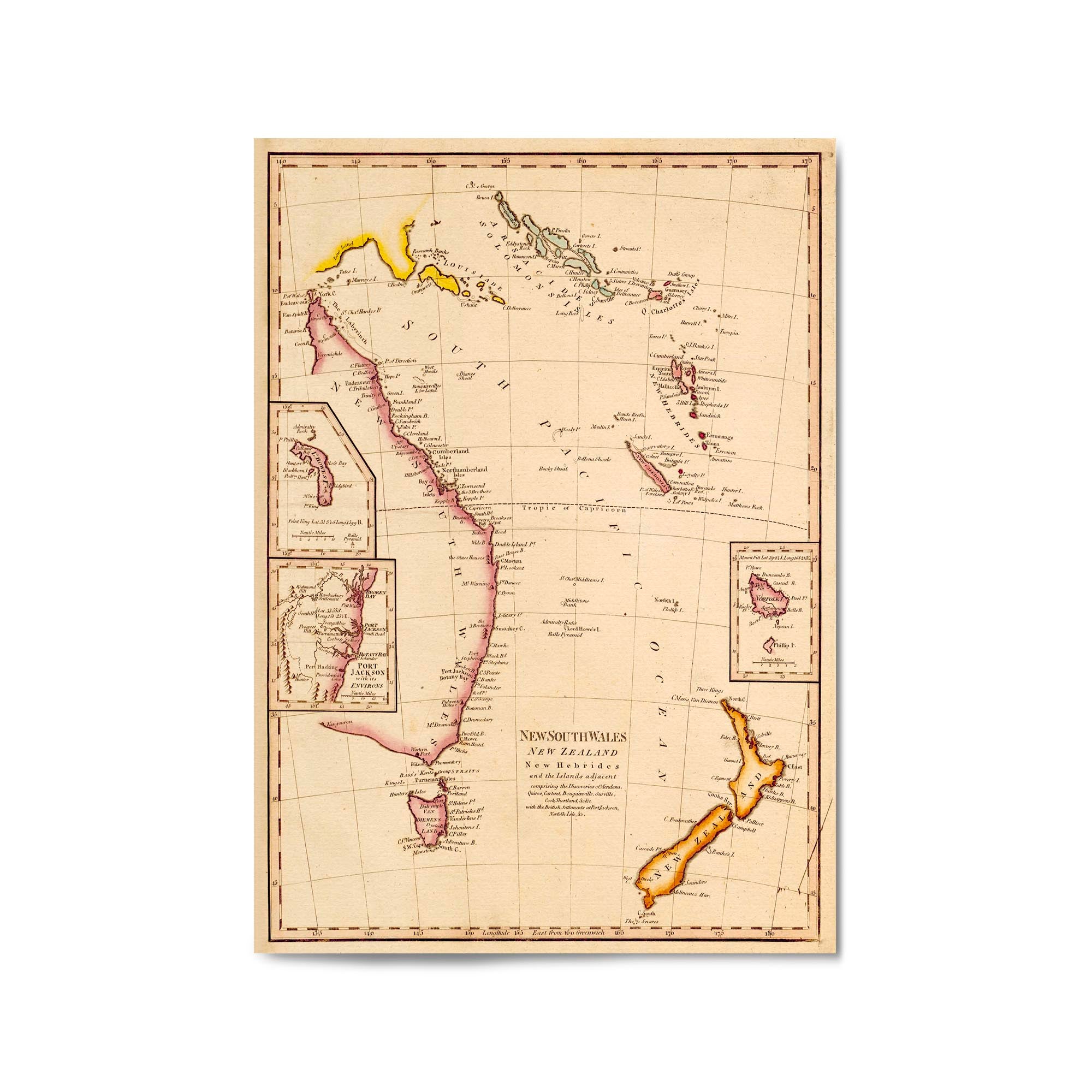 New South Wales, New Zealand, New Hebrides & New Caledonia and the islands adjacent, comprising the discoveries of Mendana, Quiros, Cartaret, Bouganville, Surville, Cook, Shortland with the British settlements at Port Jackson, Norfolk Isle, etc.