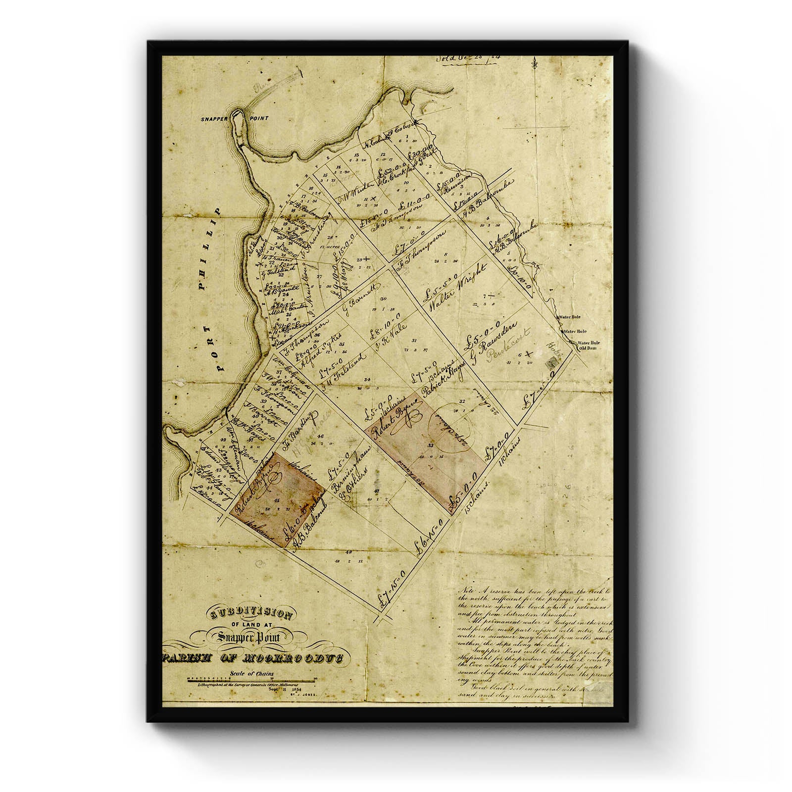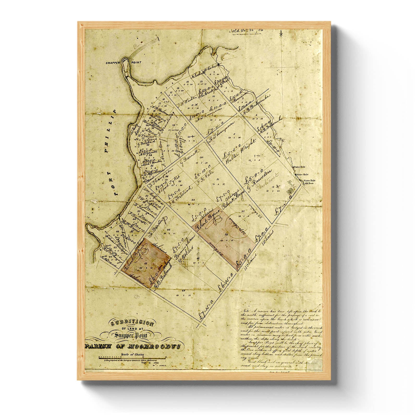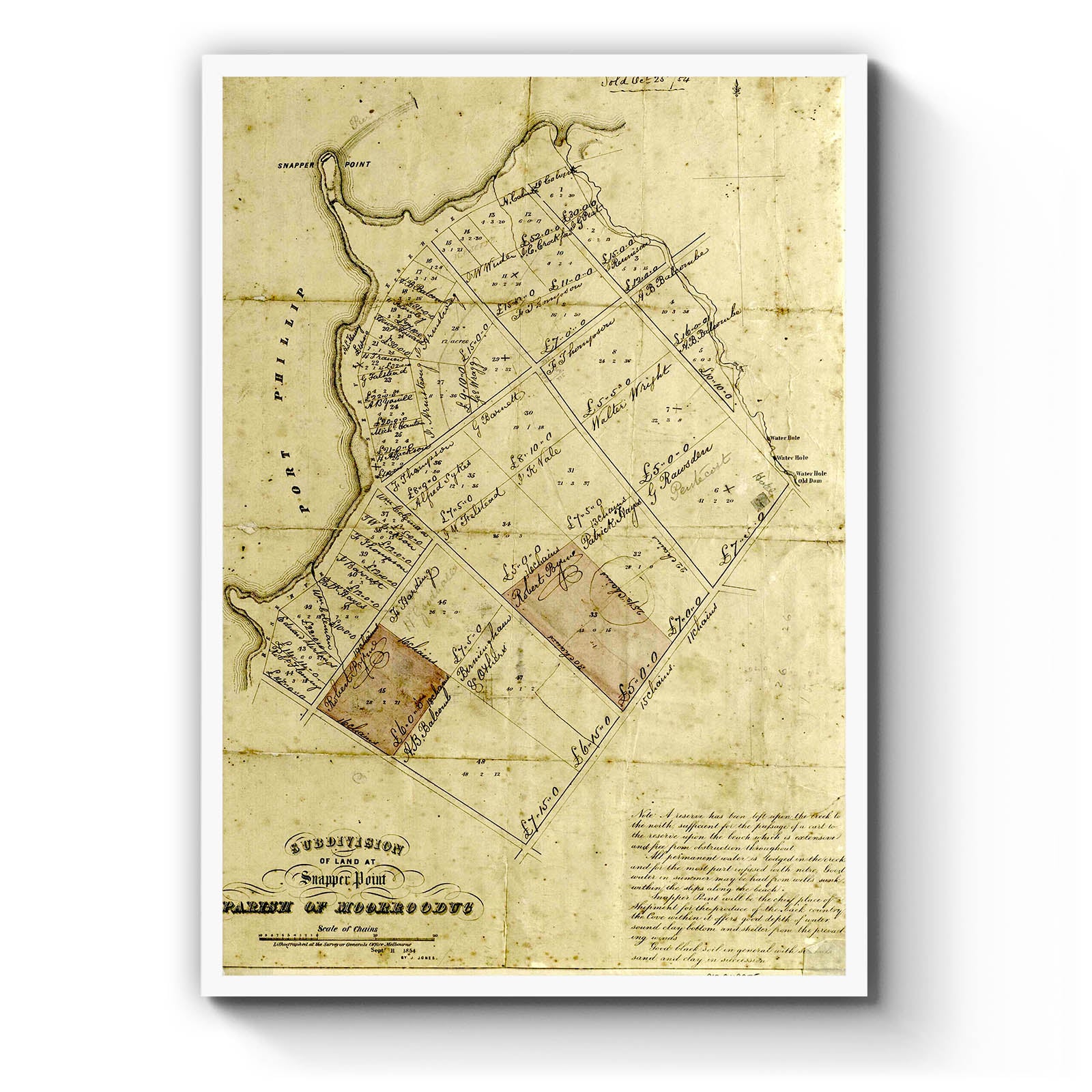 Subdivision of land at Snapper Point, Parish of Moorrooduc. Lithographed at the Surveyor General's Office, Melbourne, Septr. 11, 1854, by J. Jones. 1854 Includes a detailed note regarding the topography of the area. Port Phillip Bay.