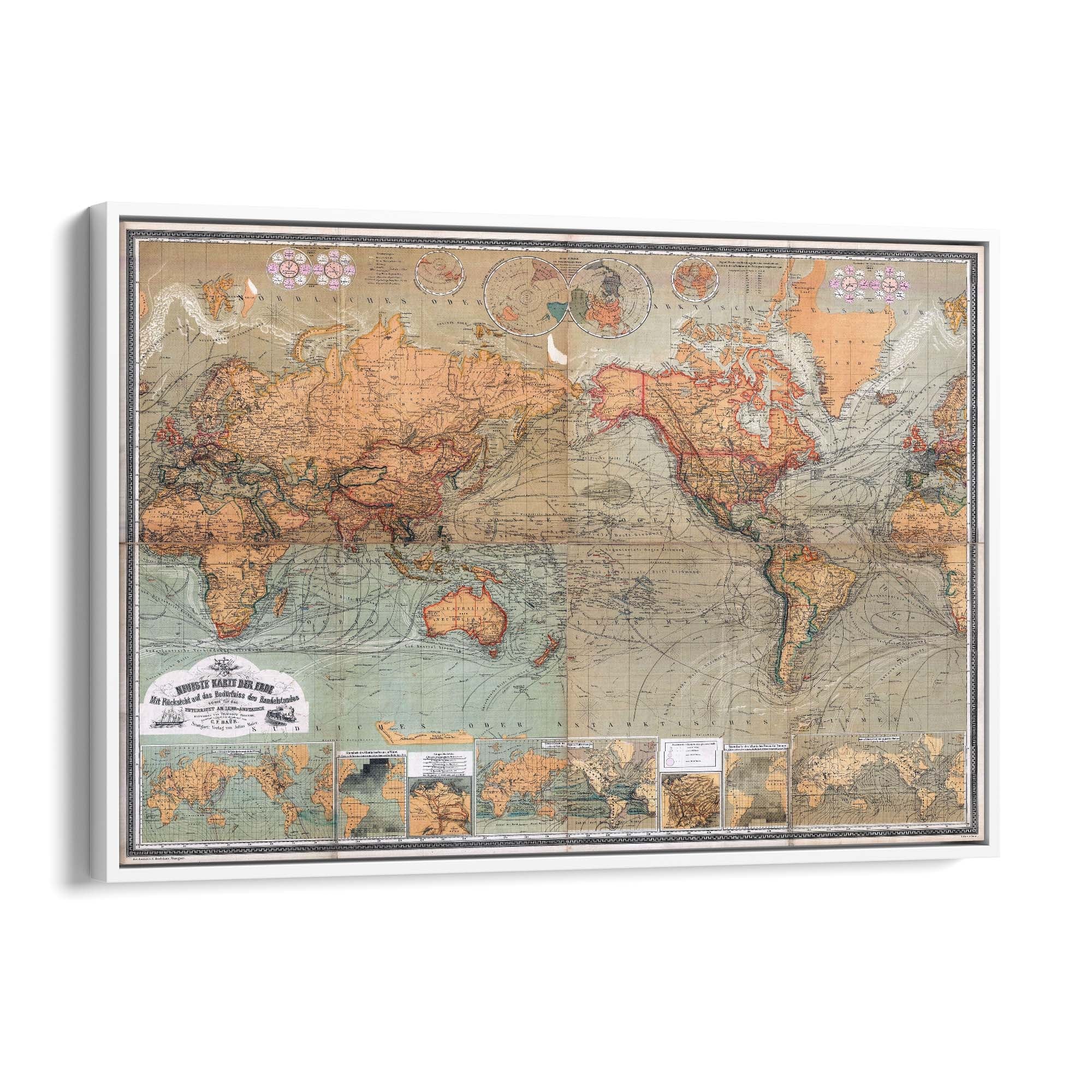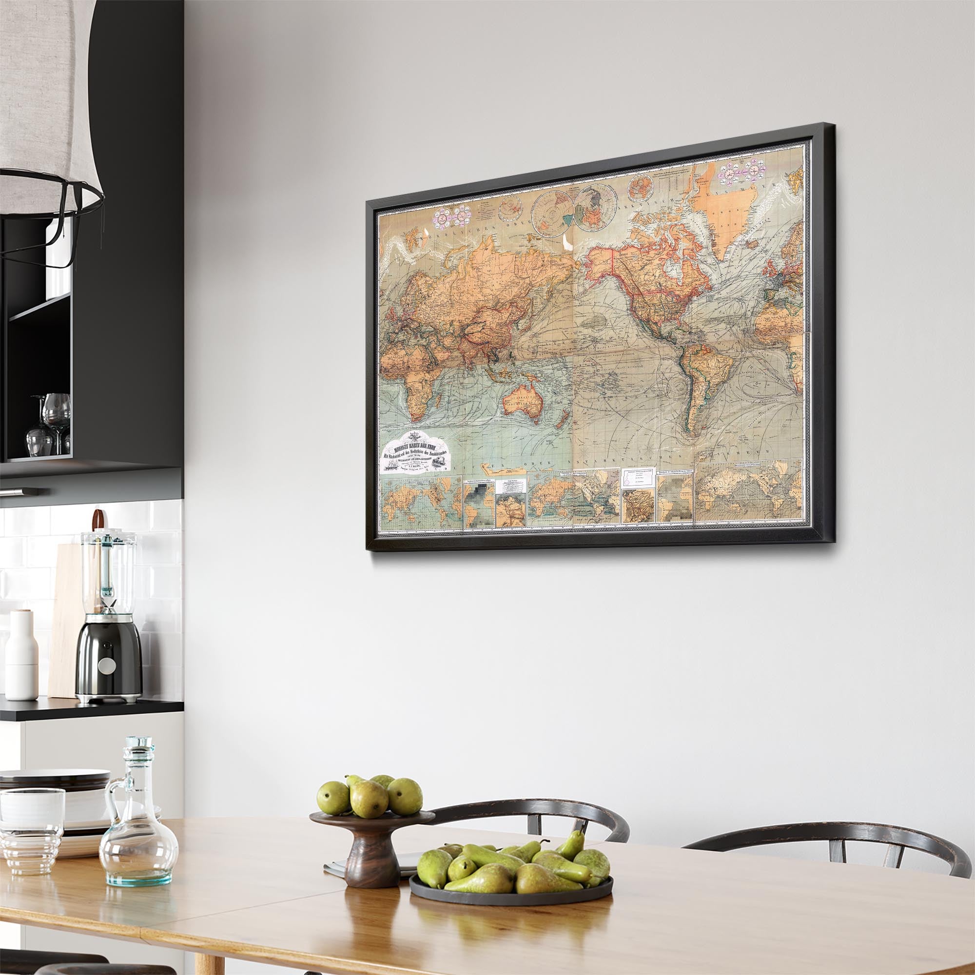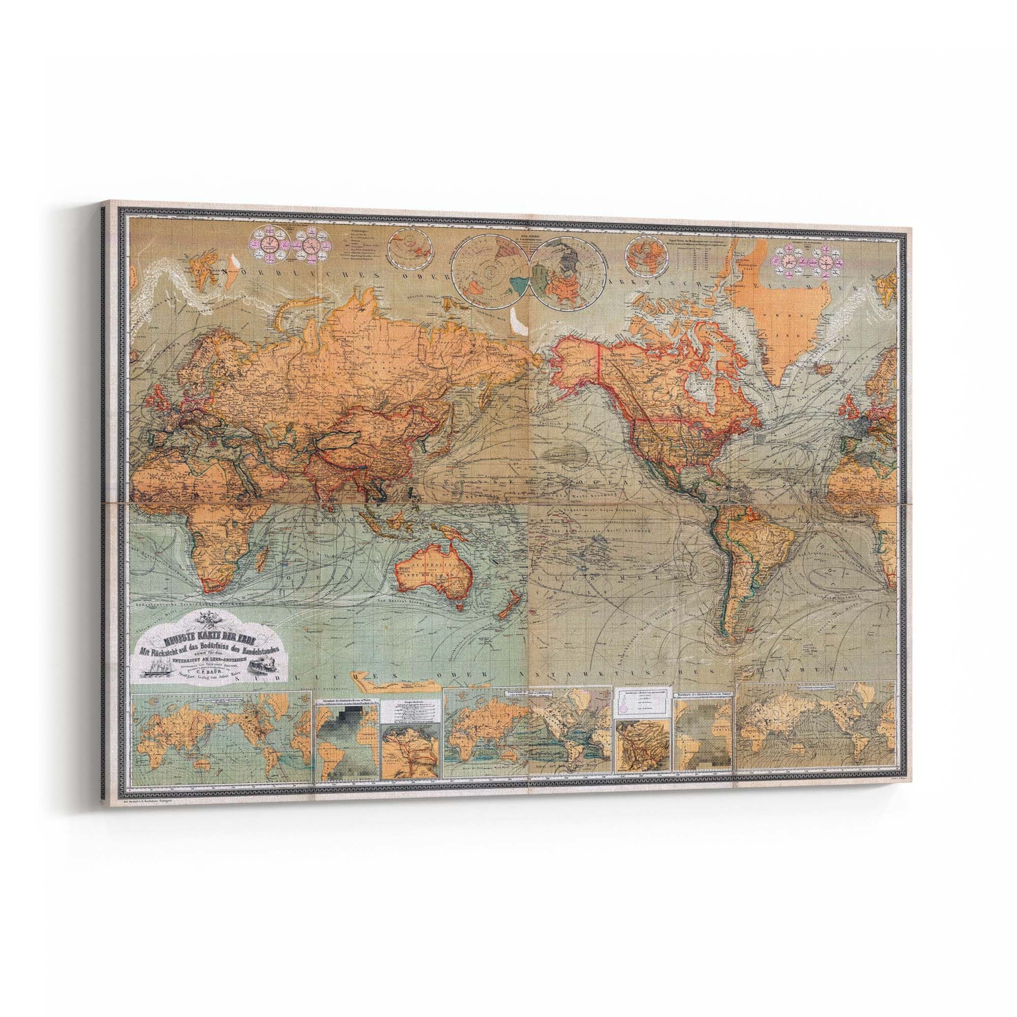 The border regions of the map are occupied by a series of smaller maps and charts including polar projections, an isothermal chart, a winds chart, an inset of Panama and Suez, two weather charts, and a magnetic variation chart. The title cartouche, appearing in the lower left quadrant shows a shop and a train as well as a curious logo that seems to embrace the realms of navigation and science.