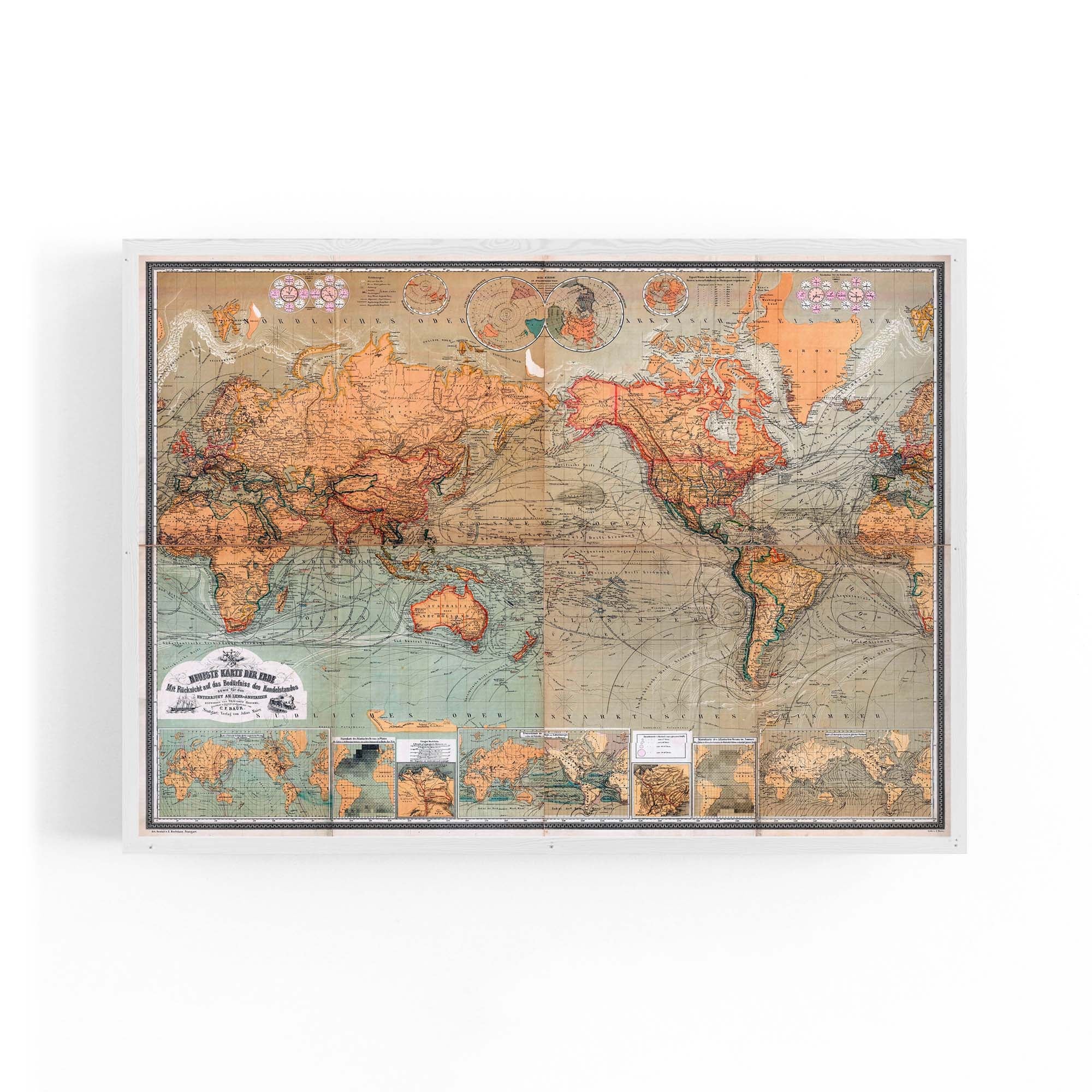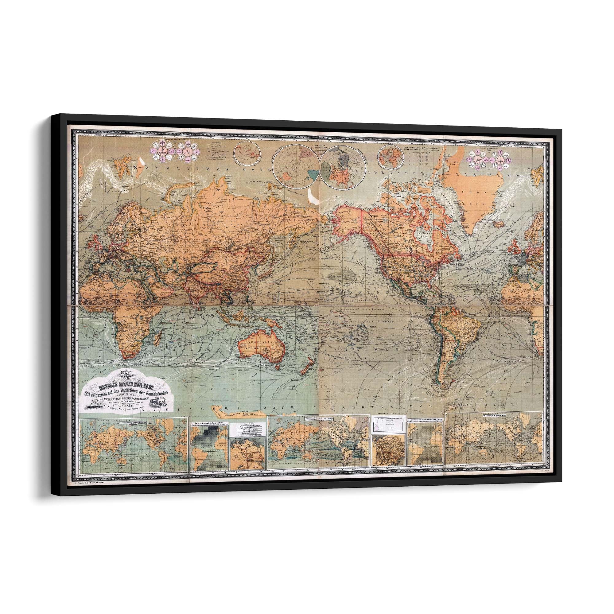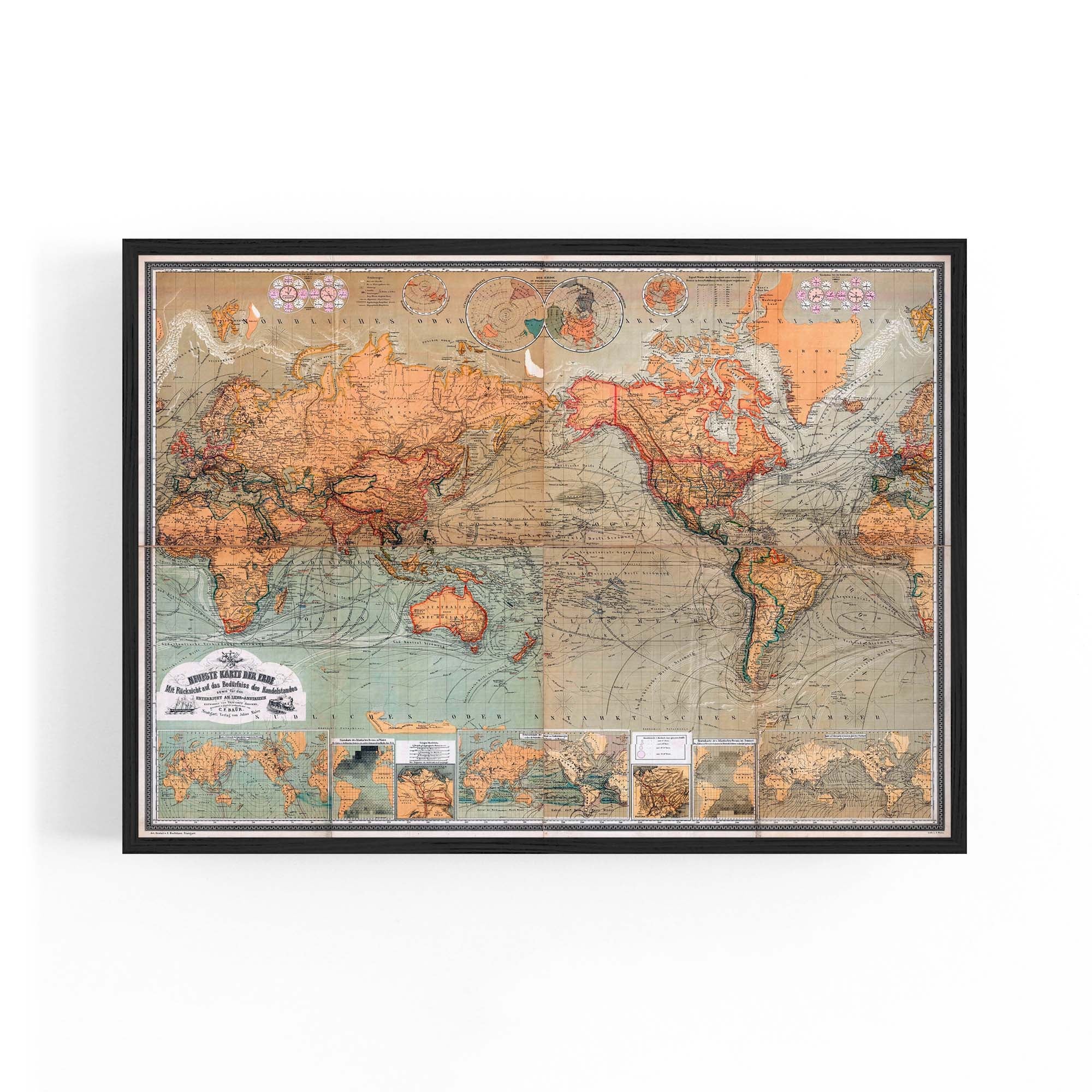 The border regions of the map are occupied by a series of smaller maps and charts including polar projections, an isothermal chart, a winds chart, an inset of Panama and Suez, two weather charts, and a magnetic variation chart. The title cartouche, appearing in the lower left quadrant shows a shop and a train as well as a curious logo that seems to embrace the realms of navigation and science.