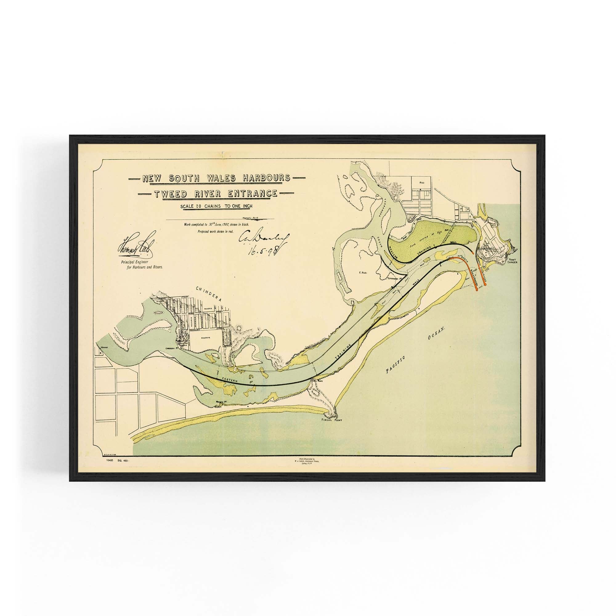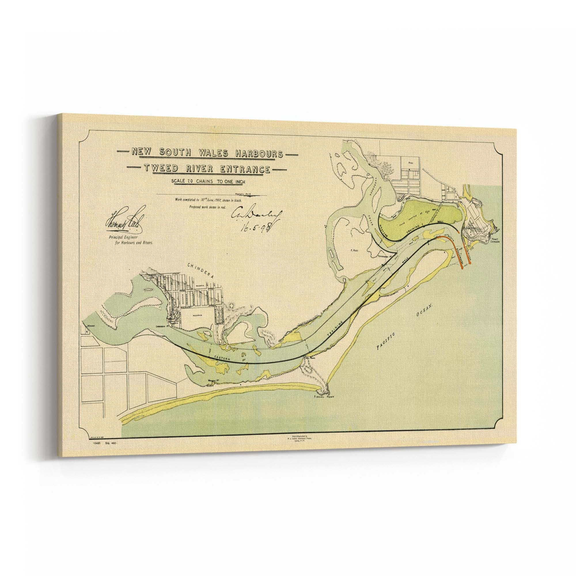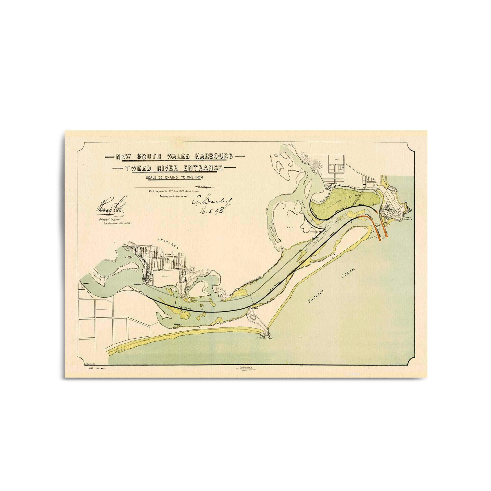 Map of the Tweed River entrance, New South Wales, showing depths and mudflats which are coloured brown, and existing breakwaters. Shows townships and plans of the towns of Chinderah and Tweed Heads, New South Wales, and Coolangatta, Queensland, with allotments, marked, and improvement works headed by Thomas William Keele, the Principal Engineer of the New South Wales Harbours and Rivers Branch. Relief is shown by hachures.