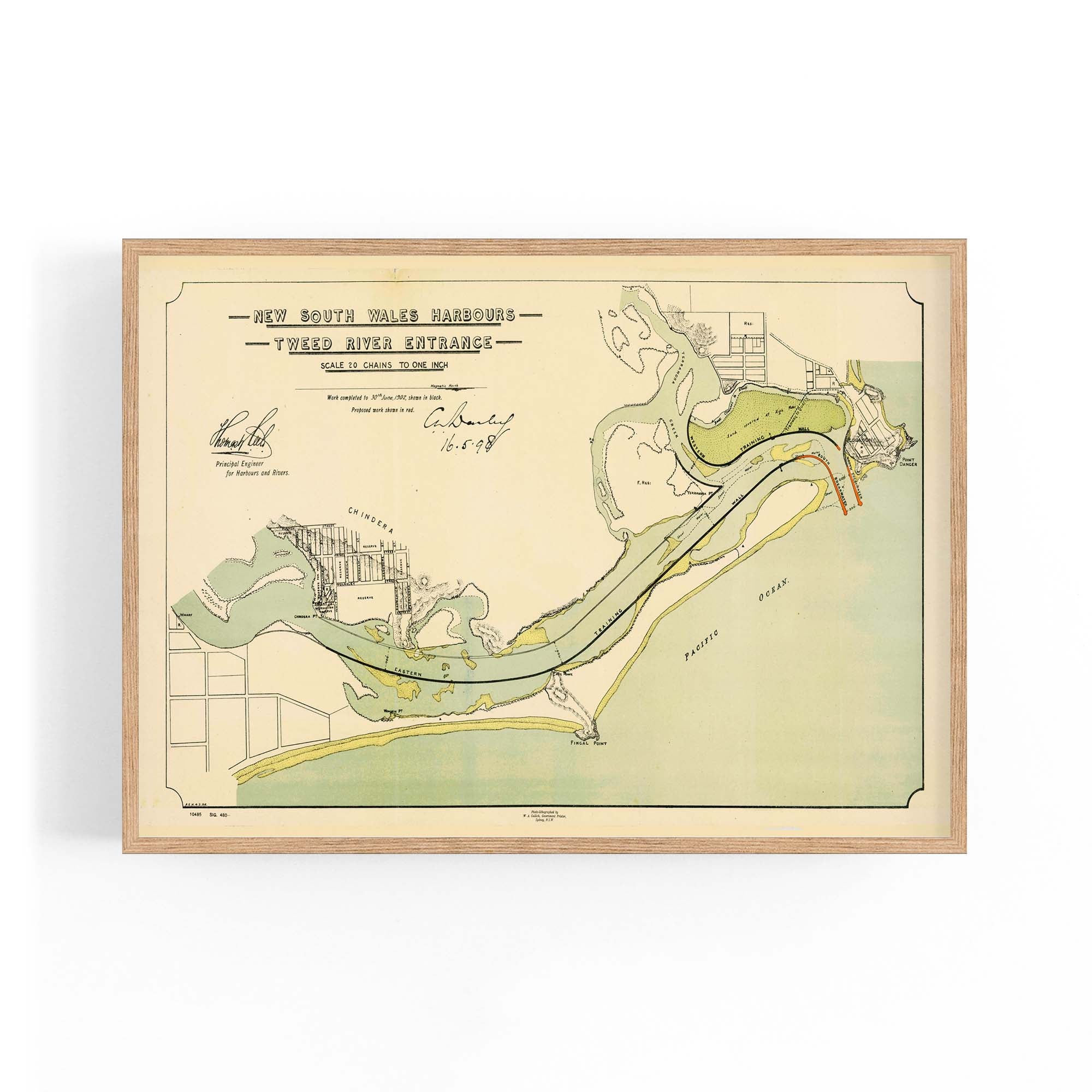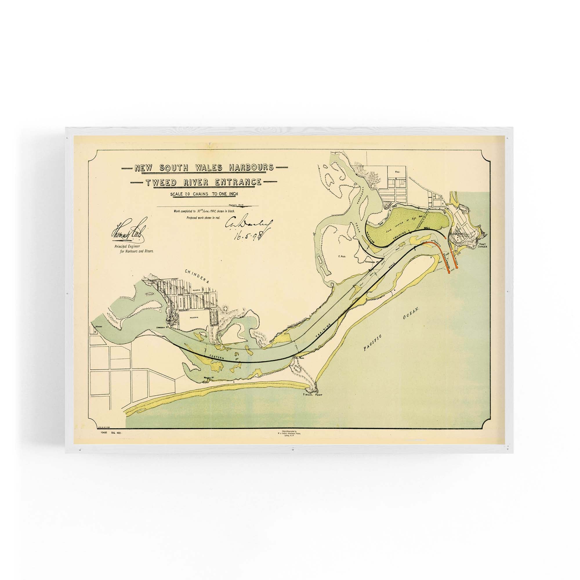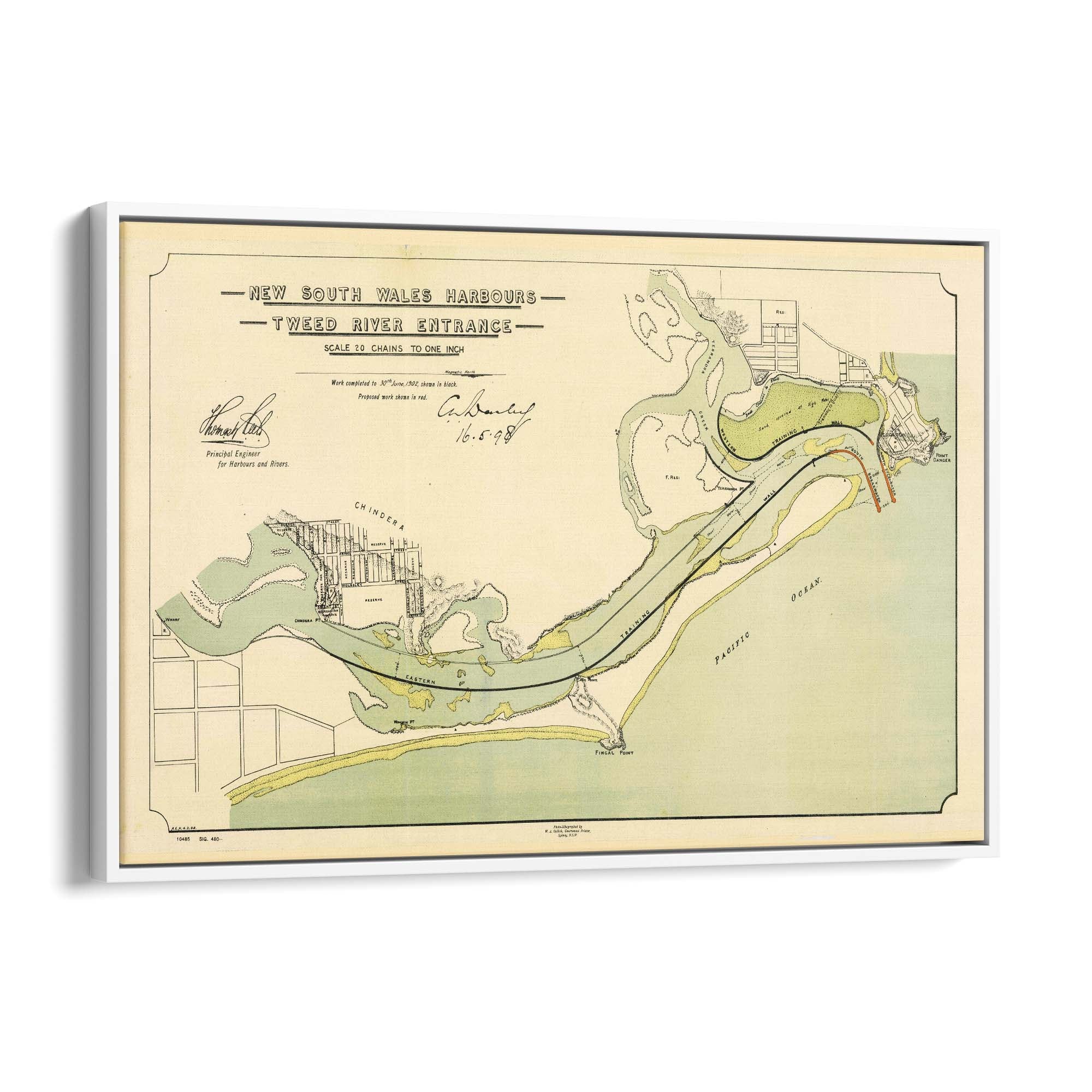 Map of the Tweed River entrance, New South Wales, showing depths and mudflats which are coloured brown, and existing breakwaters. Shows townships and plans of the towns of Chinderah and Tweed Heads, New South Wales, and Coolangatta, Queensland, with allotments, marked, and improvement works headed by Thomas William Keele, the Principal Engineer of the New South Wales Harbours and Rivers Branch. Relief is shown by hachures.