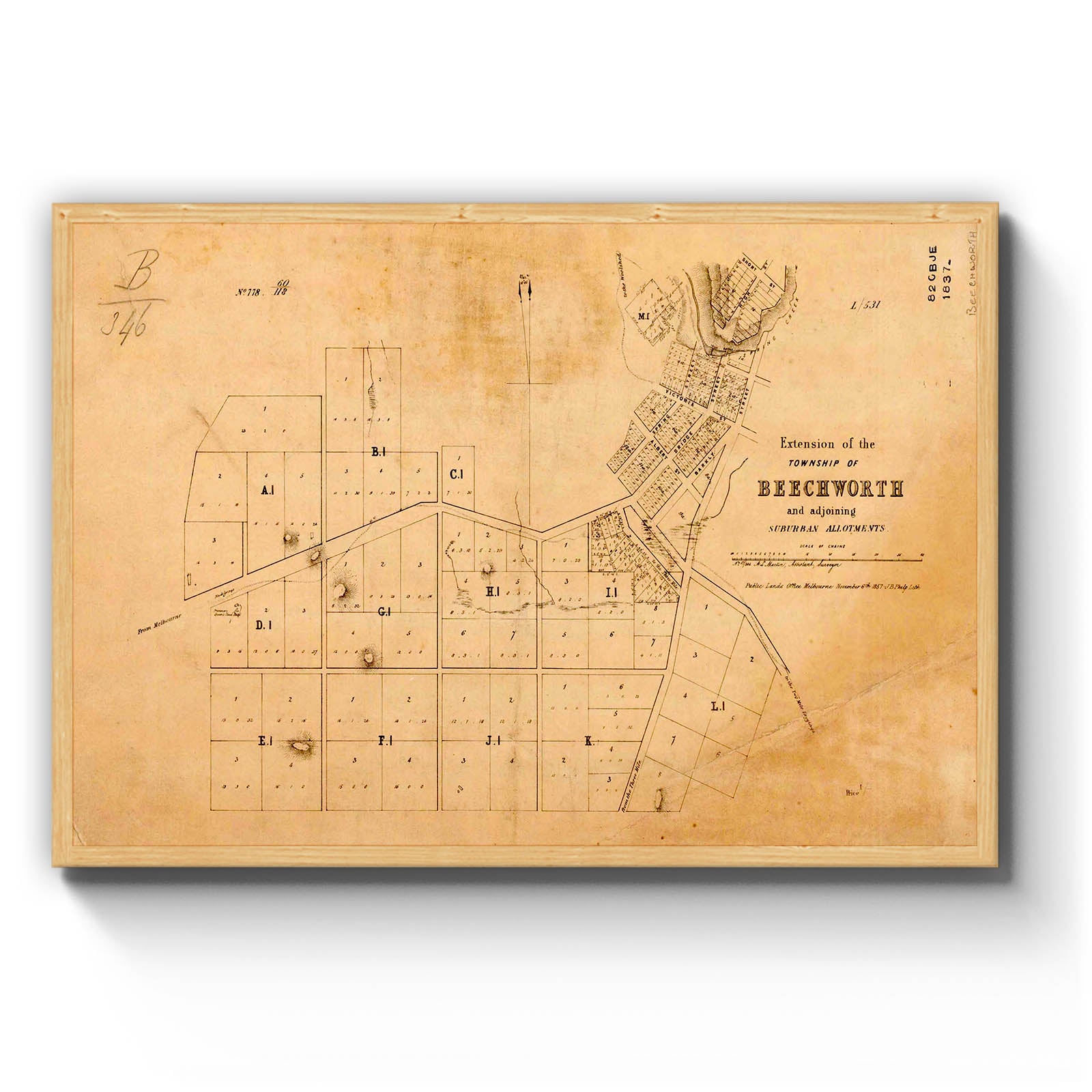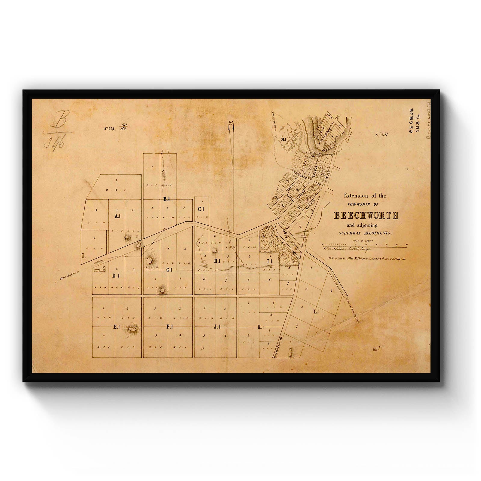 Extension of the Township of Beechworth and adjoining suburban allotments [cartographic material]/ A. C. Martin, Assistant Surveyor ; Public Lands Office, Melbourne, November 6th 1857- J. B. Philp lith.