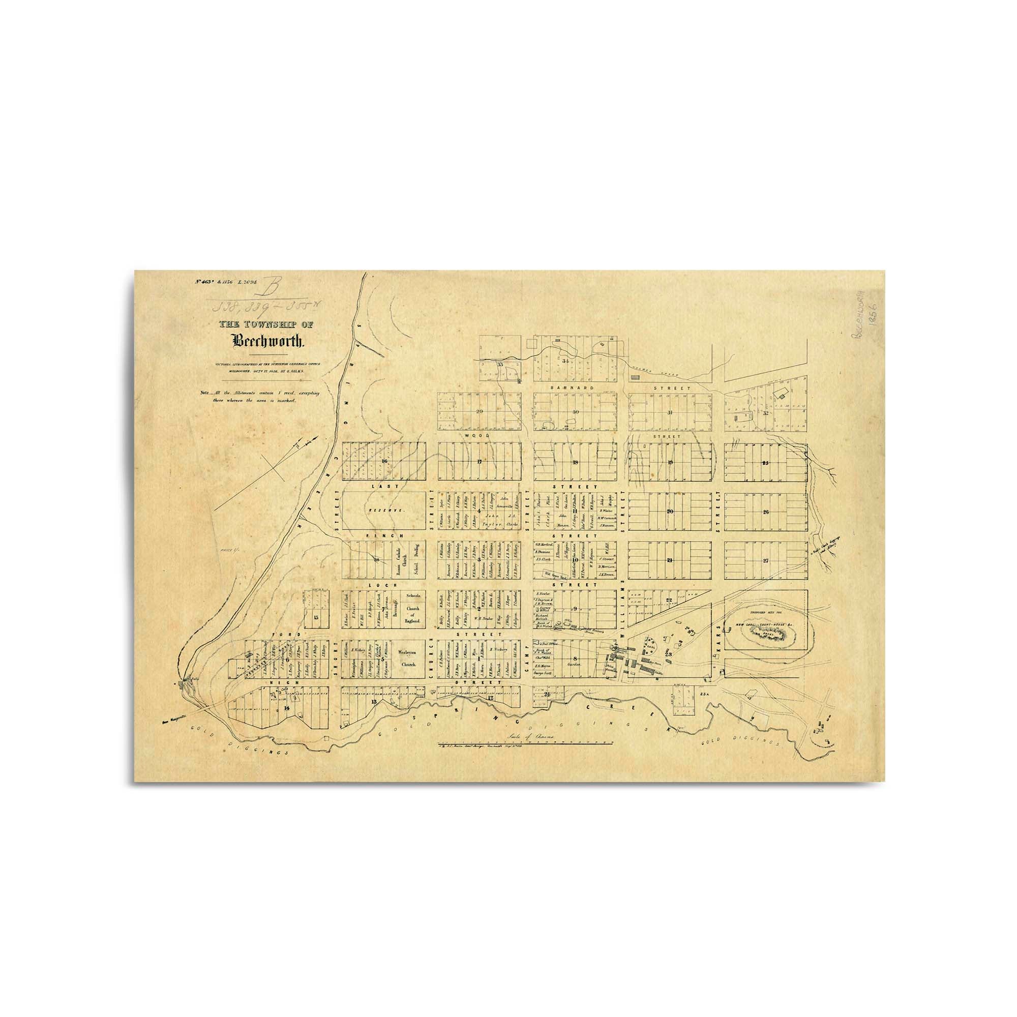 Township of Beechworth. N. F. Martin, Assist. Surveyor, Beechworth, August 20th, 1856. Lithographed at the Surveyors General's Office Melbourne, by E. Gilks. 1856