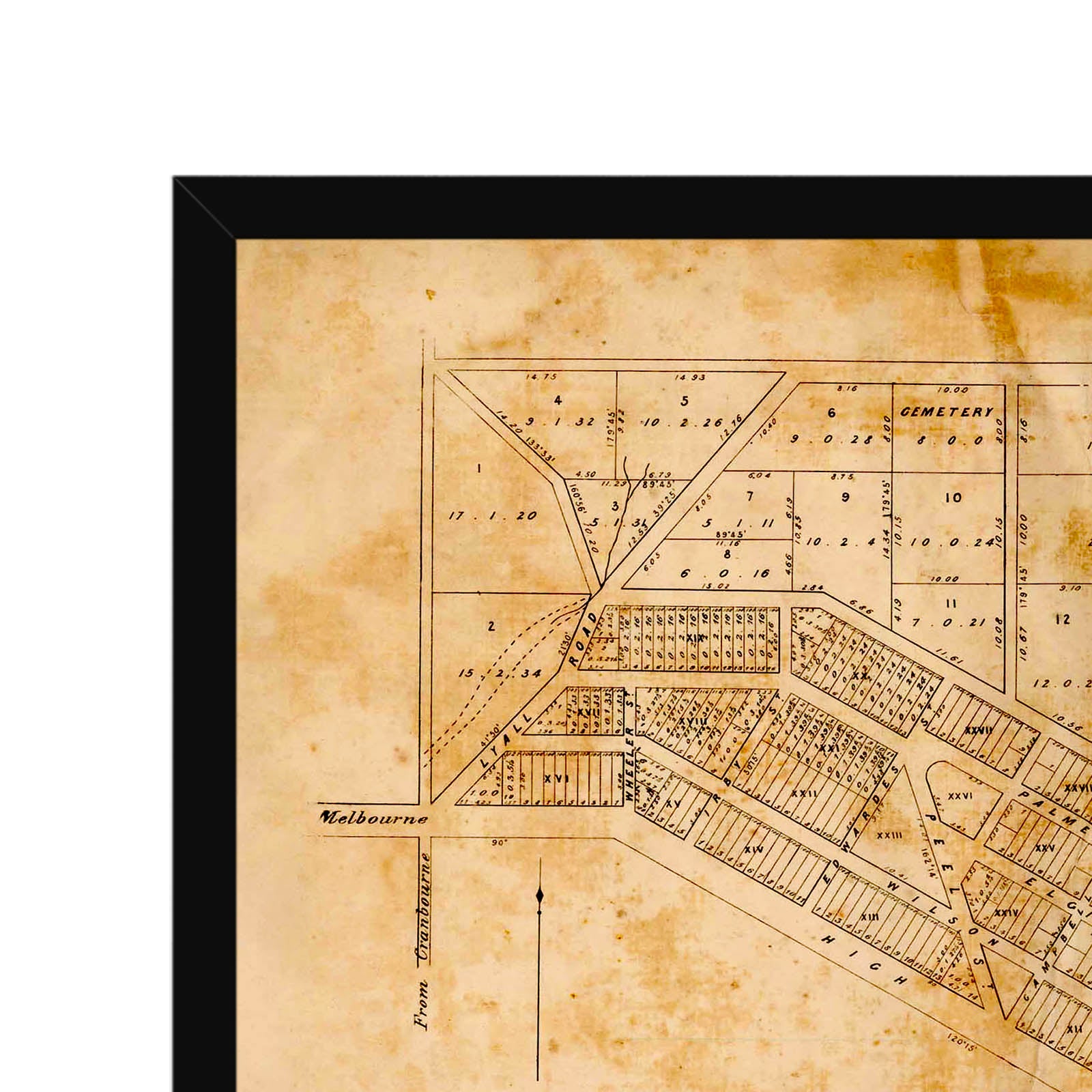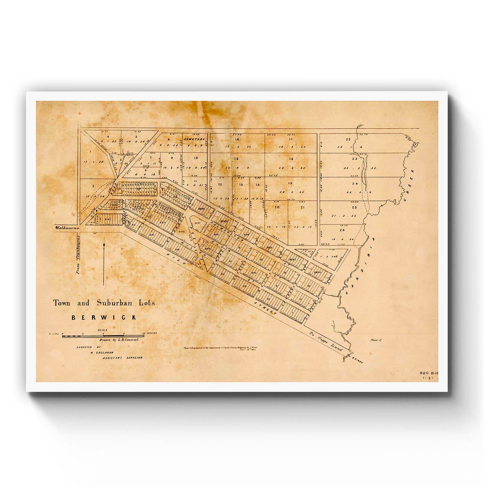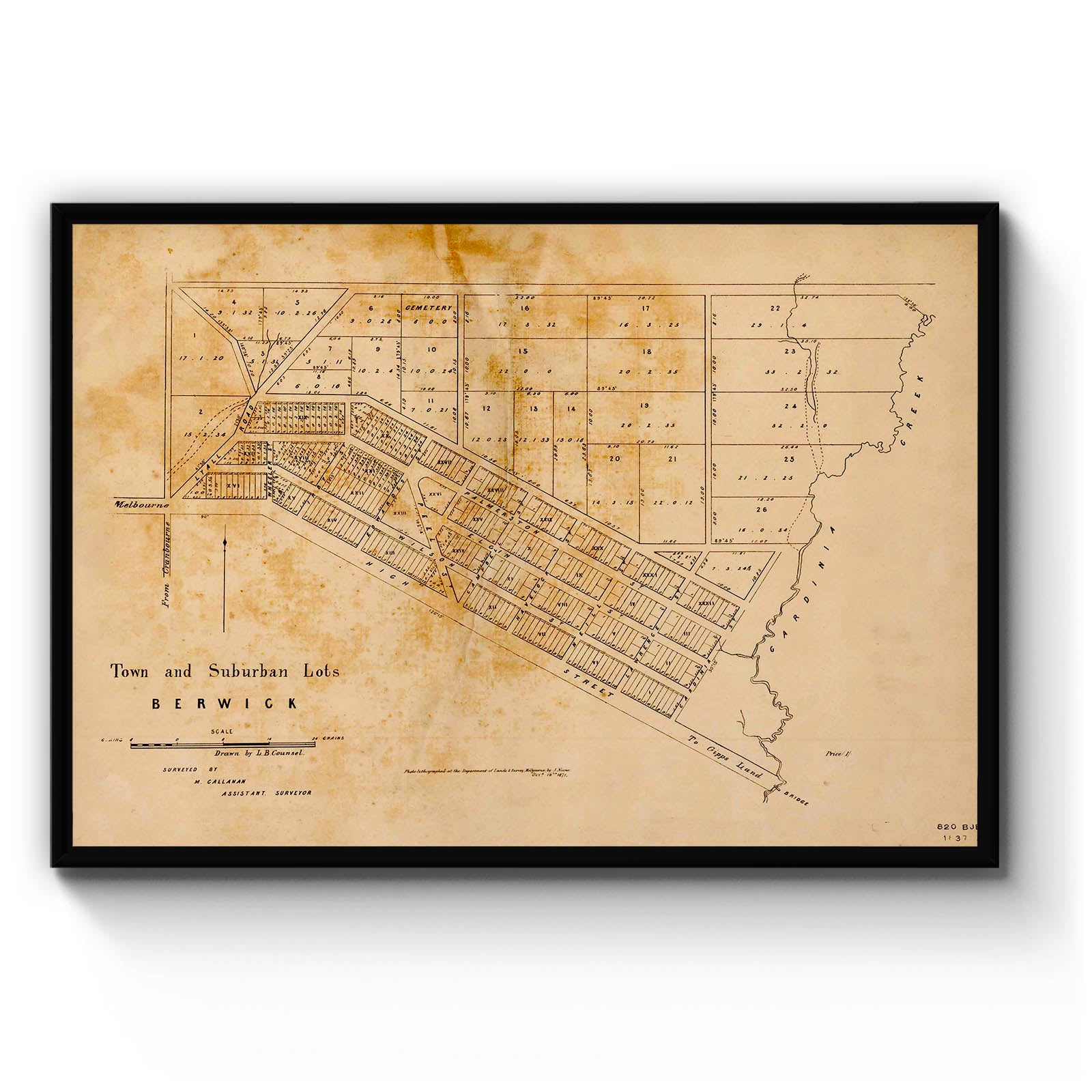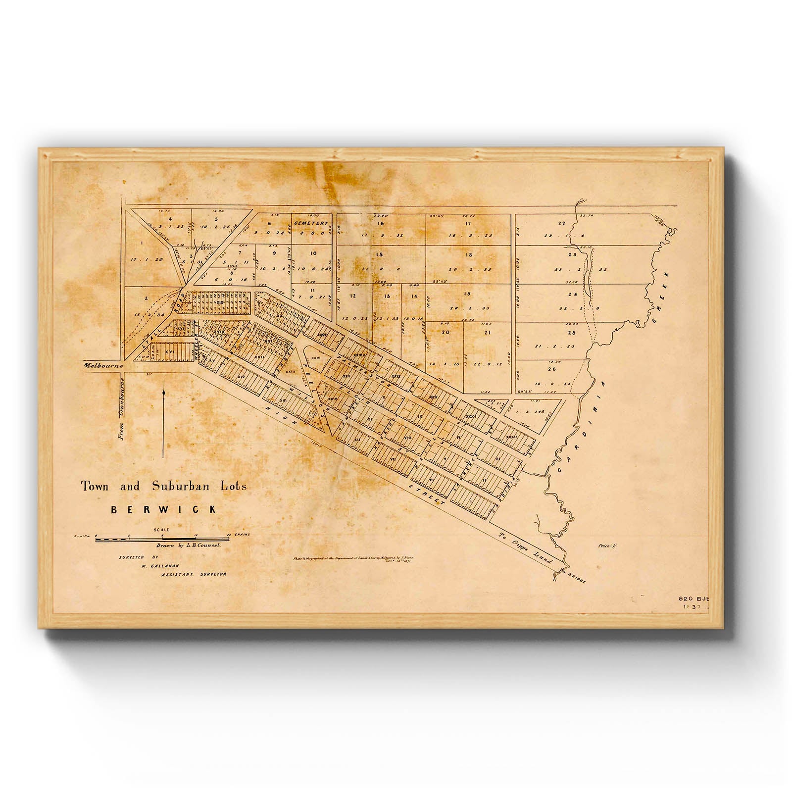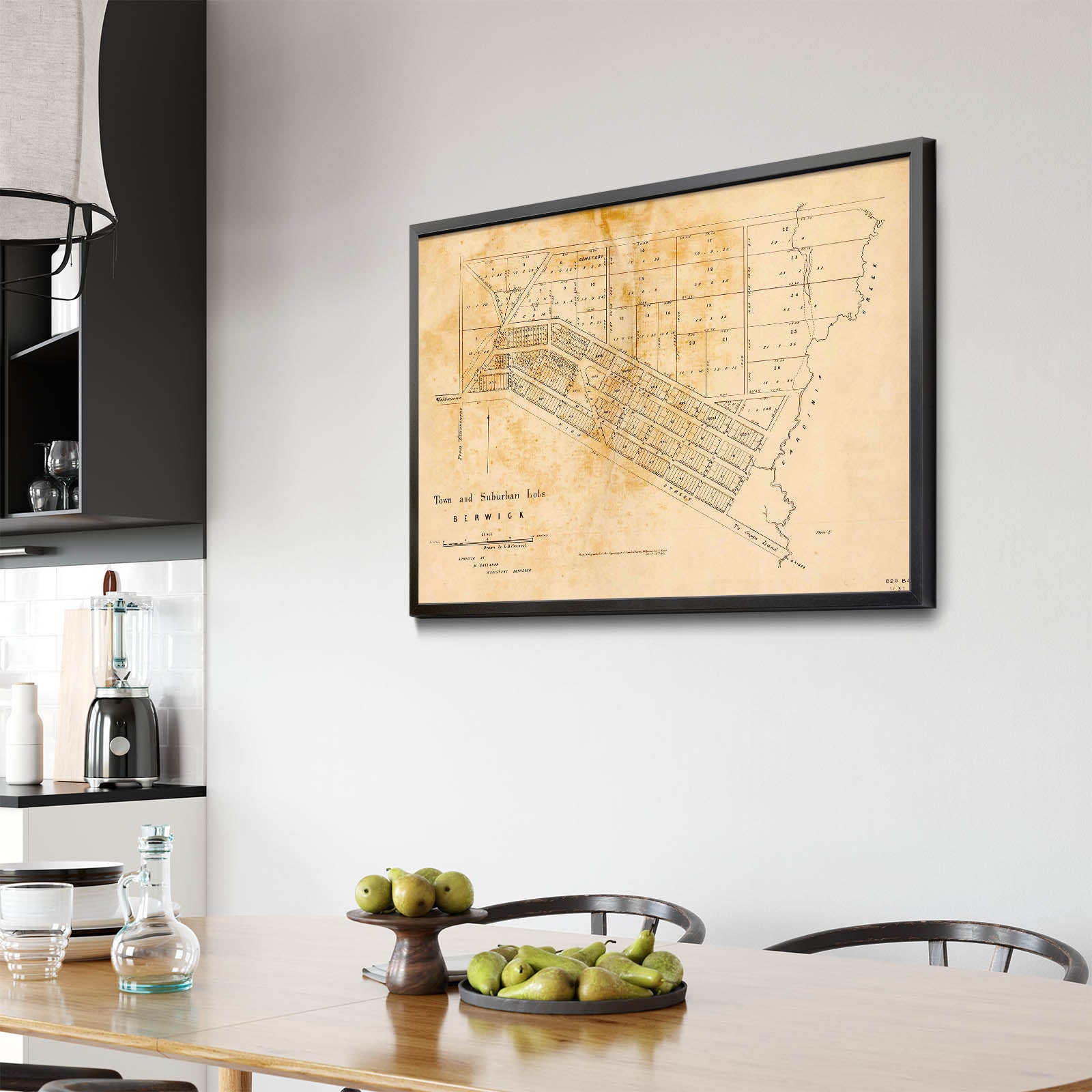 Recently moving to Harcourt and being interested in the history of the area, it seemed fitting to purchase a vintage map of the area which is displayed on our kitchen wall for us to study easily, identifying the block of land we bought. Nicely framed too.