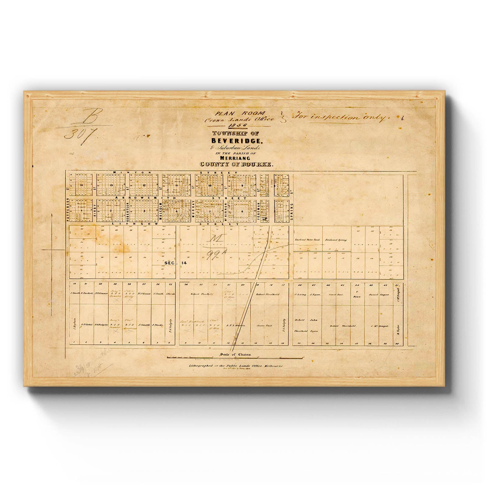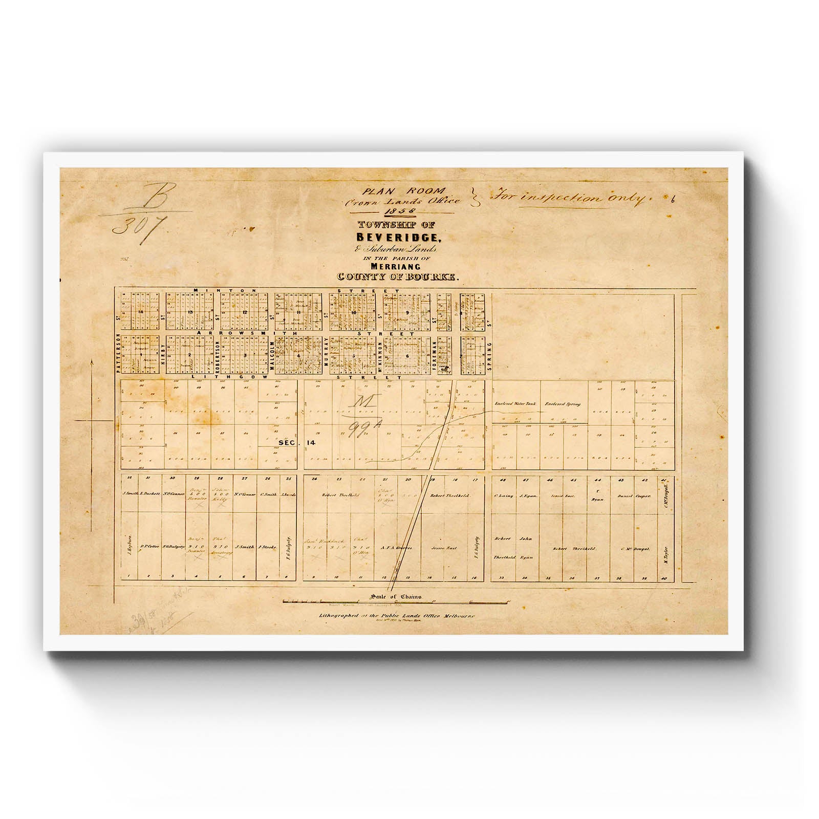 Township of Beveridge, & suburban lands in the Parish of Merriang, County of Bourke [cartographic material] / Robert Mason, Assistant Surveyor, 1858; lithographed at the Public Lands Office April 10th, 1858 by Thomas Ham. 1858.
