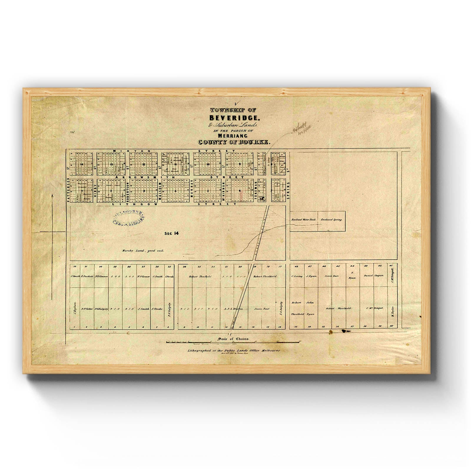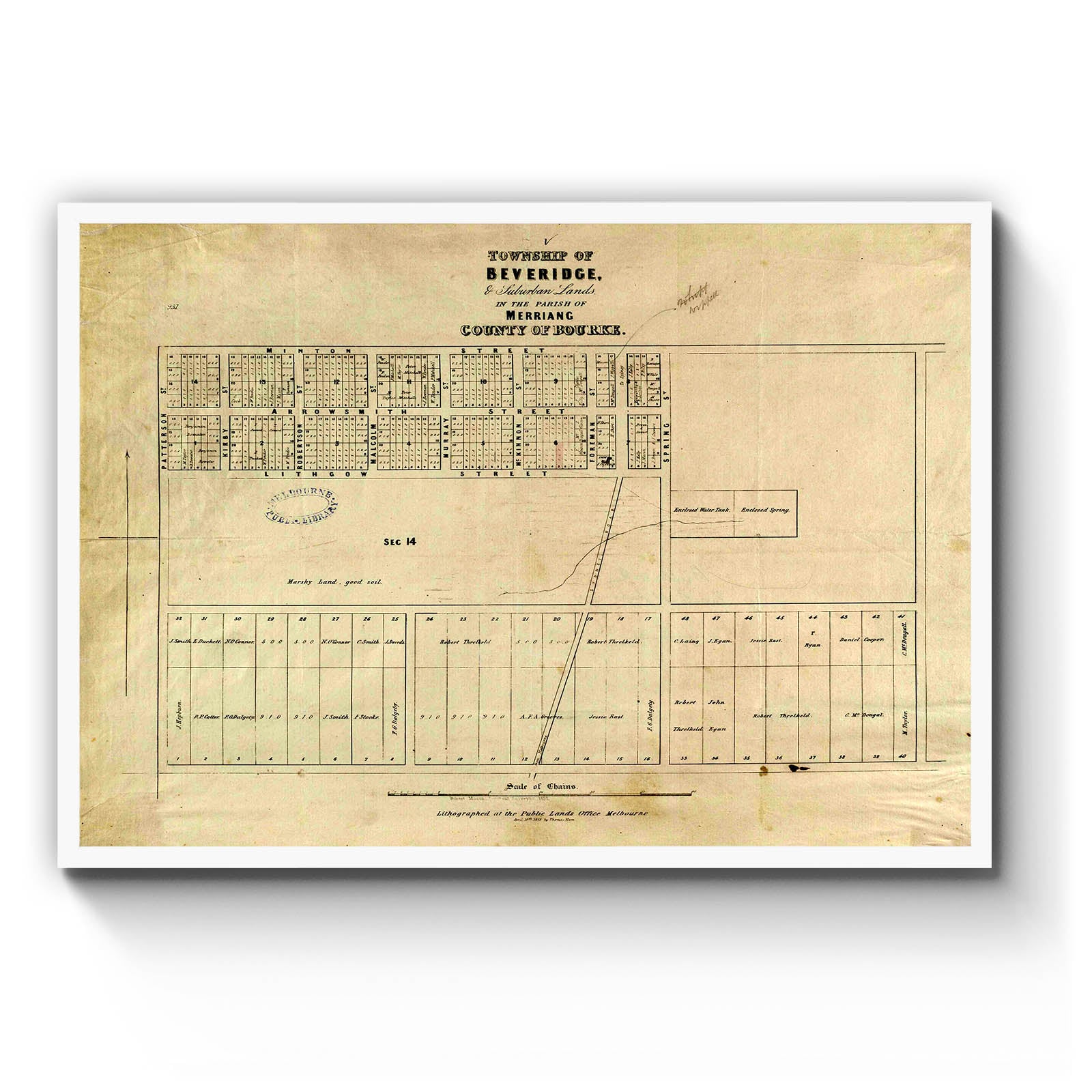 Section 14 is not subdivided.; "Robert Mason, assistant surveyor 1852. Lithographed at the Public Lands Office Melbourne April 10th, 1858 by Thomas Ham."