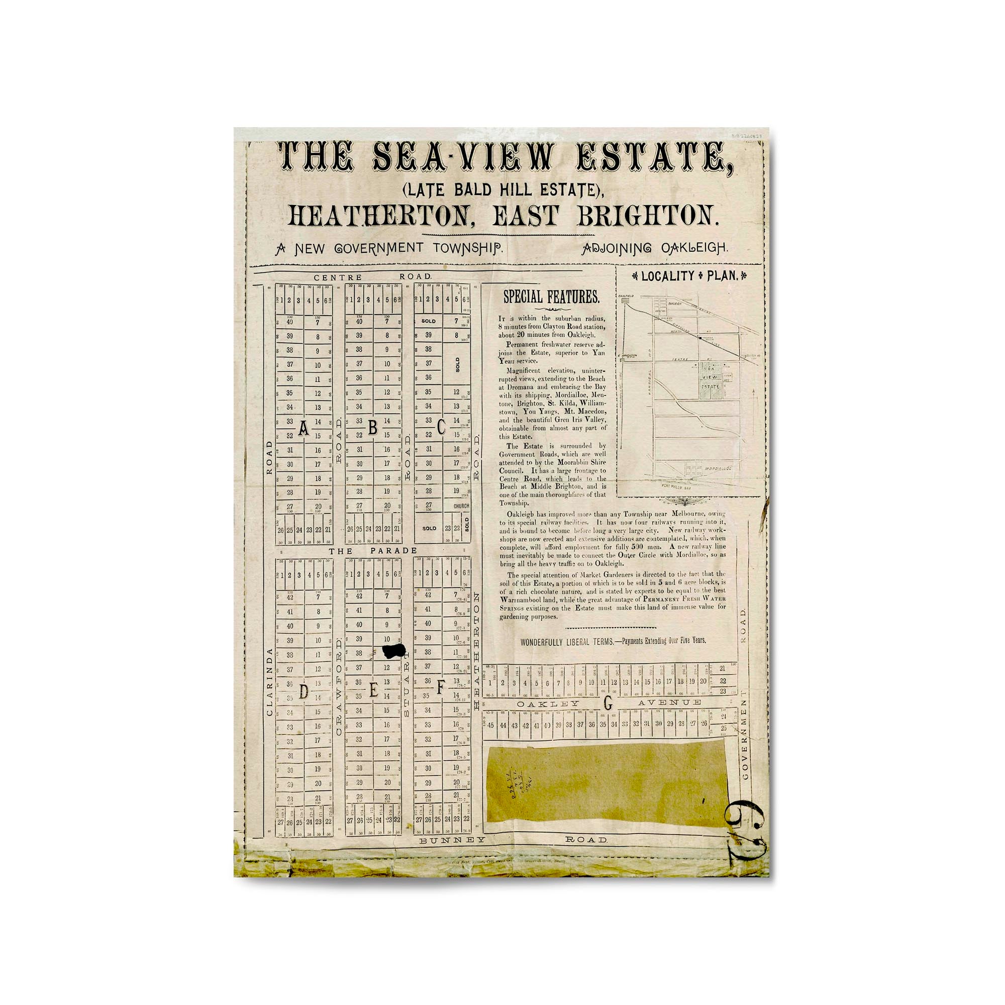The Sea-View Estate (Late Bald Hill Estate), Heatherton, East Brighton: a new government township adjoining Oakleigh. 1880(?)
