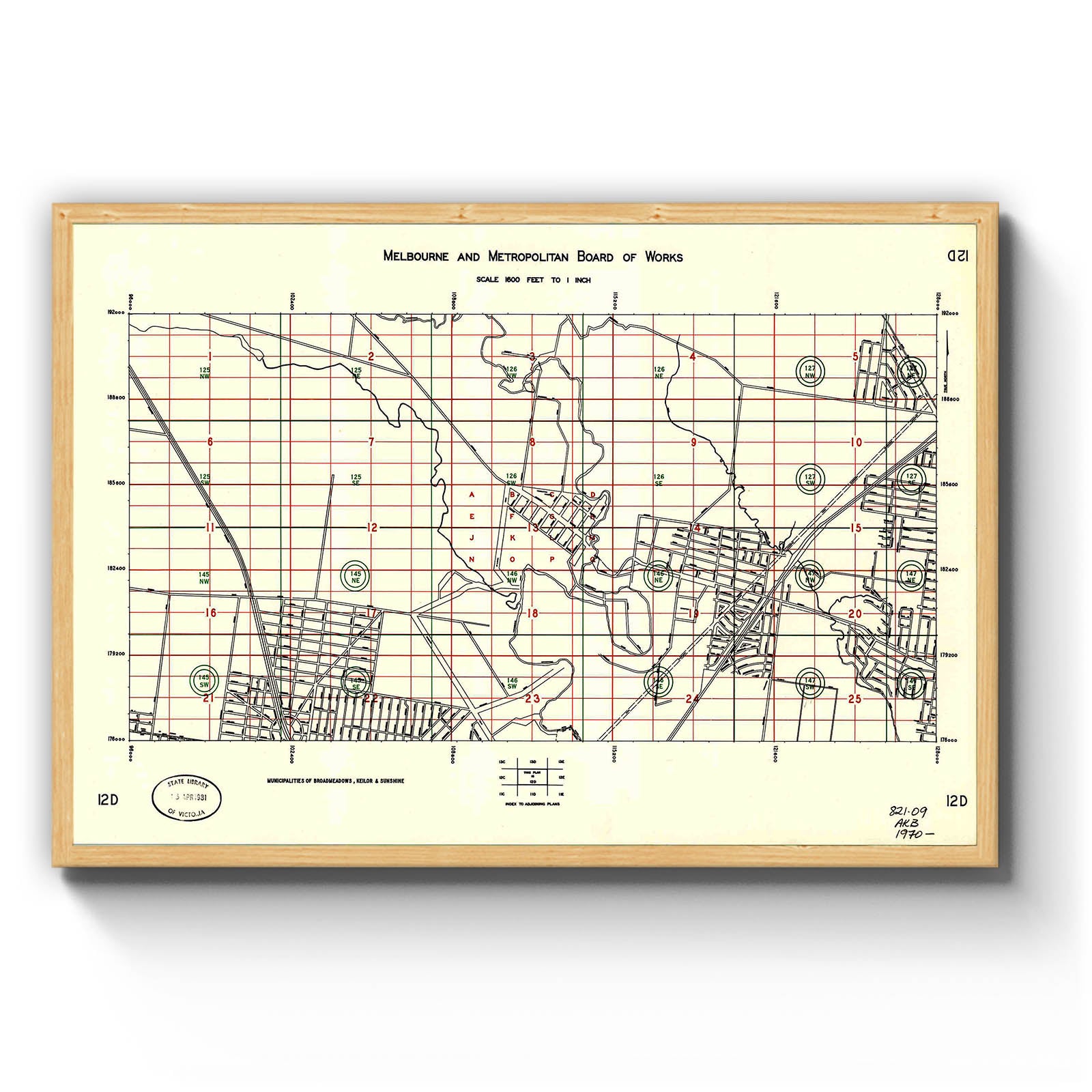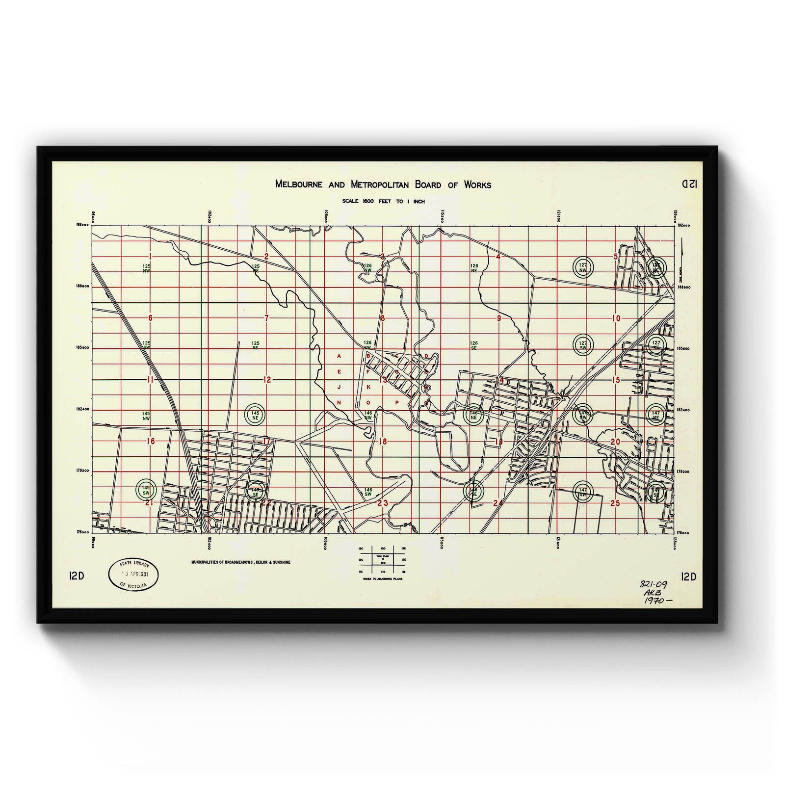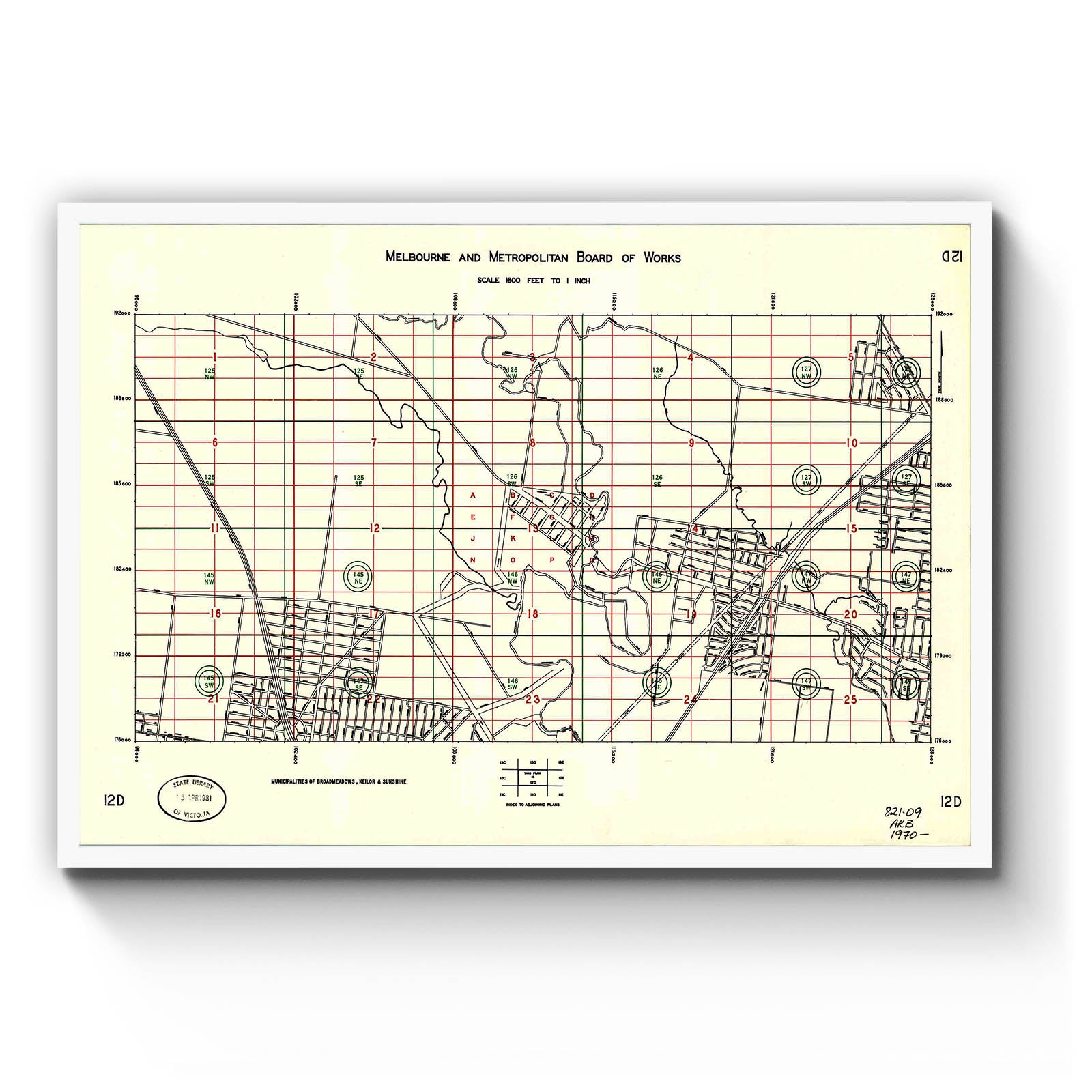 Melbourne and Metropolitan Board of Works, scale 1600 feet to 1 inch [index plan]. 12D, Municipalities of Broadmeadows, Keilor & Sunshine [cartographic material]. [196-]