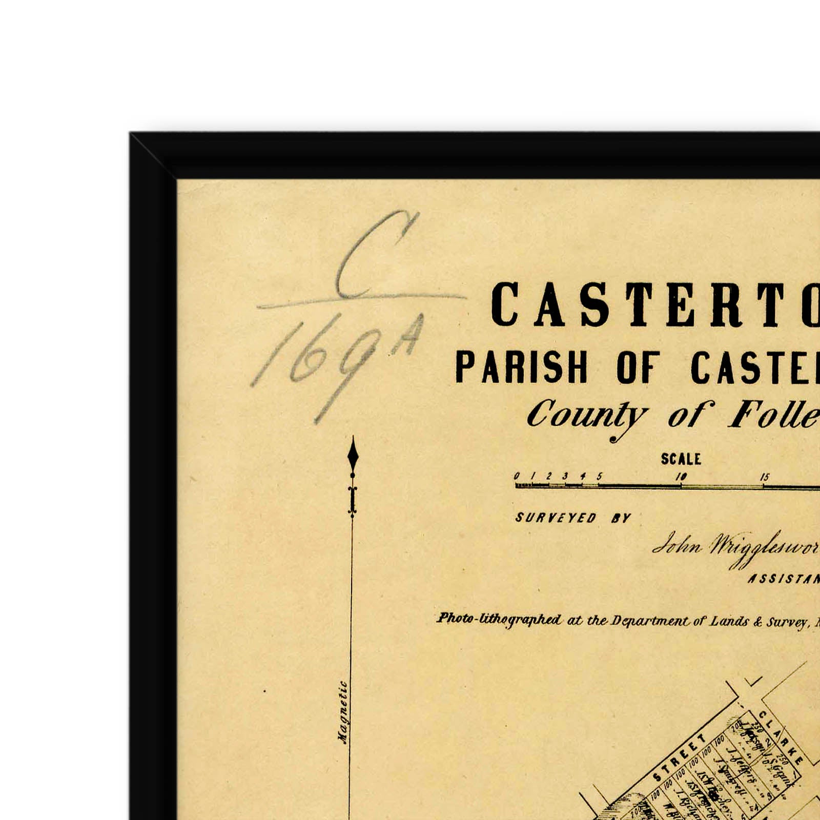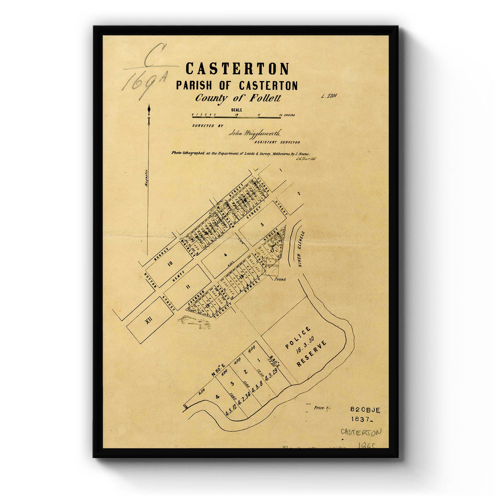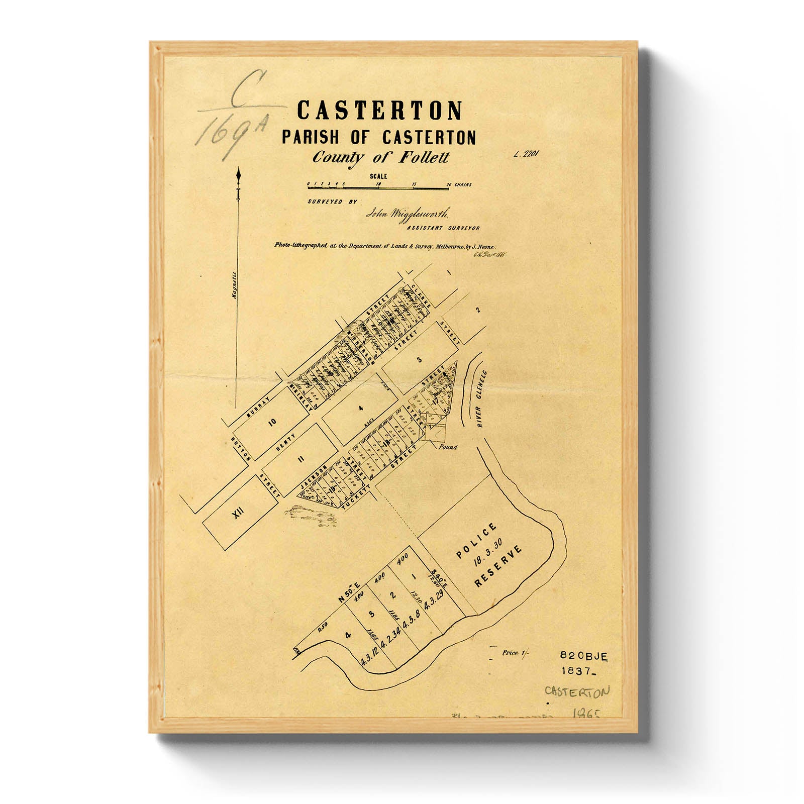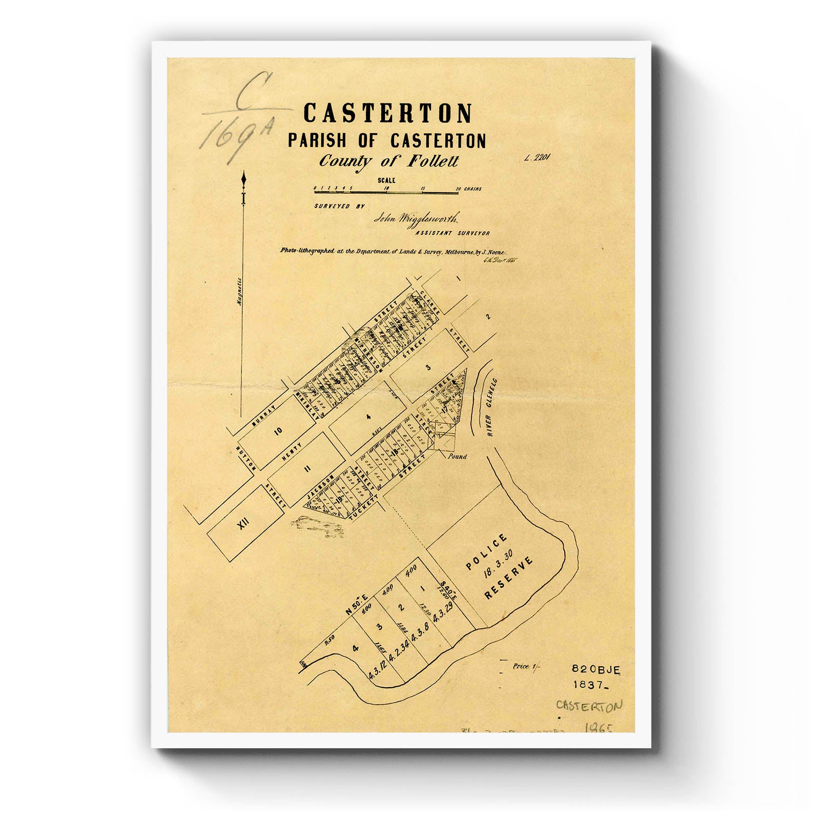Casterton, Parish of Casterton, County of Follett [cartographic material] / surveyed by John Wrigglesworth, Assistant Surveyor; photo-lithographed at the Department of Lands and Survey, Melbourne by J. Noone. 1865.