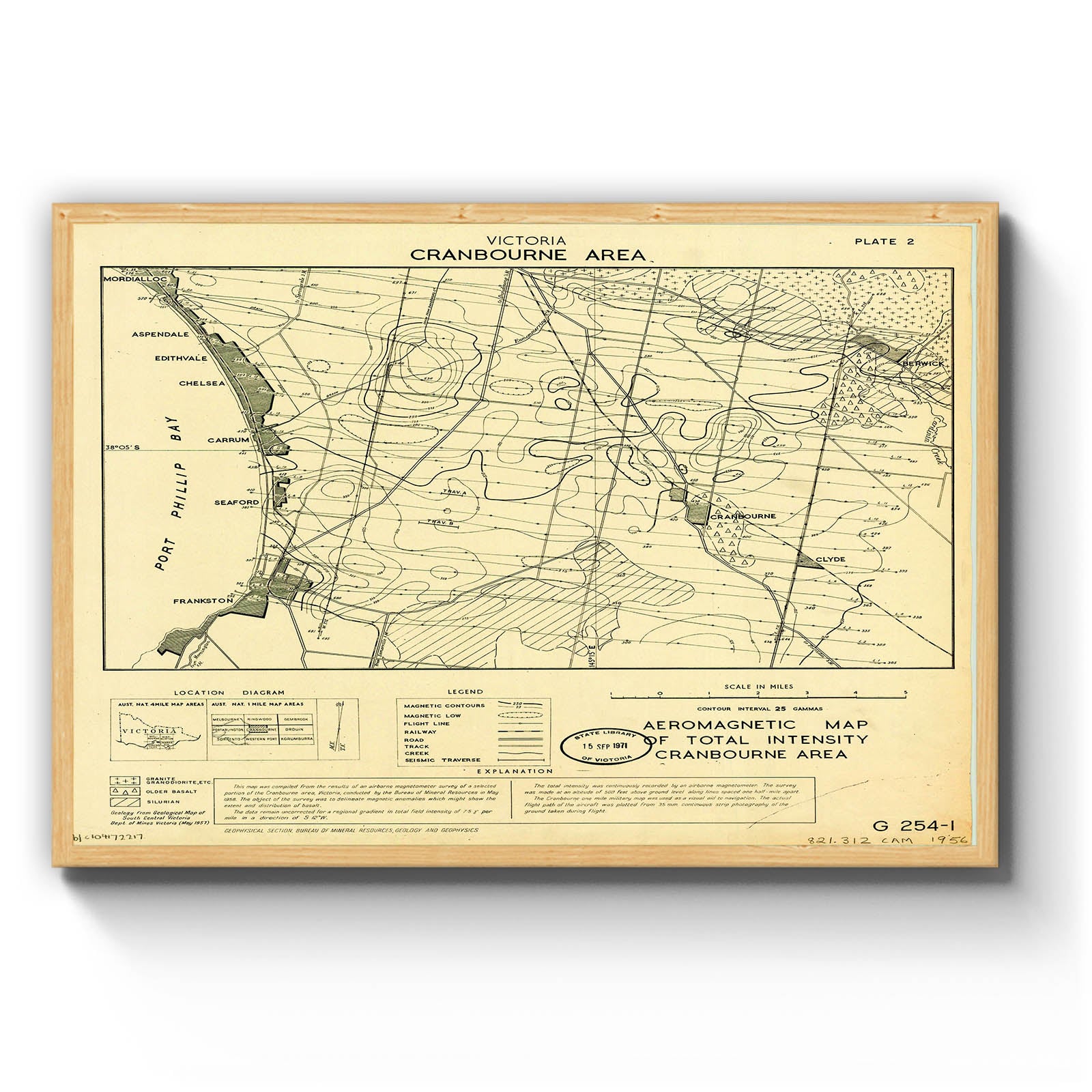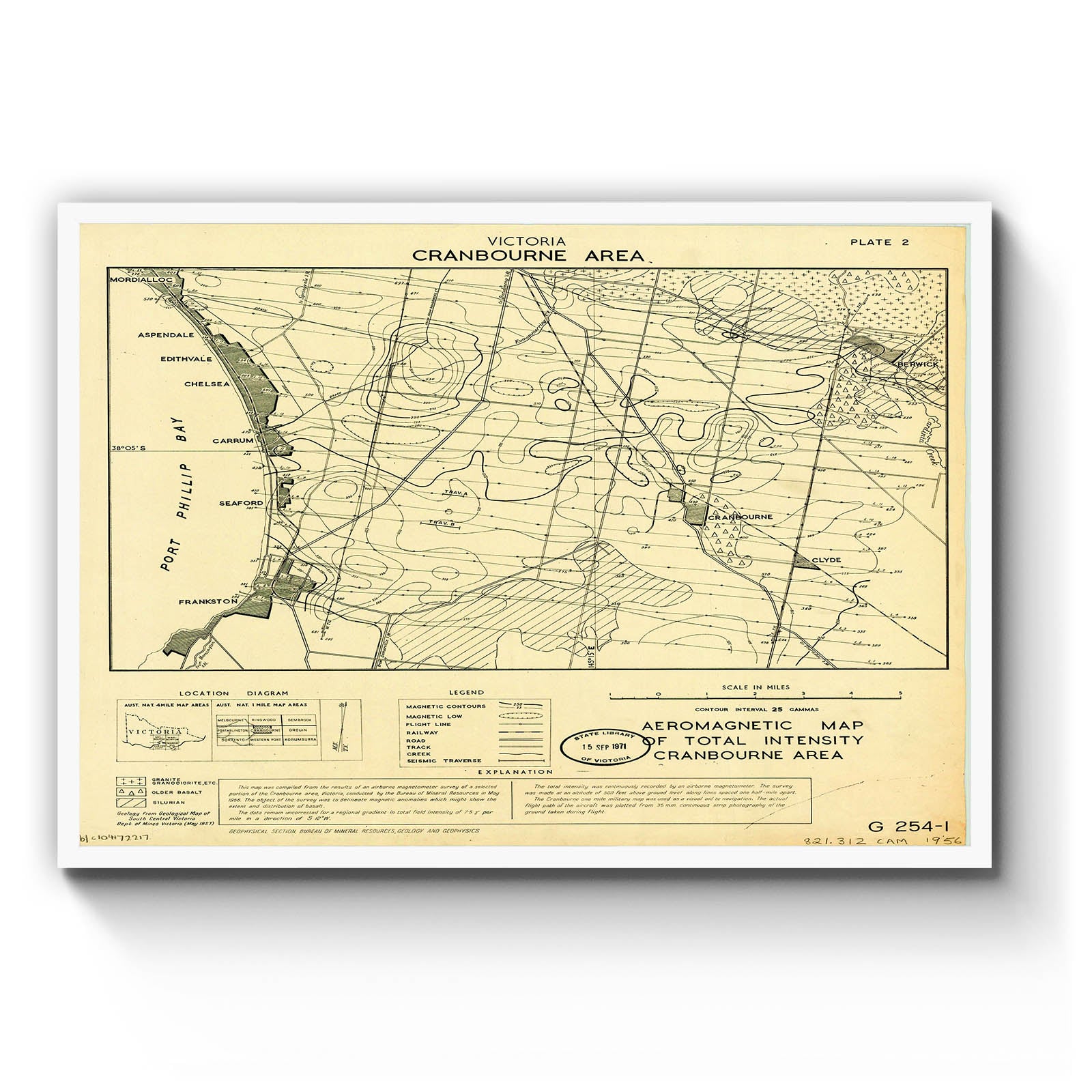 Victoria, Cranbourne area. Plate 2. Aeromagnetic map of total intensity, Cranbourne area [cartographic material] / Geophysical Section, Bureau of Mineral Resources, Geology and Geophysics.
