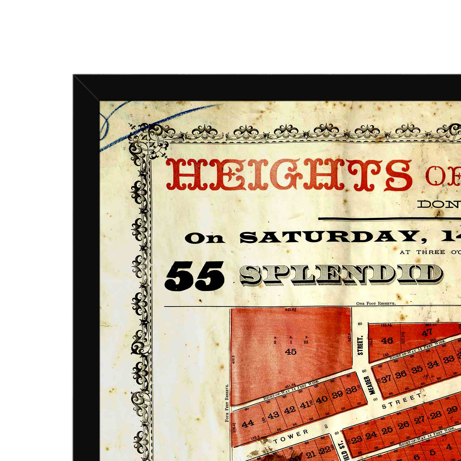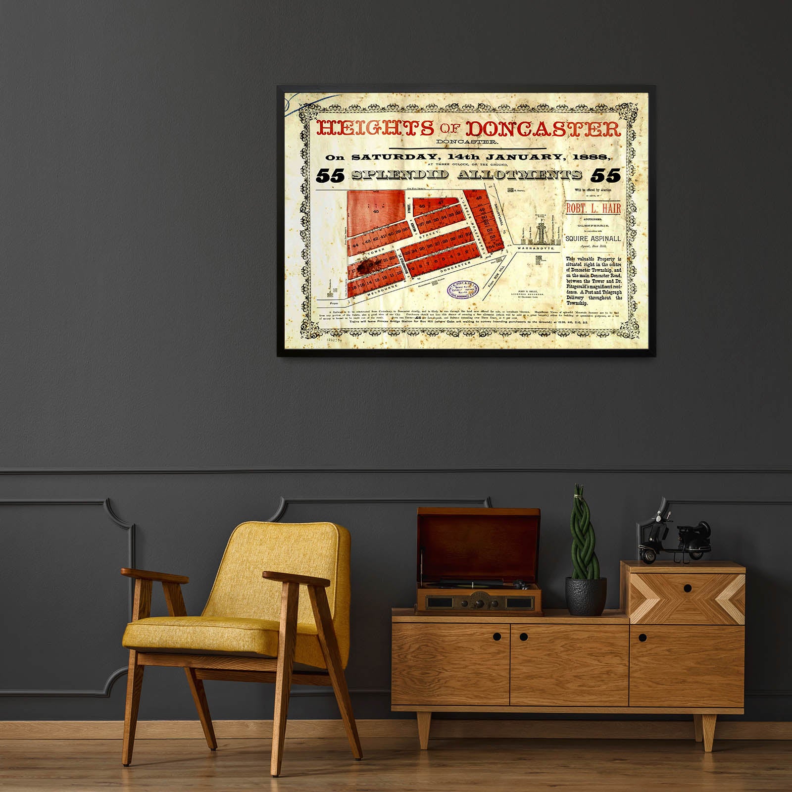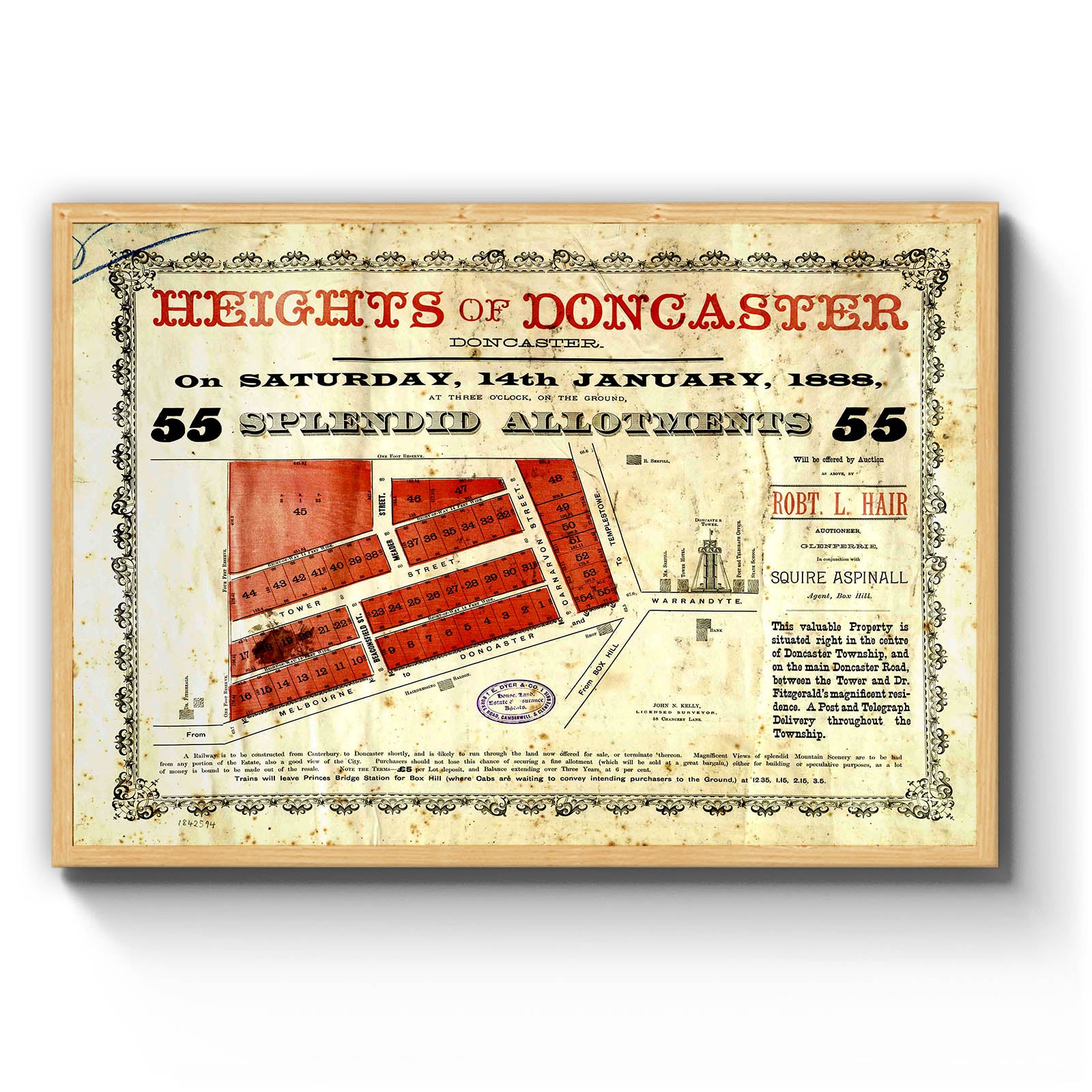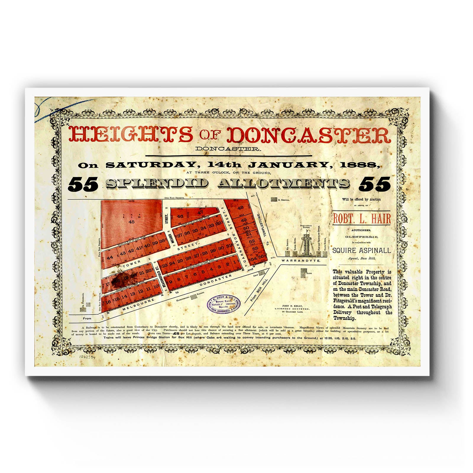 Heights of Doncaster [cartographic material]. 1888 "On Saturday, 14th January, 1888, at three o'clock, on the ground, 55 splendid allotments will be offered by auction".;